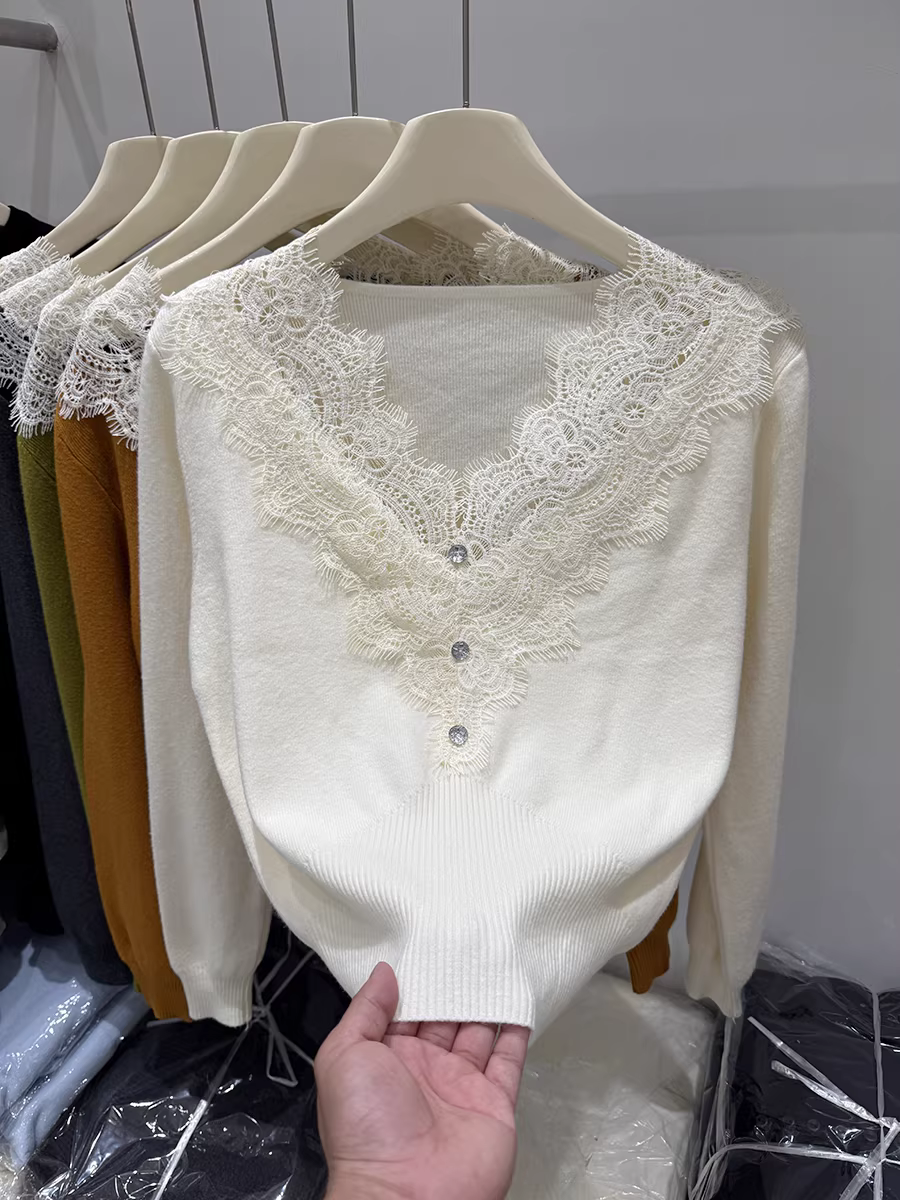 Quần áo nữ giảm giá có thương hiệu, áo thun dệt kim cổ chữ V có ren cắt nhãn, mặc nhiều lớp, thiết kế thu đông, áo kiểu độc đáo.