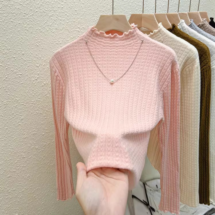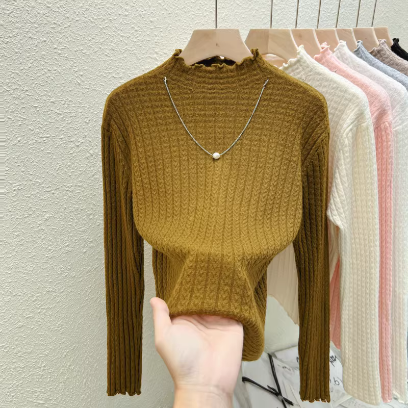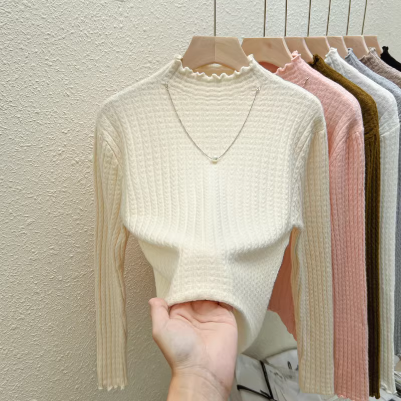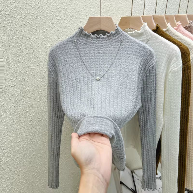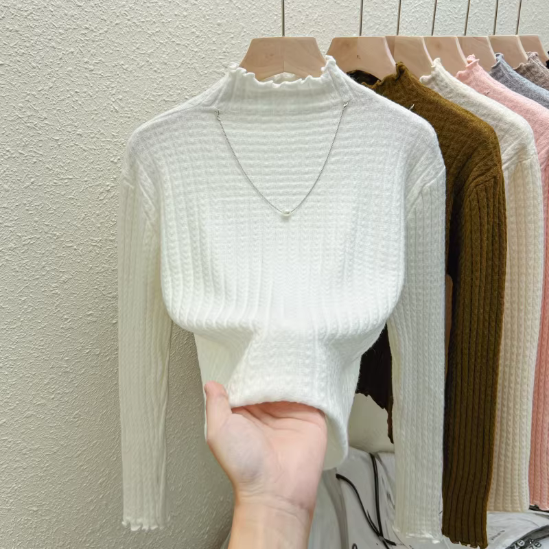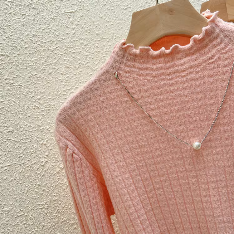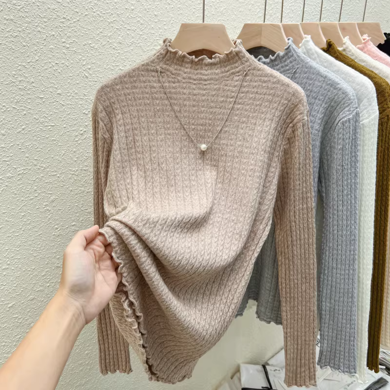 - Quần áo nữ giảm giá ngoại thương, áo thun dệt kim cổ nửa cao, có nhãn cắt, mặc trong mùa thu đông, giảm tuổi tác, kiểu dáng thời trang, viền xếp ly, hợp xu hướng.