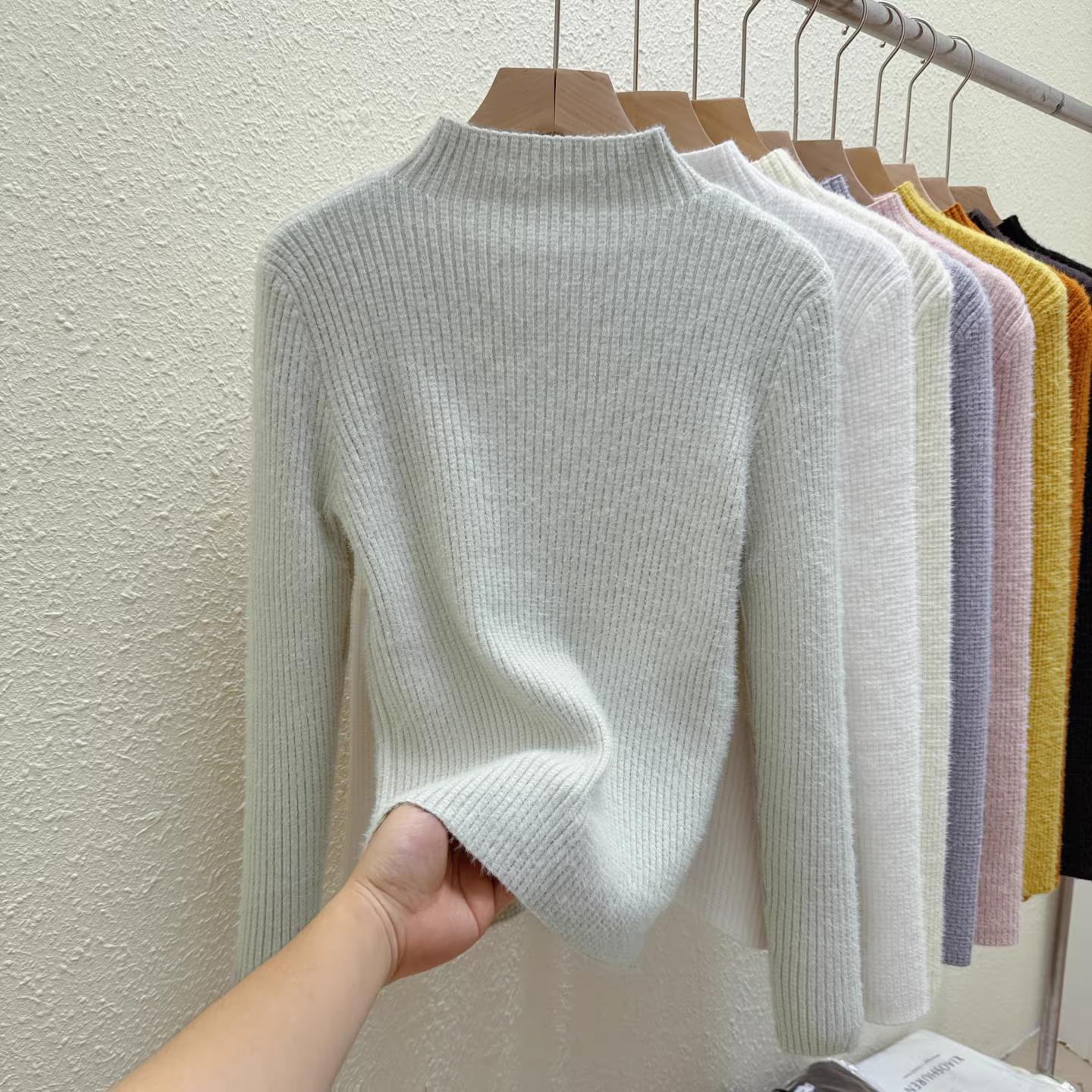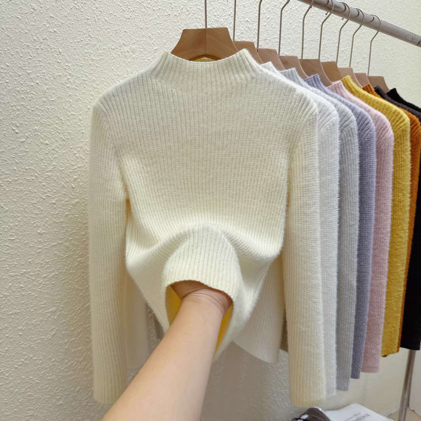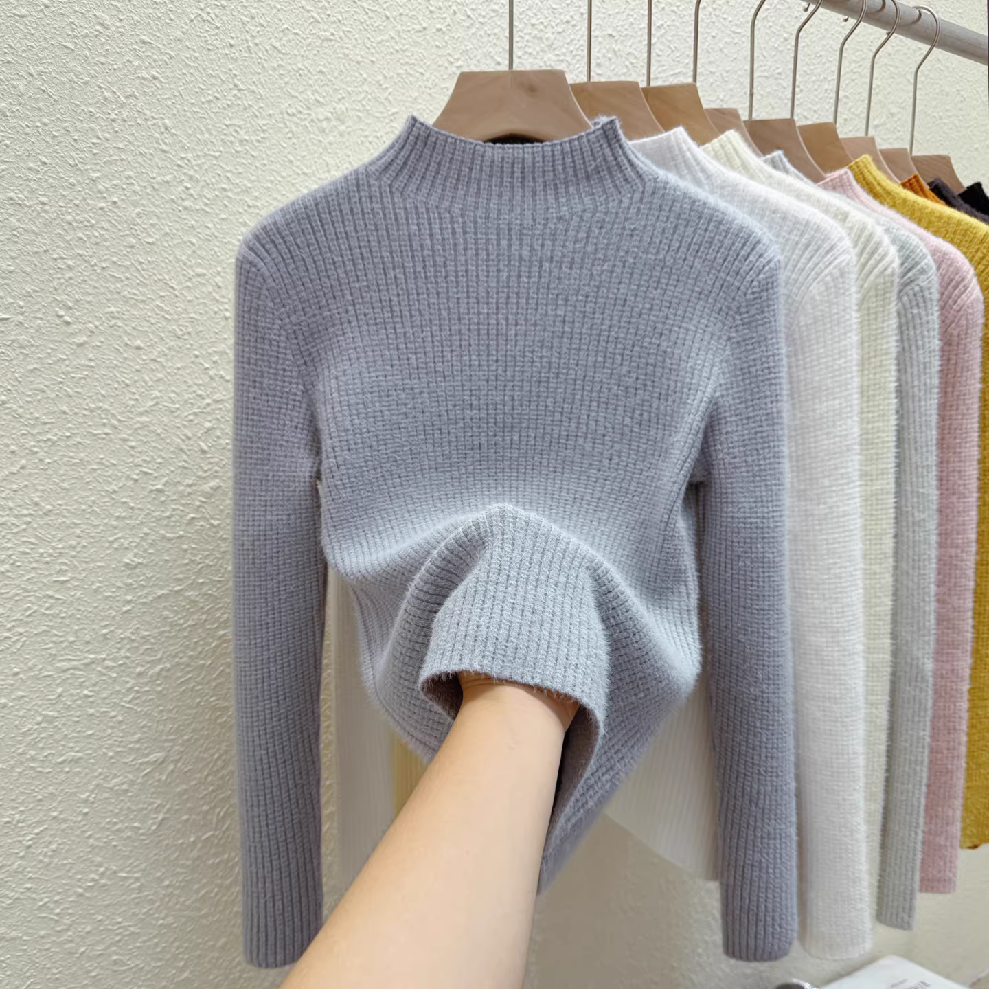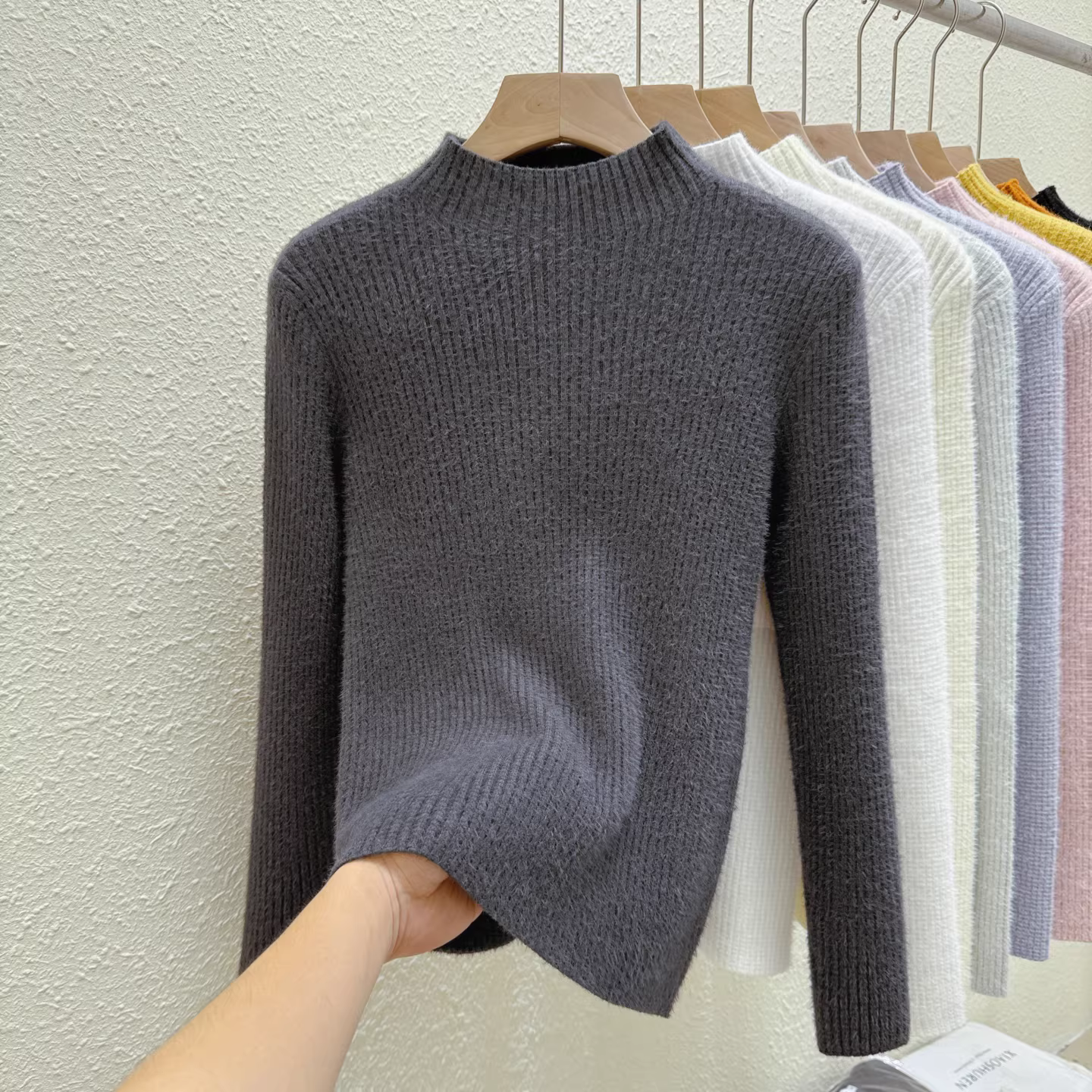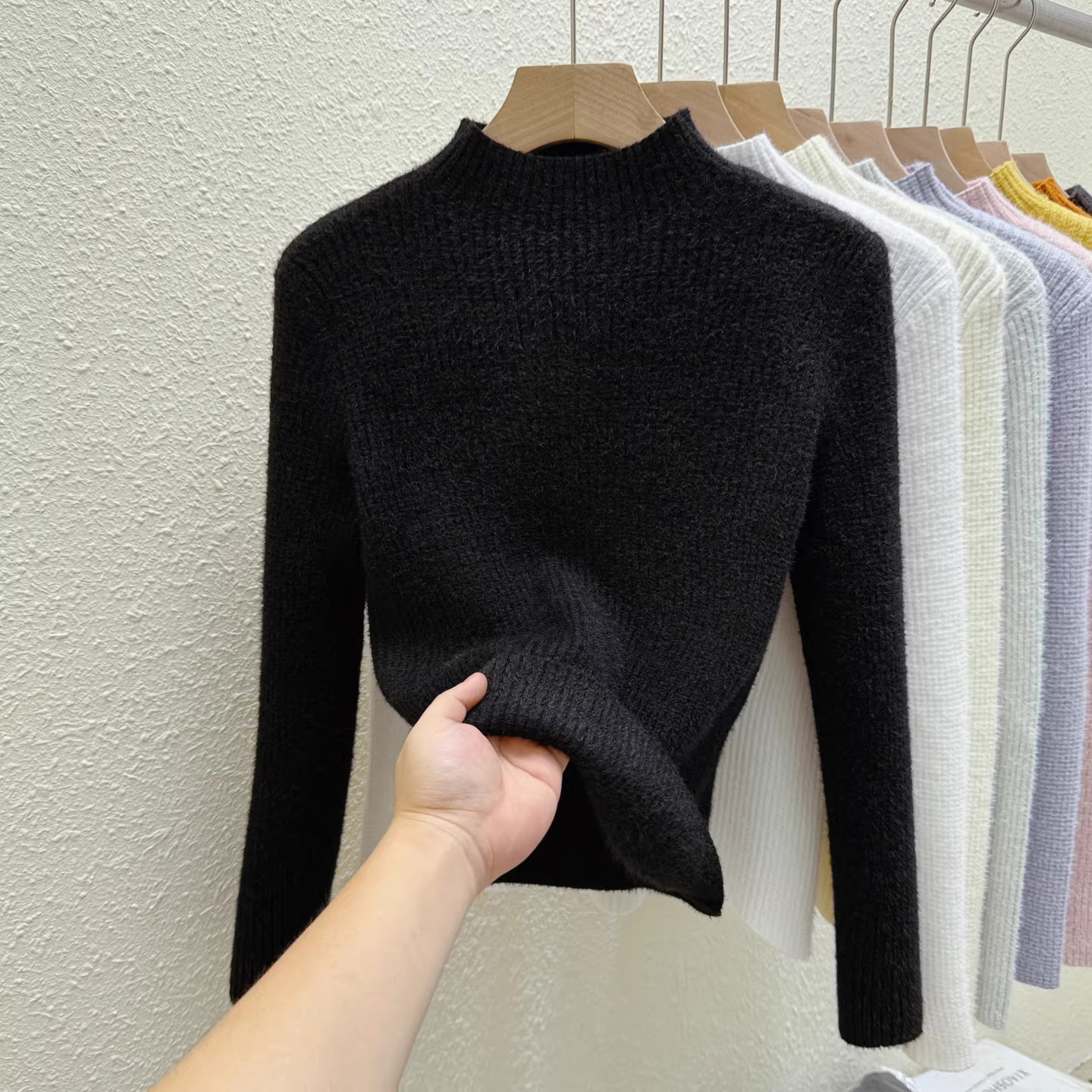 - Quần áo nữ giảm giá theo thương hiệu, áo sơ mi dệt kim có cổ nửa cao tích hợp lông cừu, mặc bên trong mùa thu đông, áo màu trơn hợp thời trang giúp giảm béo.