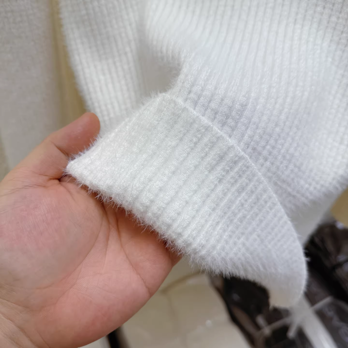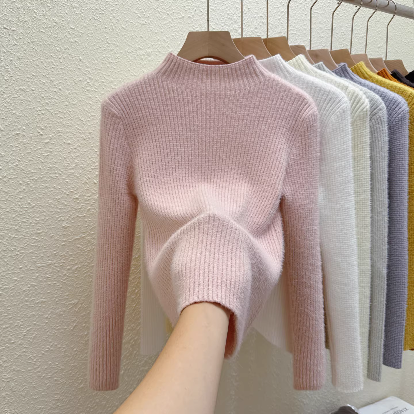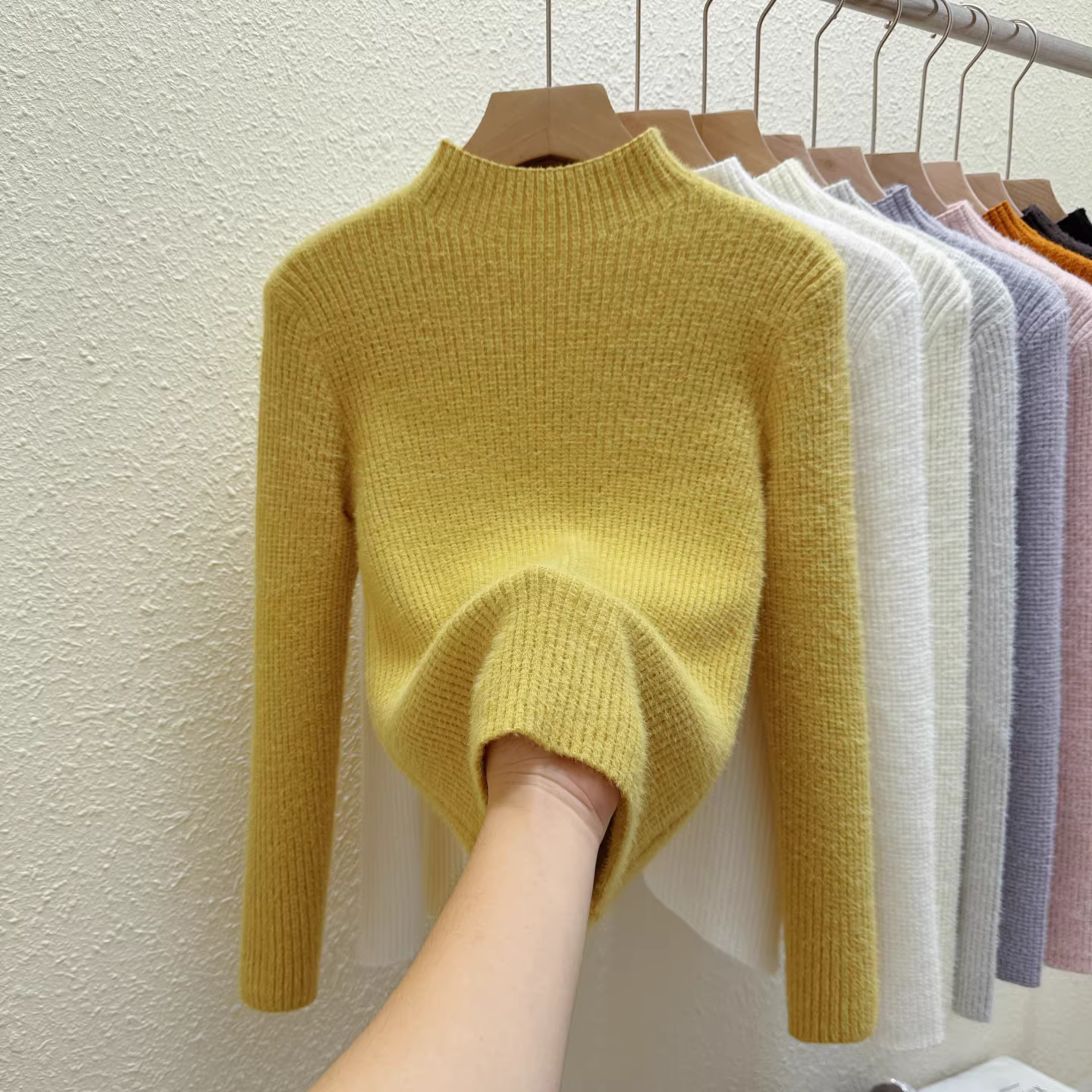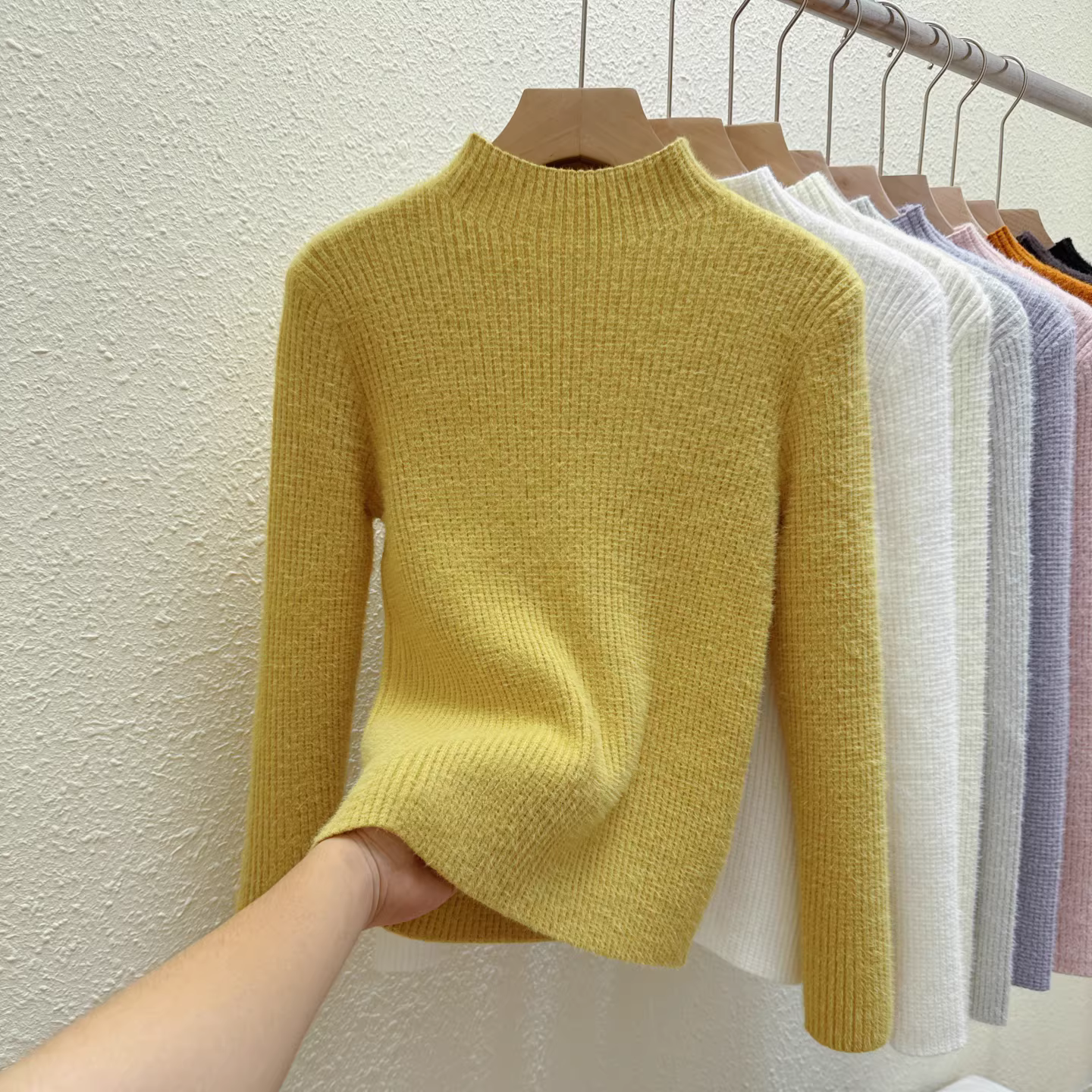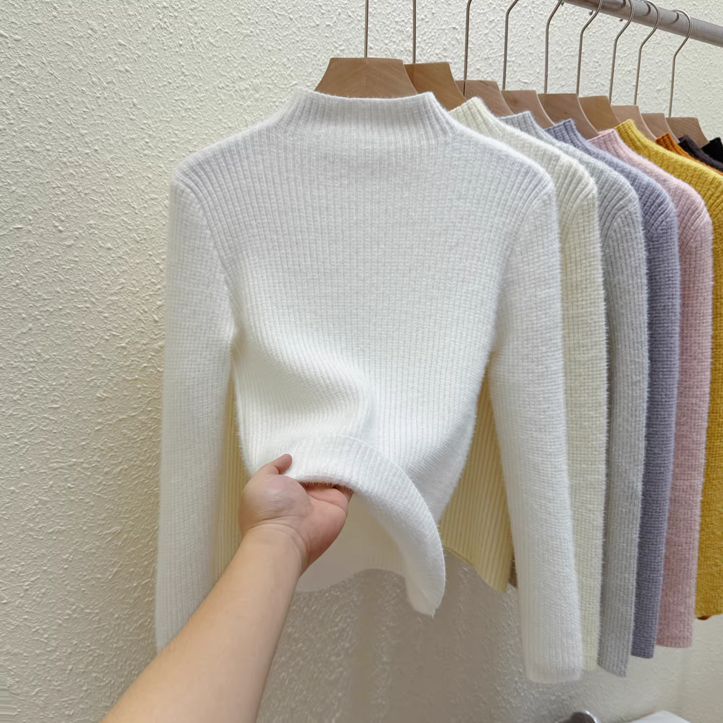- Quần áo nữ giảm giá theo thương hiệu, áo sơ mi dệt kim có cổ nửa cao tích hợp lông cừu, mặc bên trong mùa thu đông, áo màu trơn hợp thời trang giúp giảm béo.