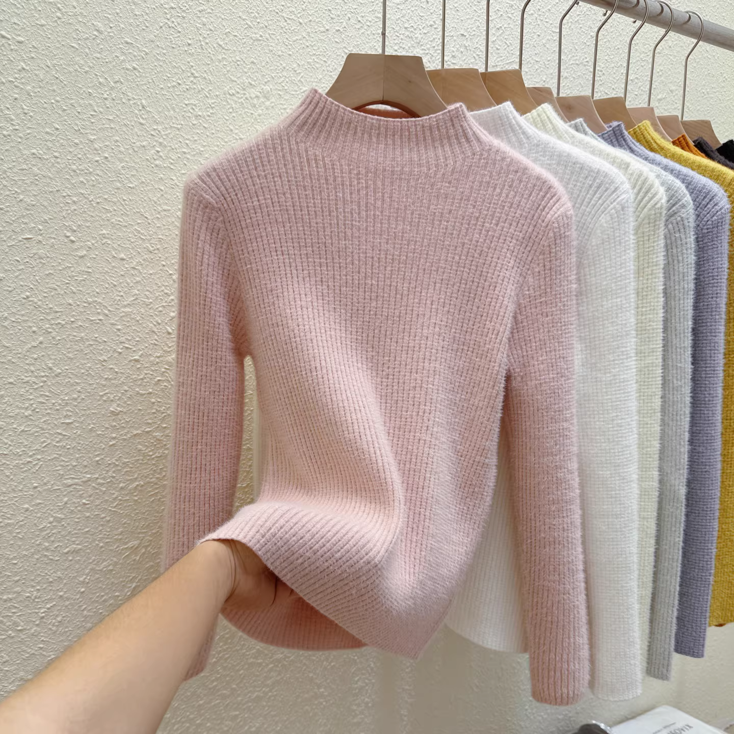 Quần áo nữ giảm giá theo thương hiệu, áo sơ mi dệt kim có cổ nửa cao tích hợp lông cừu, mặc bên trong mùa thu đông, áo màu trơn hợp thời trang giúp giảm béo.