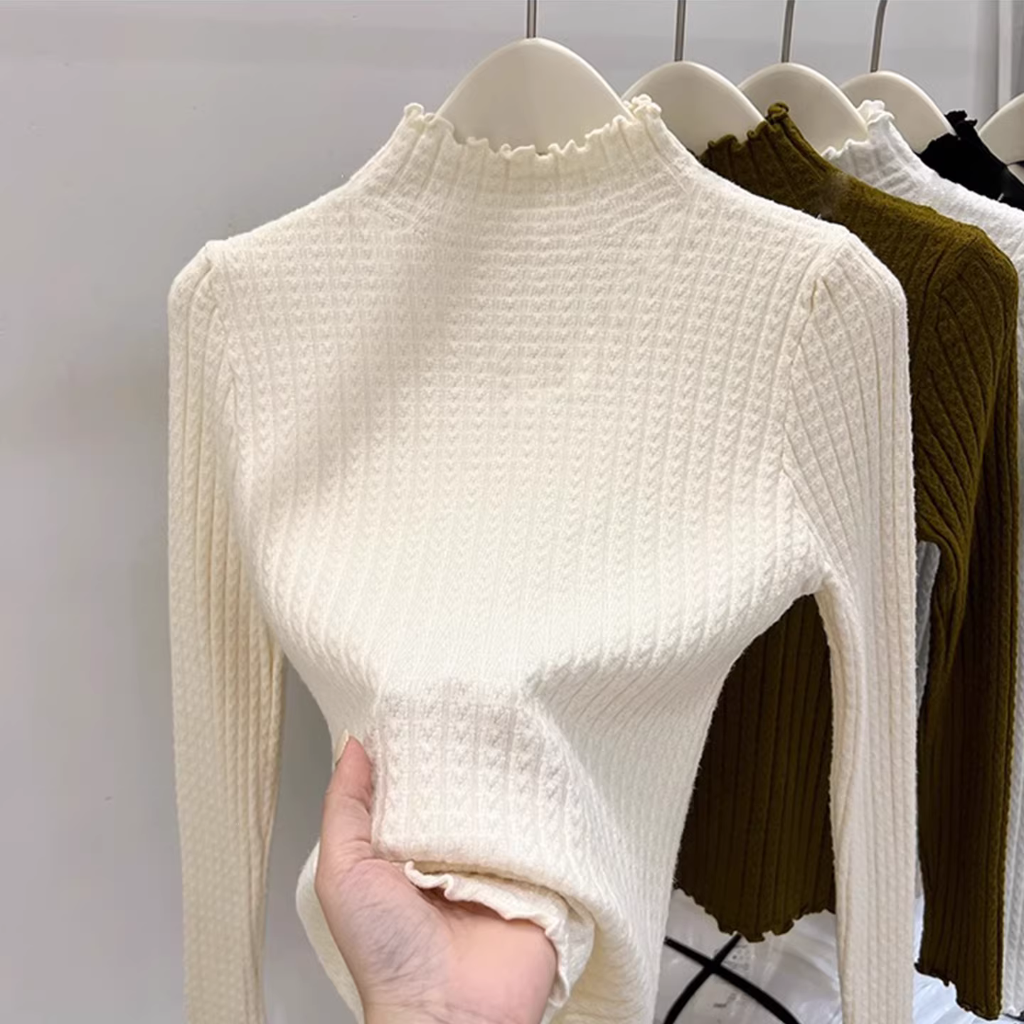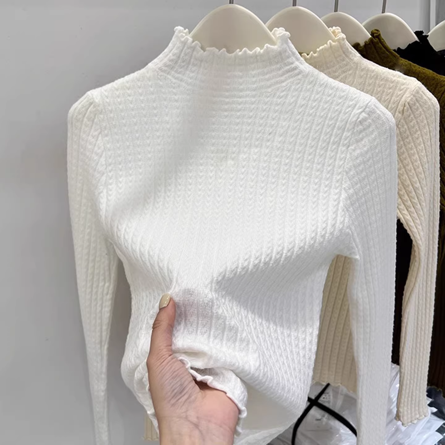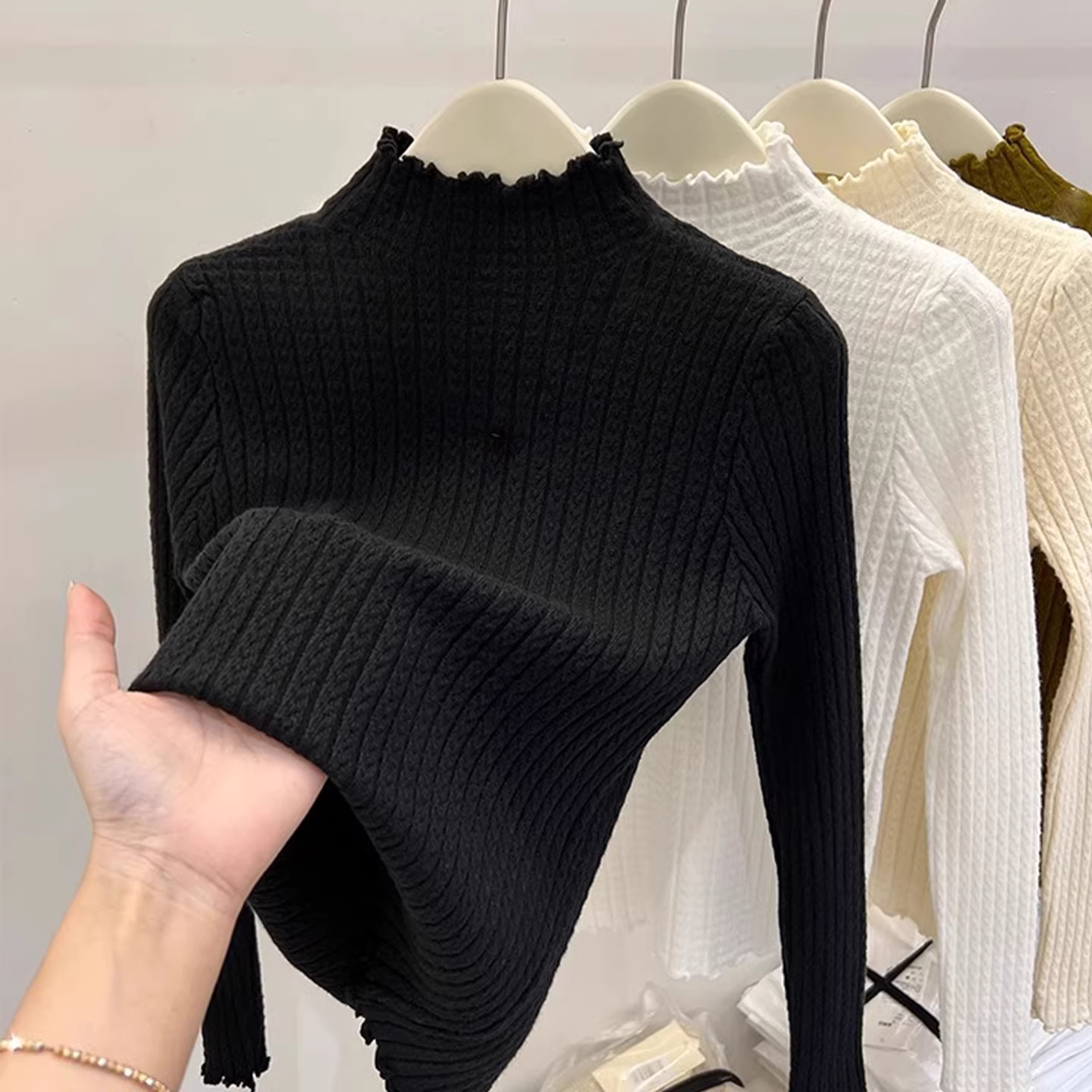 Quần áo nữ phong cách châu Âu Nanyou có nhãn cắt, viền xếp nếp, cổ cao nửa cổ, áo dệt kim cơ bản cho mùa thu đông, áo len ôm dáng, hợp thời trang.