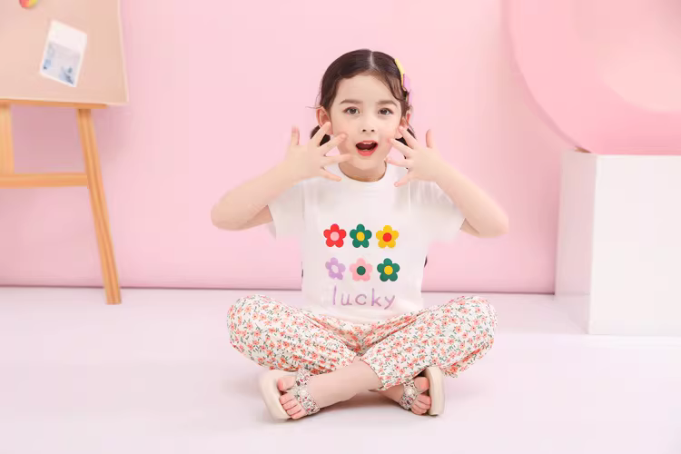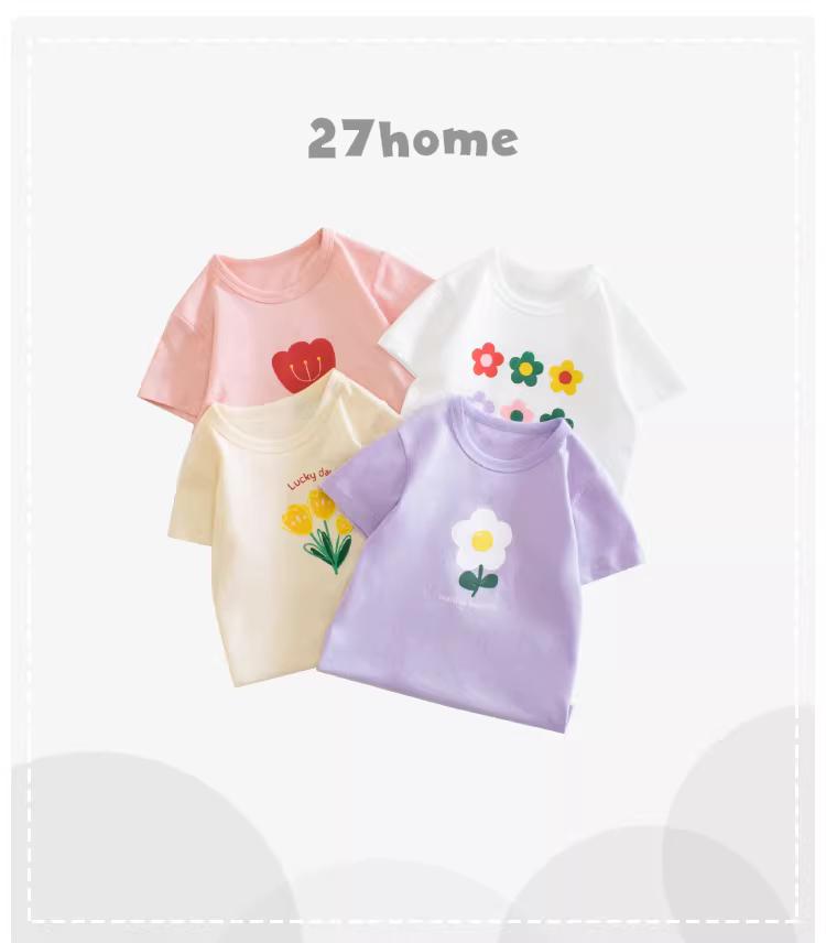 - Quần áo trẻ em, áo thun ngắn tay bé gái mùa hè 2025, kiểu dáng dễ thương, in hoa, chất liệu cotton nguyên chất, cổ tròn