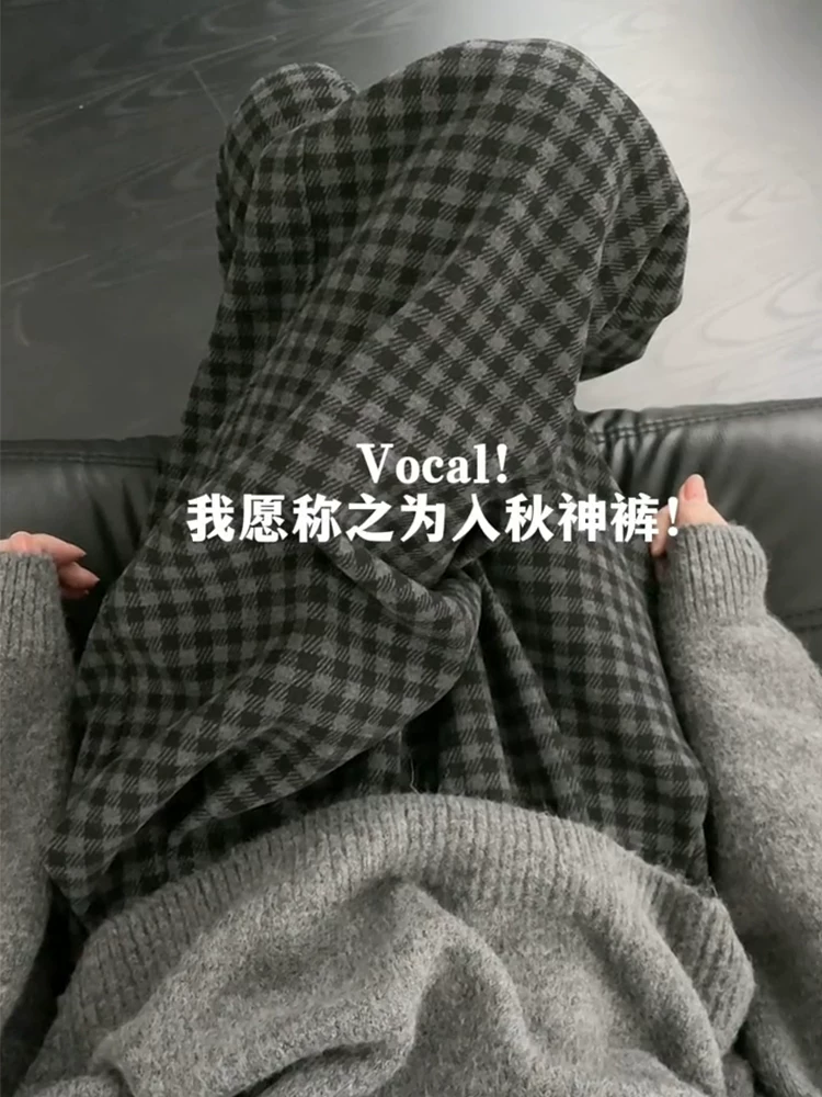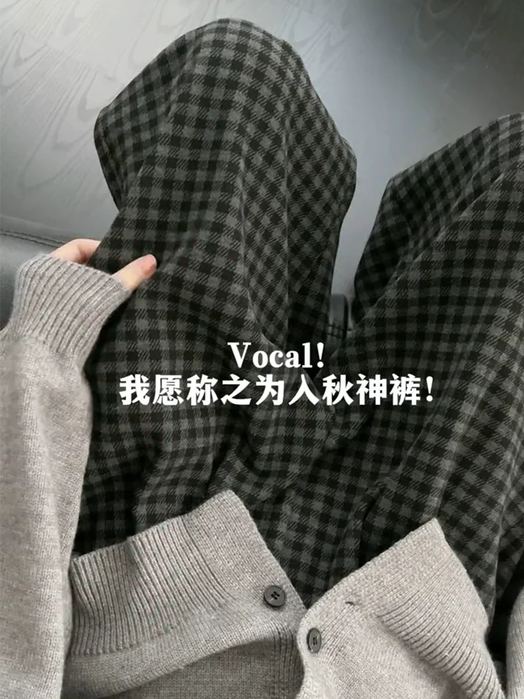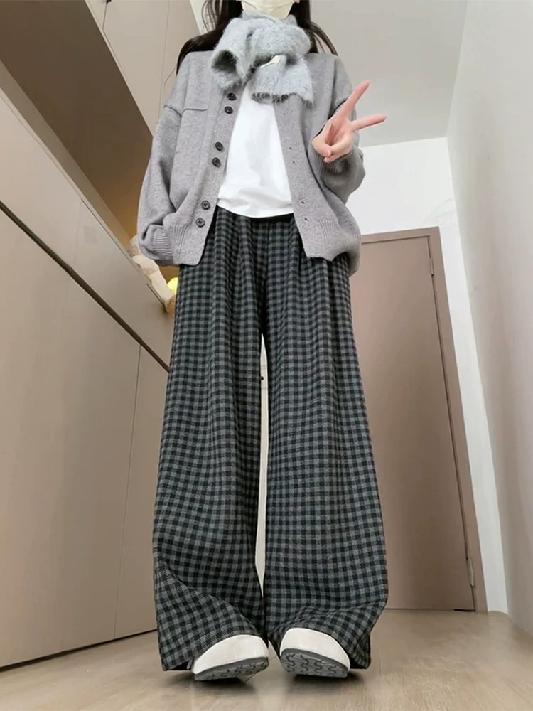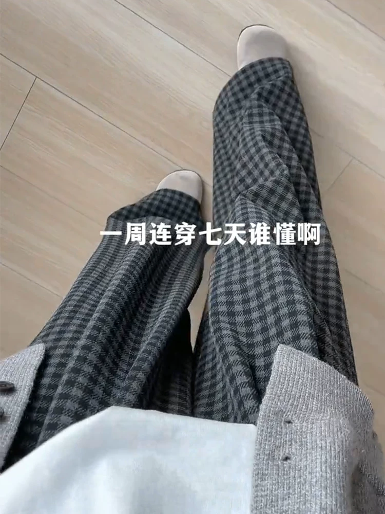 Quần âu kẻ sọc len màu đen và xám dành cho nữ, mùa thu đông, lót lông cừu, cỡ lớn, cạp cao, che hông, dáng suôn, tôn dáng, quần ống rộng.