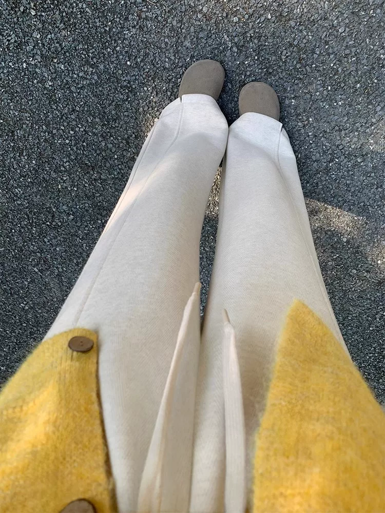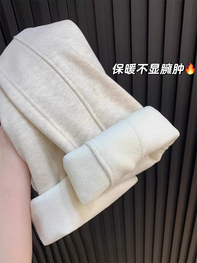 Quần âu len màu trắng nhạt dành cho nữ, cỡ lớn mùa đông, lót lông cừu, dày dặn, lưng cao, dáng rộng, suôn mềm, quần ống rộng giúp thon gọn.