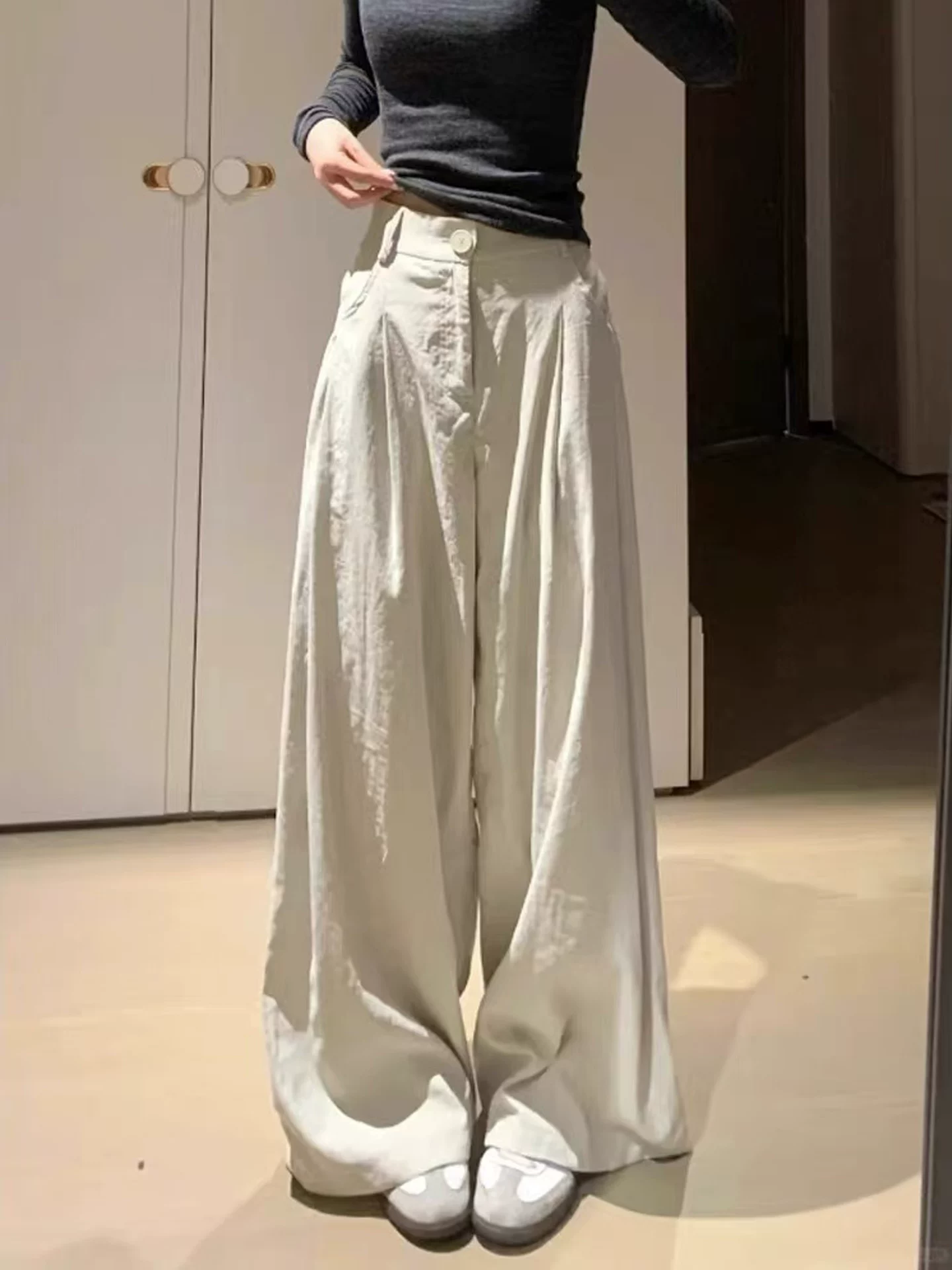 Quần âu lụa băng màu trắng sữa dành cho nữ, kiểu dáng mùa hè mới, cỡ lớn, lưng cao, dáng suôn, tôn dáng, quần Yamamoto ống rộng.