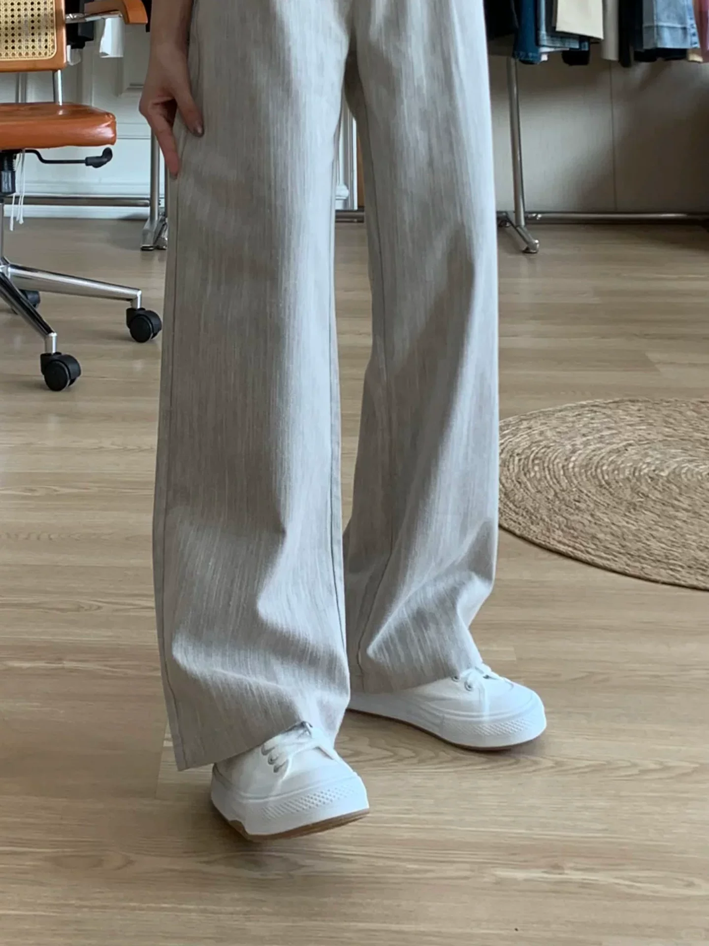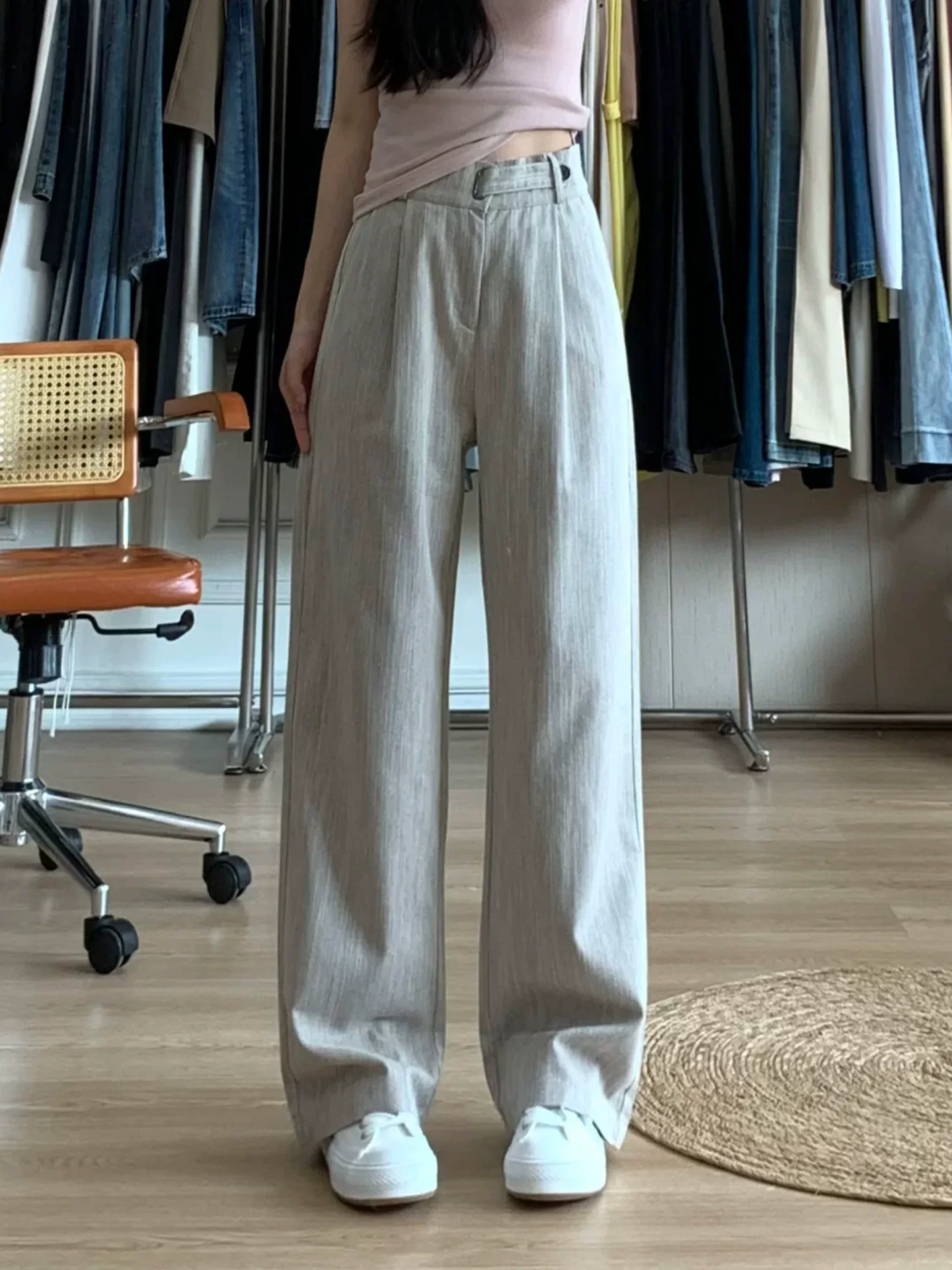 - Quần âu màu xám ống rộng dành cho nữ, kiểu dáng mỏng mùa hè, cỡ lớn, cạp cao, mềm mại, tôn dáng, quần ống đứng thẳng, kiểu dáng thường ngày.