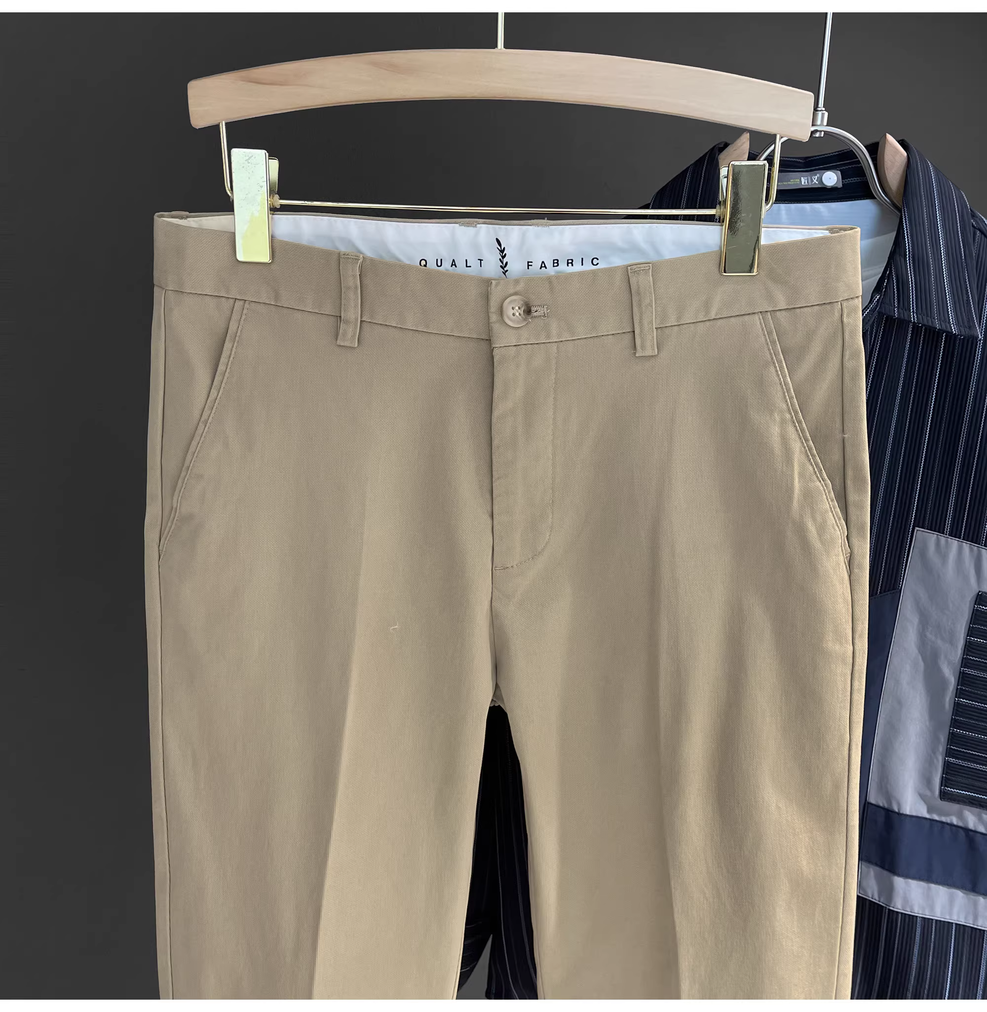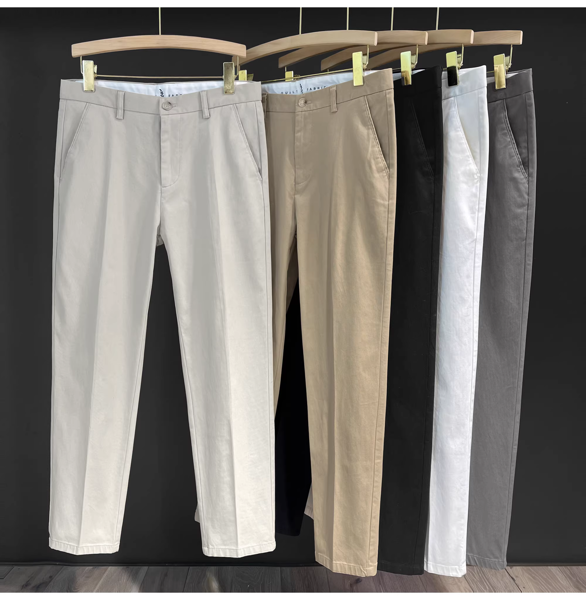 - Quần âu nam chất liệu cotton 100%, kiểu dáng Anh quốc, họa tiết sọc jacquard LUUD, màu trơn, kiểu dáng ôm vừa, đa năng, dài.