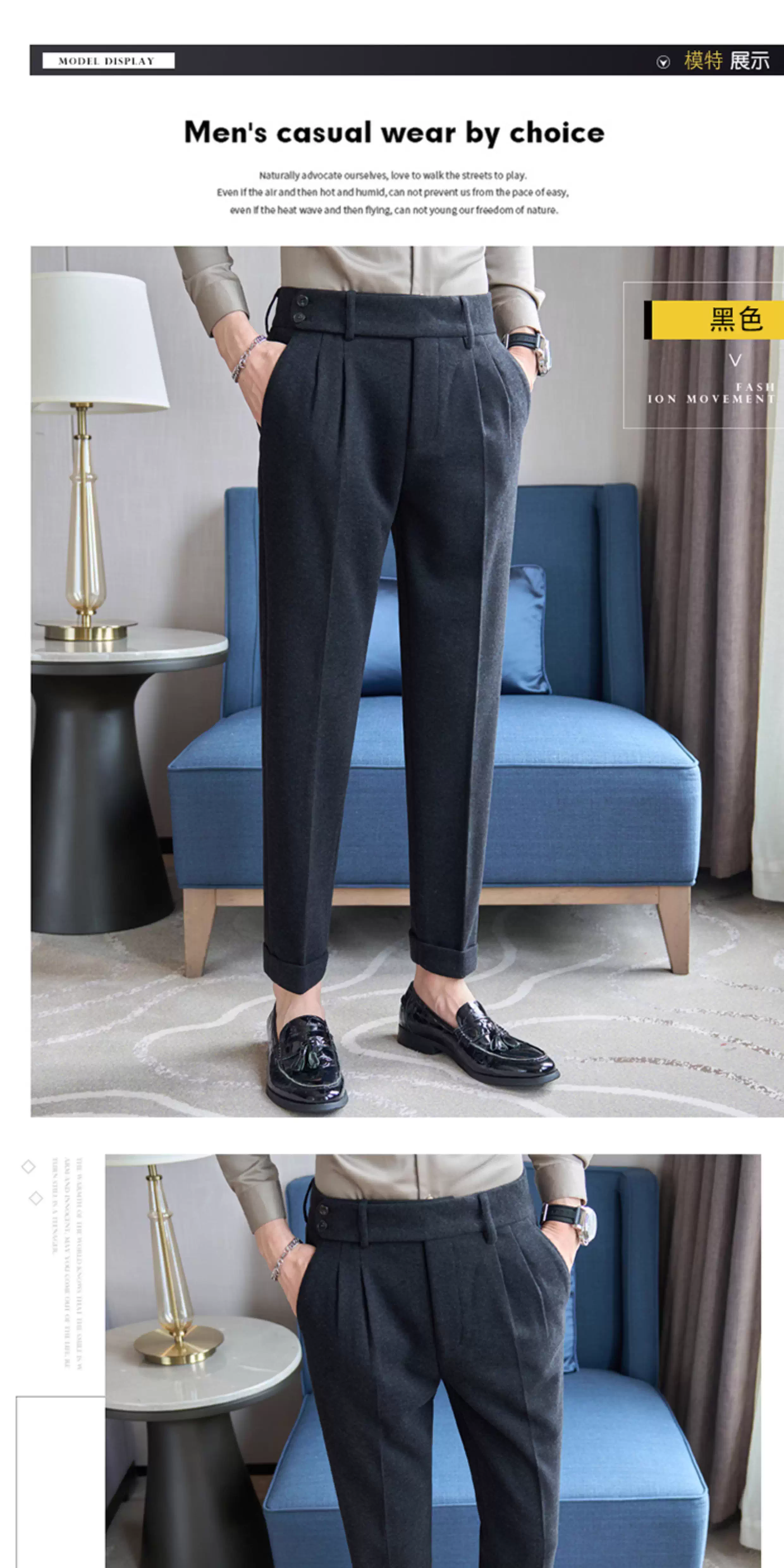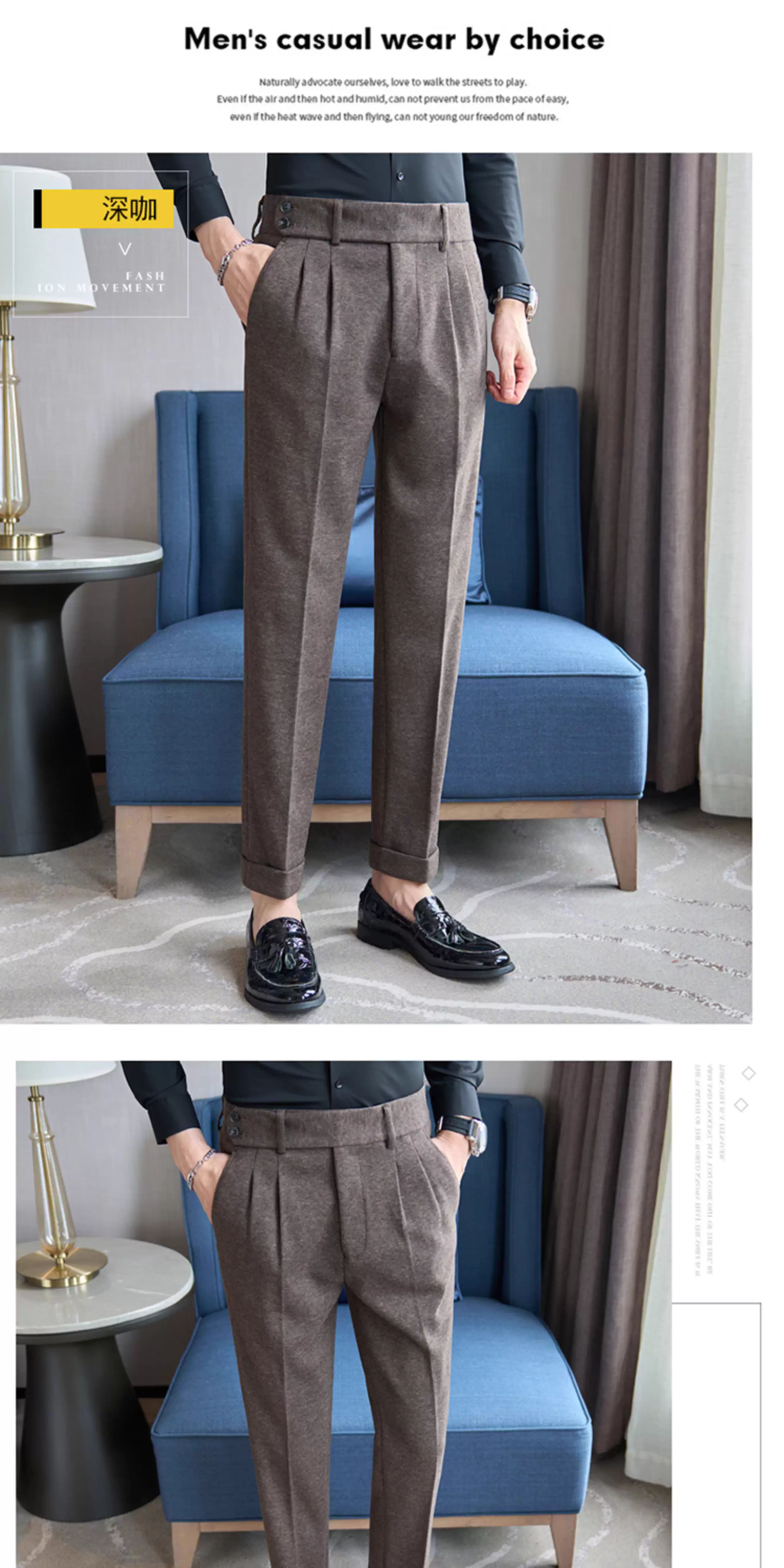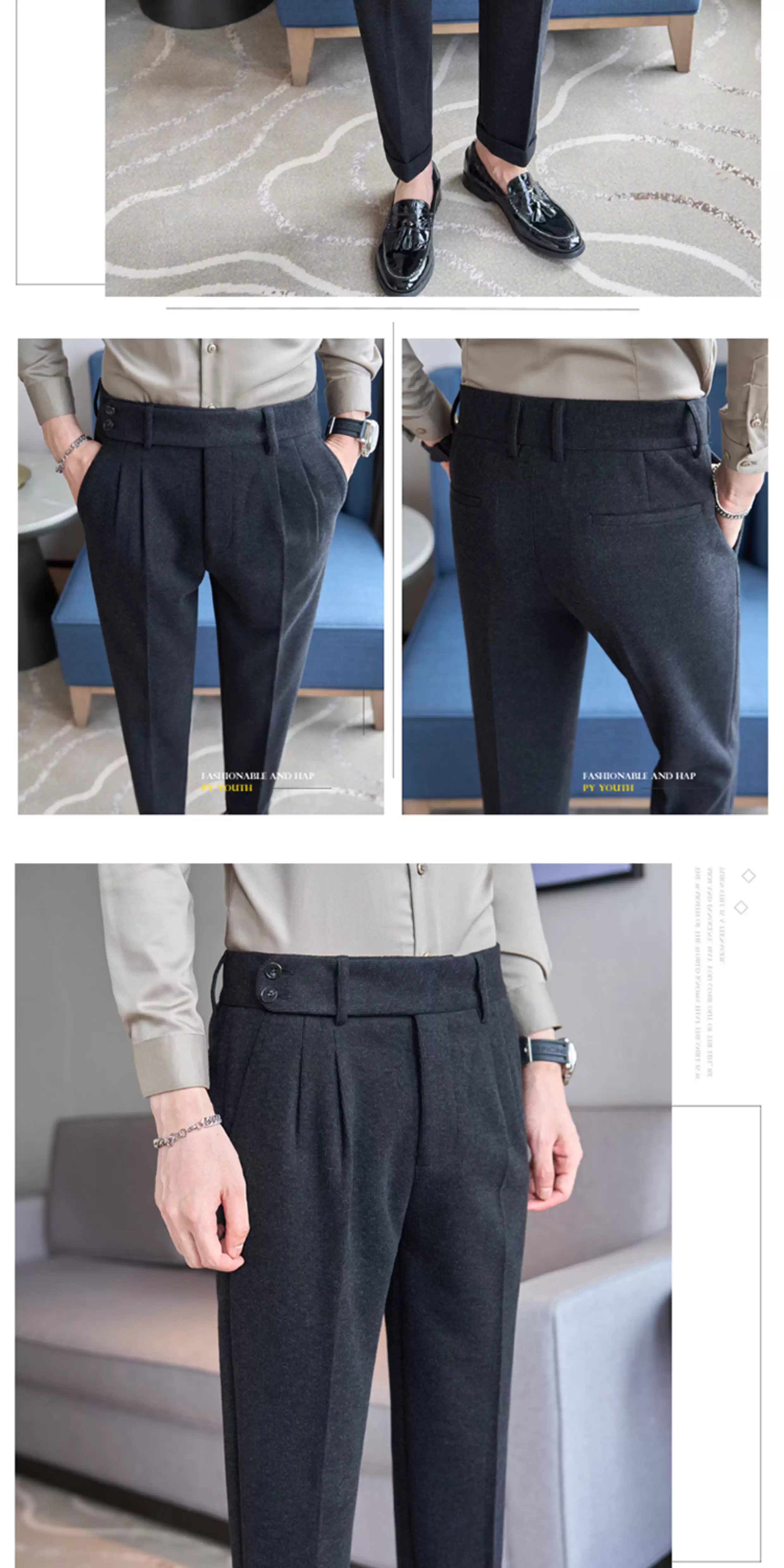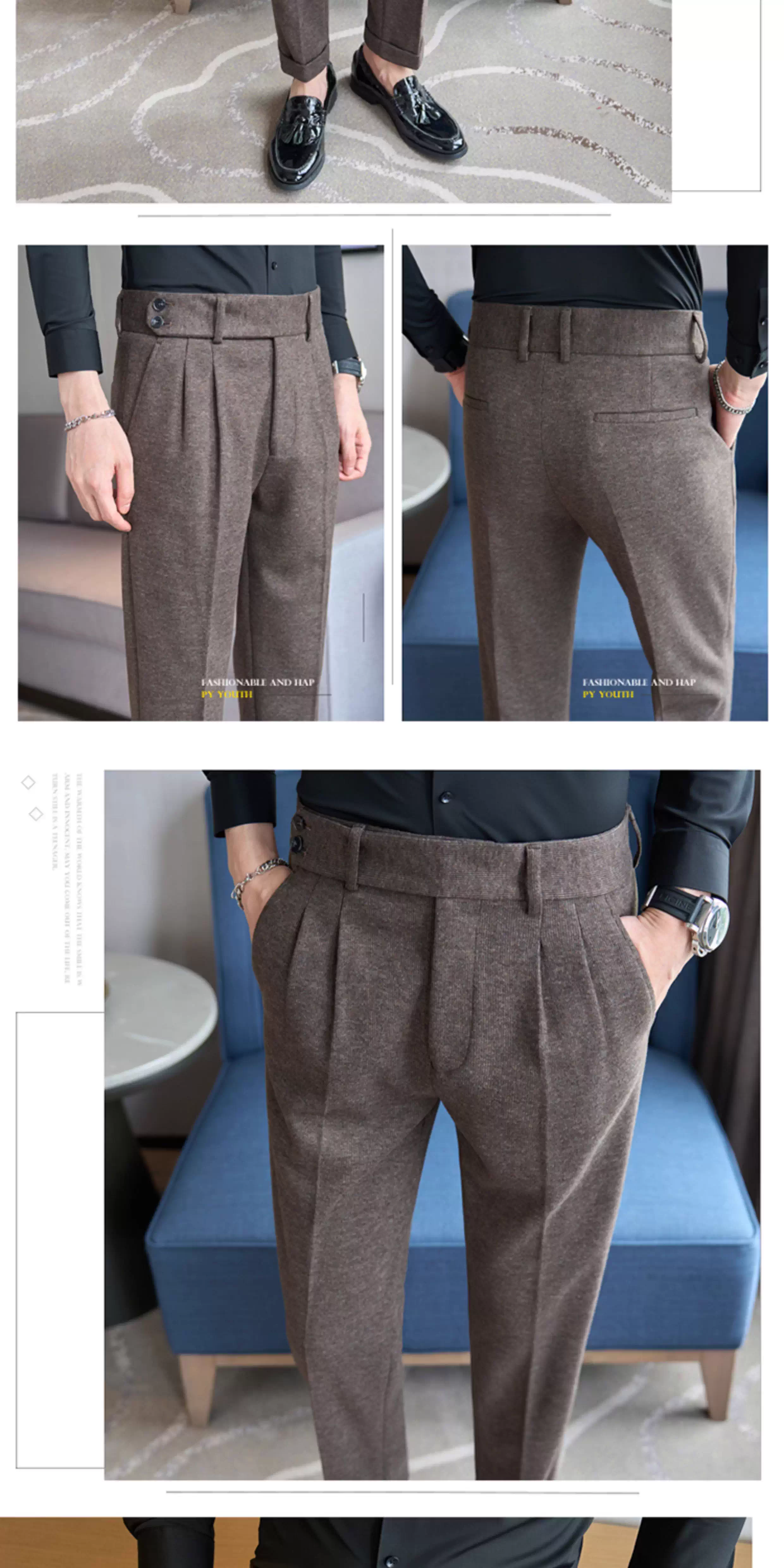 - Quần âu nam chất liệu len pha Naples, cạp cao, dáng thẳng, dày dặn mùa thu đông, kiểu dáng lịch sự, phù hợp với trang phục công sở.