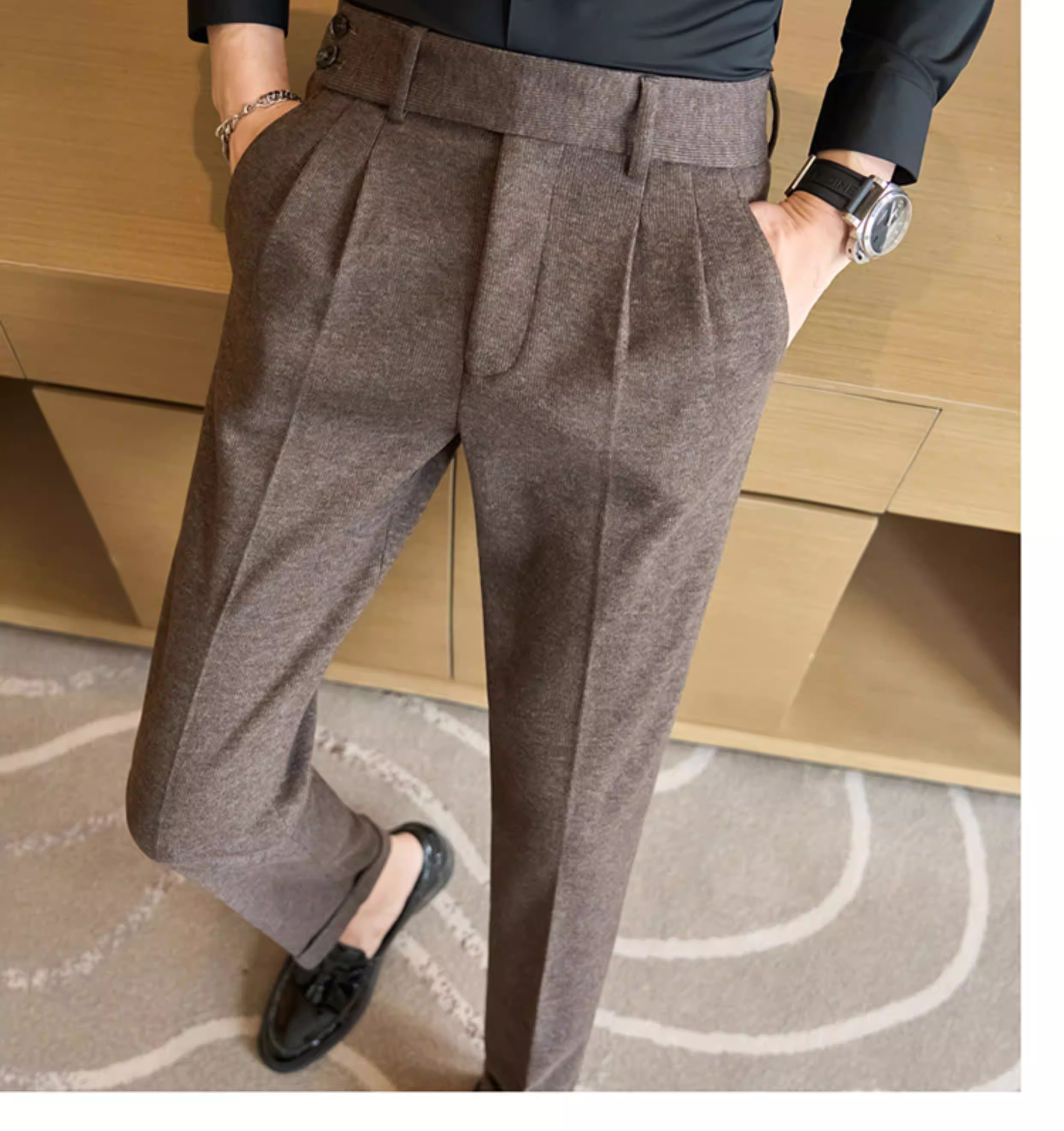 Quần âu nam chất liệu len pha Naples, cạp cao, dáng thẳng, dày dặn mùa thu đông, kiểu dáng lịch sự, phù hợp với trang phục công sở.