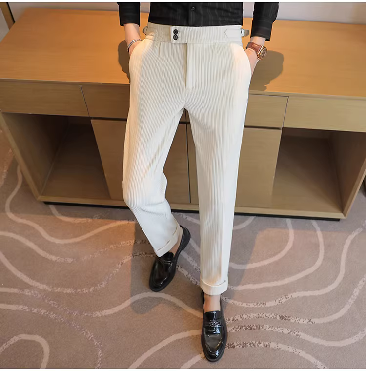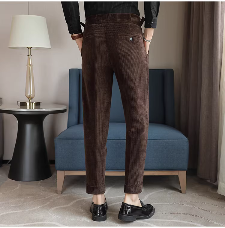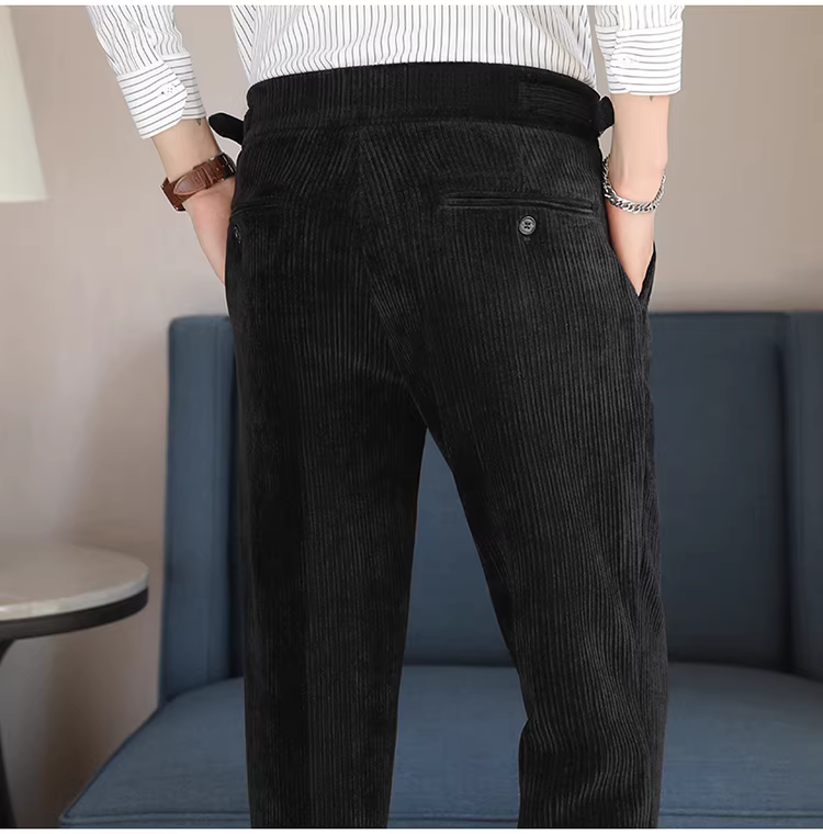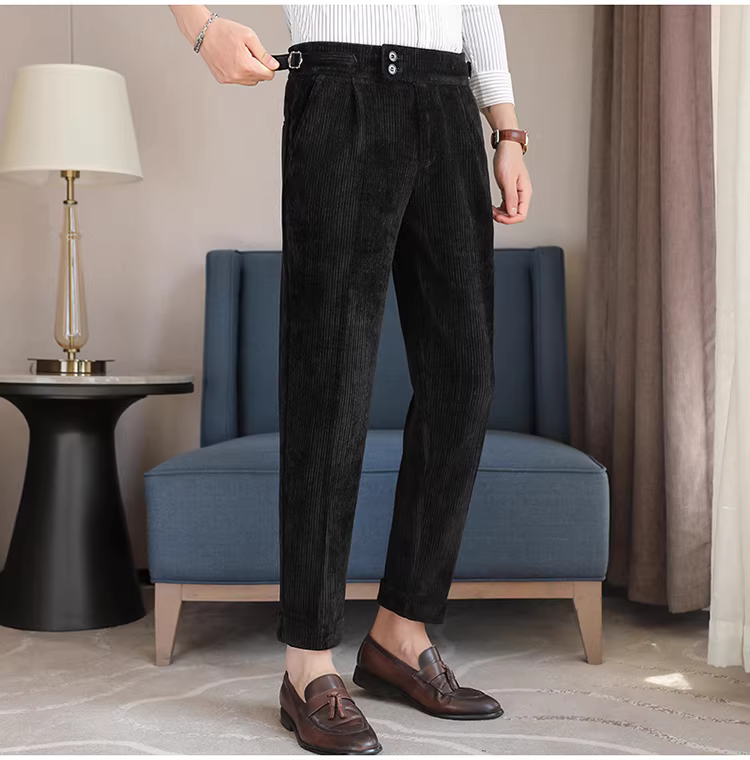 Quần âu nam chất liệu nhung cao cấp, kiểu dáng thẳng, chất liệu dày dặn, thích hợp cho mùa thu đông.