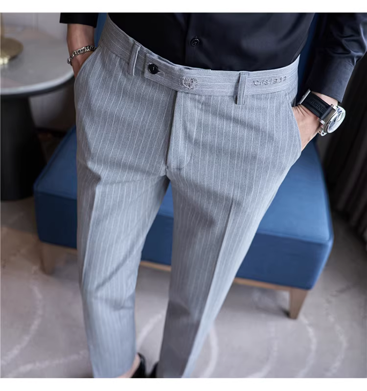 Quần âu nam kẻ sọc, quần công sở cao cấp mùa xuân thu mới, quần âu kiểu Anh dáng ôm thêu