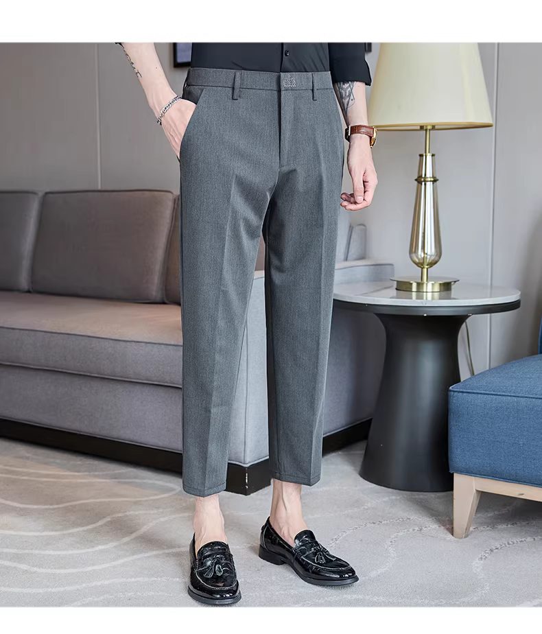 Quần âu nam lưng thun bán co giãn, kiểu dáng chín phần, mặc thường ngày mùa thu đông, lót lông cừu, dày dặn, cao cấp, kiểu dáng ôm sát, dáng ống côn.