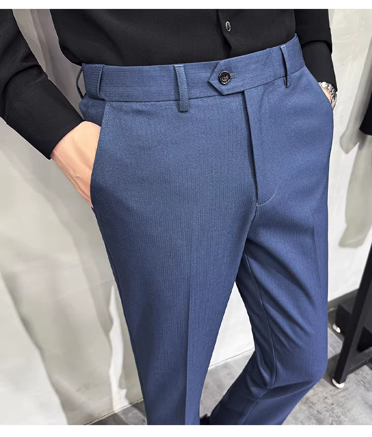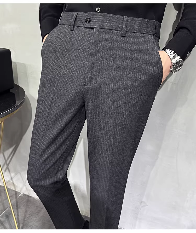 Quần âu nam lưng thun kẻ sọc, chất lượng cao, kiểu dáng đa năng, chất liệu mềm mại, ôm dáng, kiểu dáng thon gọn.