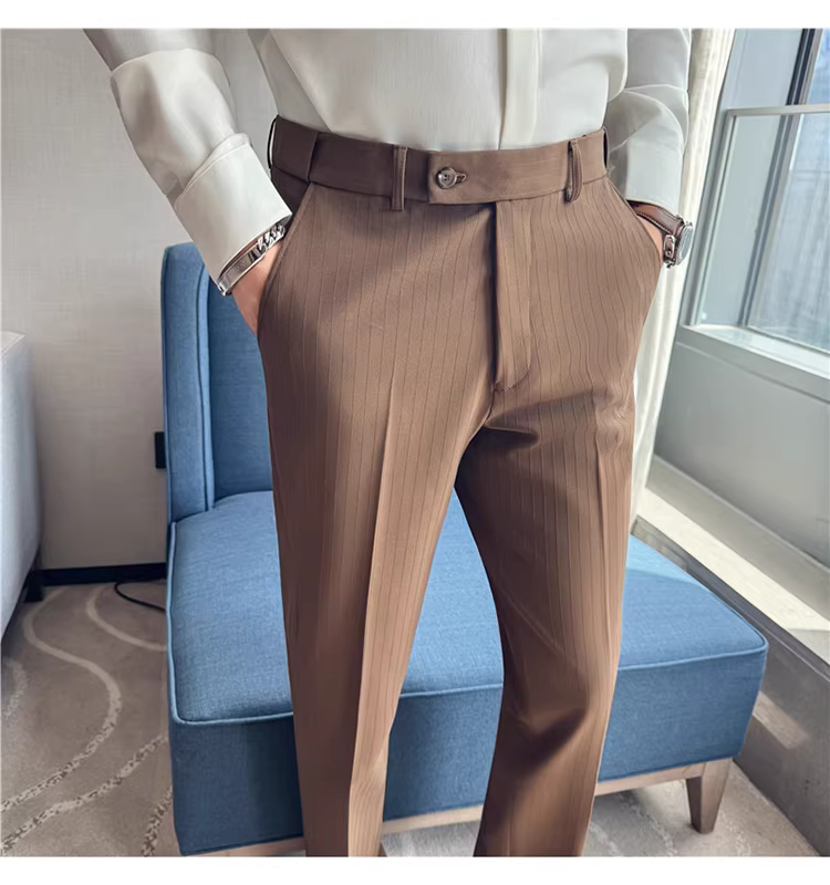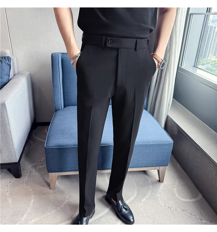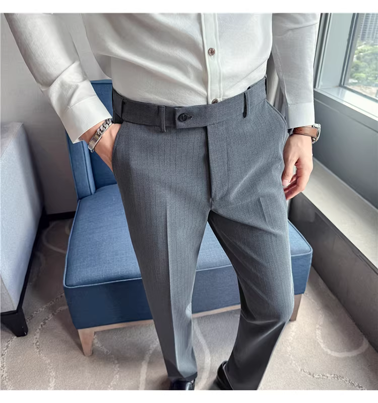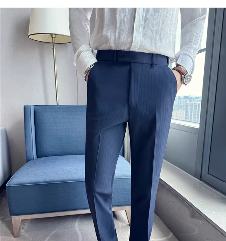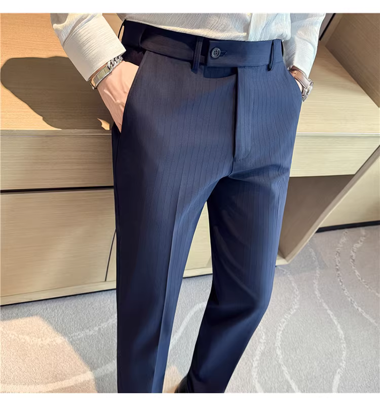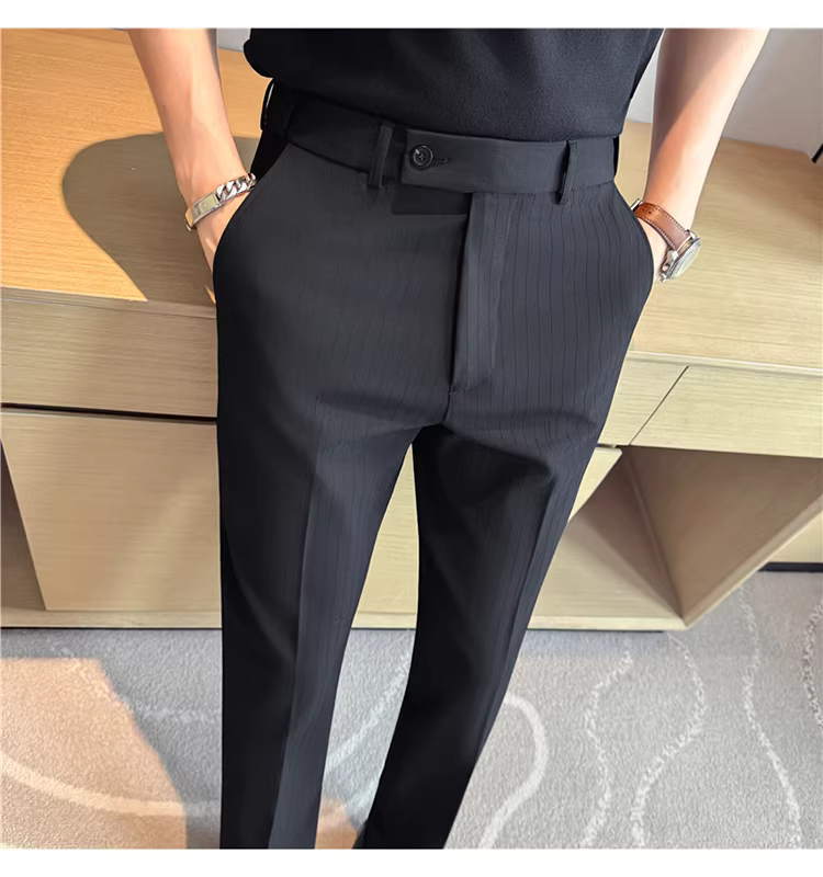 - Quần âu nam lưng thun kẻ sọc tối màu, quần âu chất lượng cao, dáng suông, ôm dáng, dễ chăm sóc.