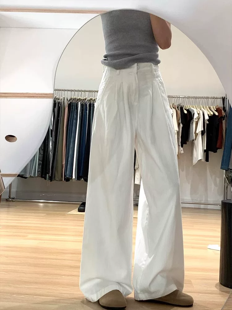 - Quần âu nữ ống đứng màu trắng, hè 2025, chất liệu mỏng, size lớn, cạp cao, dáng rộng, suôn mềm, tôn dáng, quần ống rộng