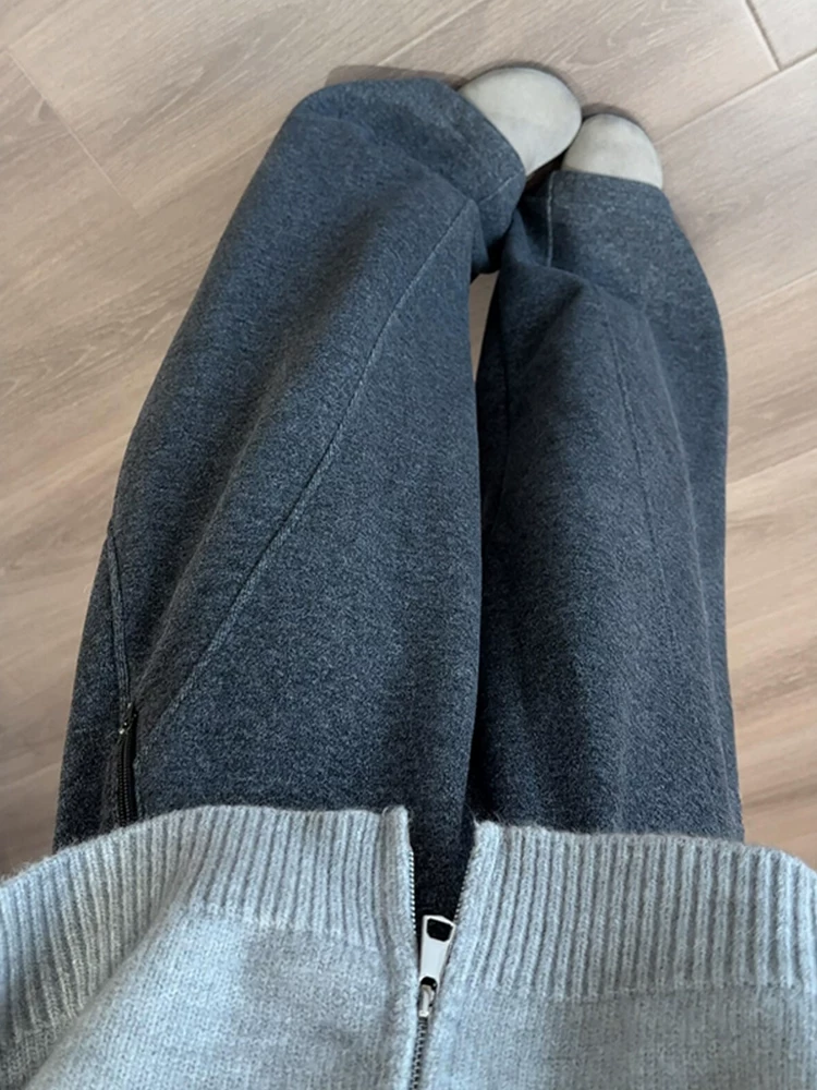 Quần âu nữ ống rộng màu xám, dáng suông, chất liệu len, lót lông cừu, dày dặn, cạp cao, mềm mại, phù hợp với dáng người quả lê, size lớn, mùa đông.