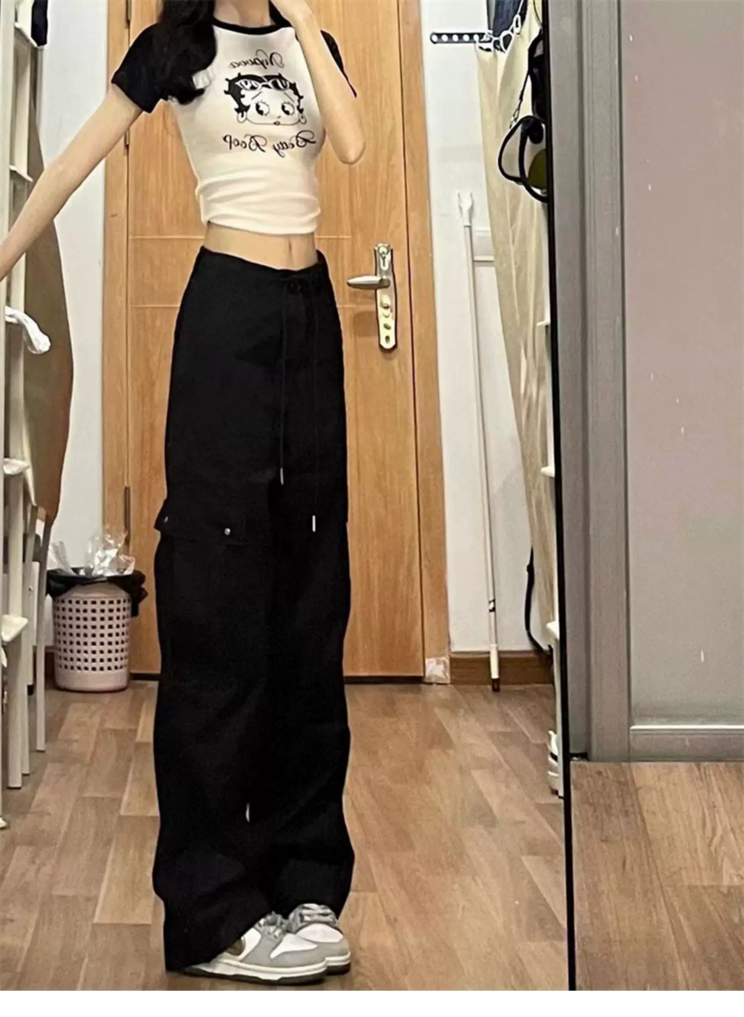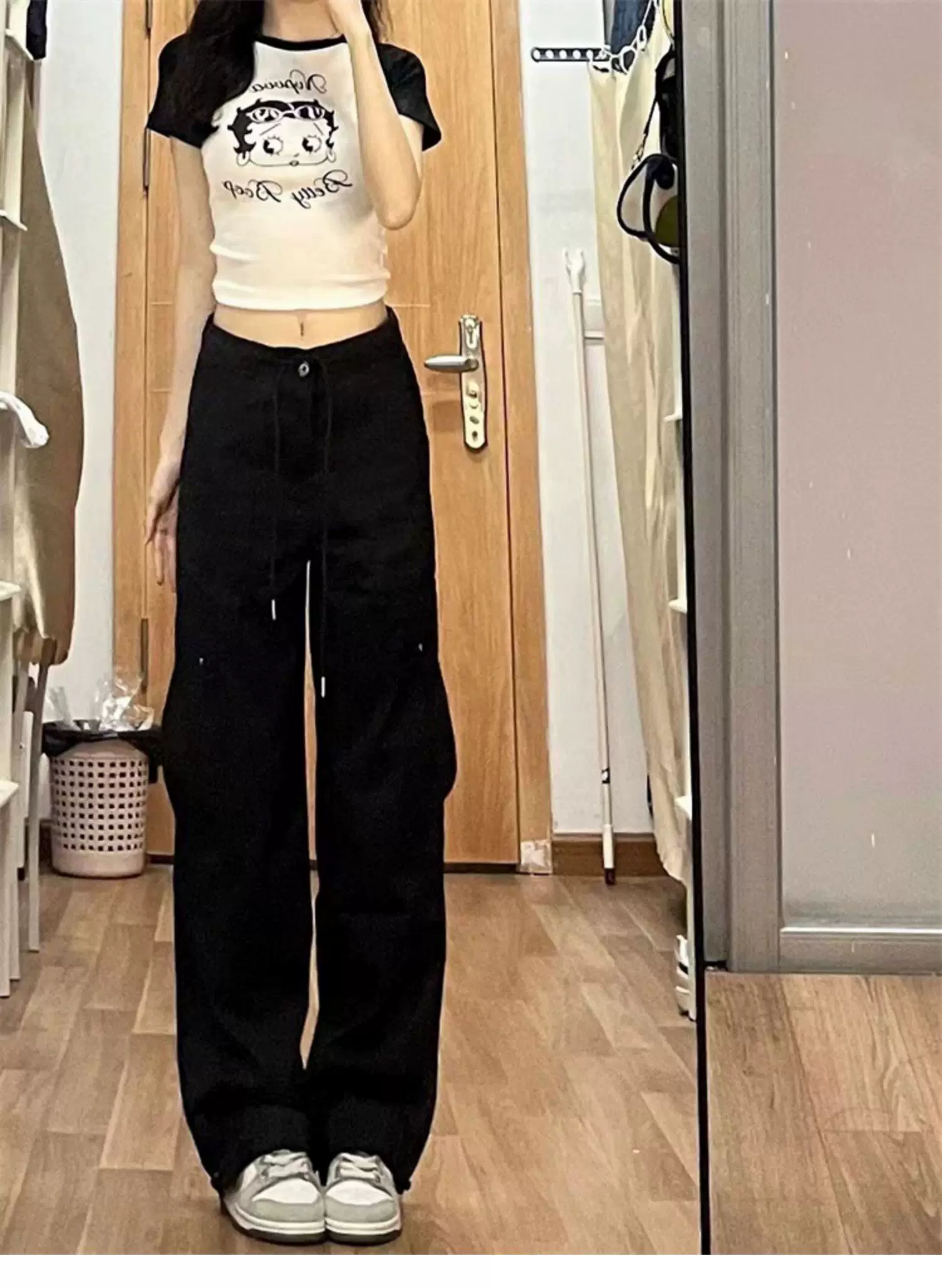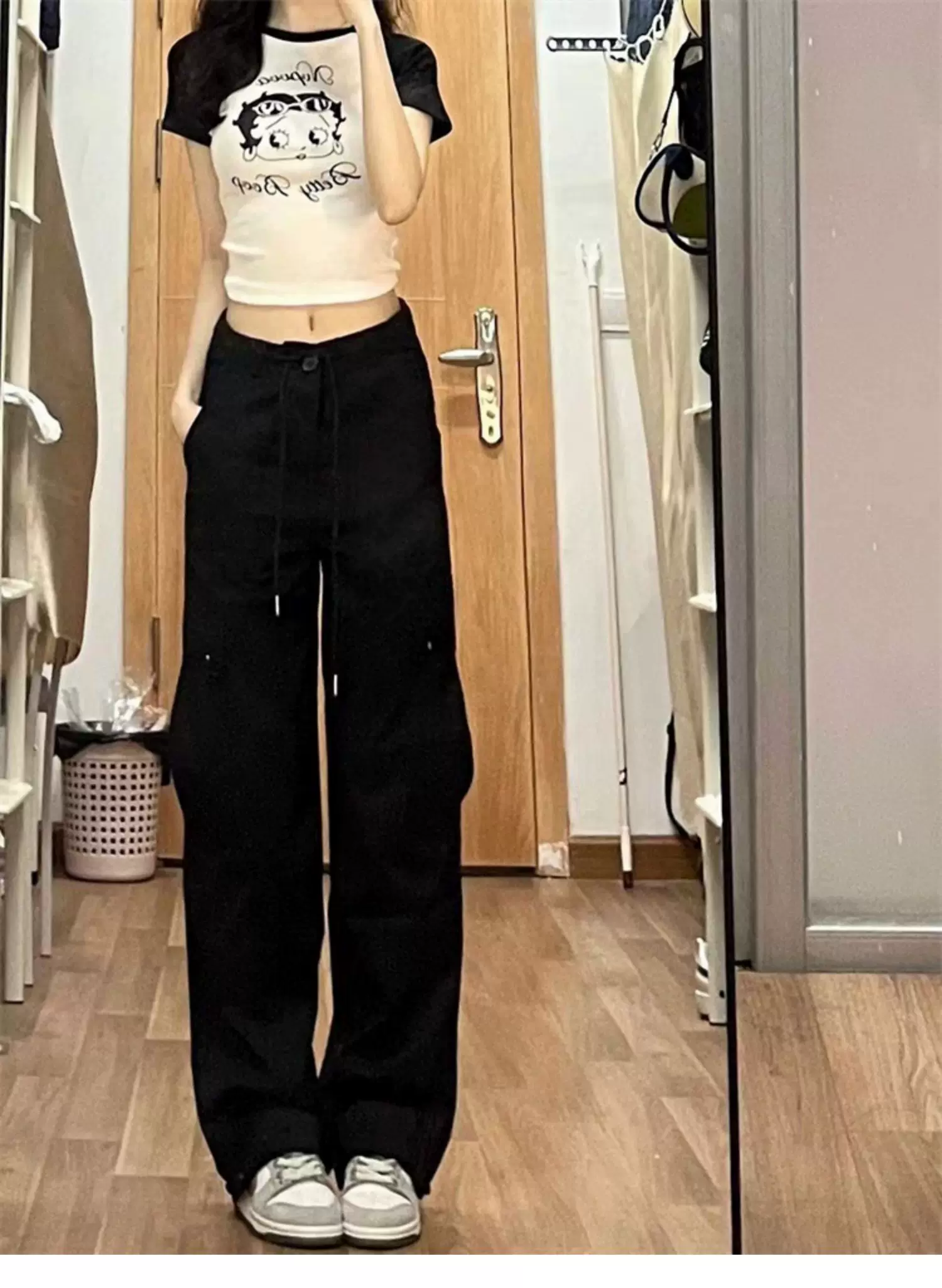 - Quần cargo đen dáng quả lê dành cho nữ, kiểu dáng mỏng mùa hè, cỡ lớn, lưng cao, ống thẳng, dáng rộng, tôn dáng, quần ống rộng thường ngày.