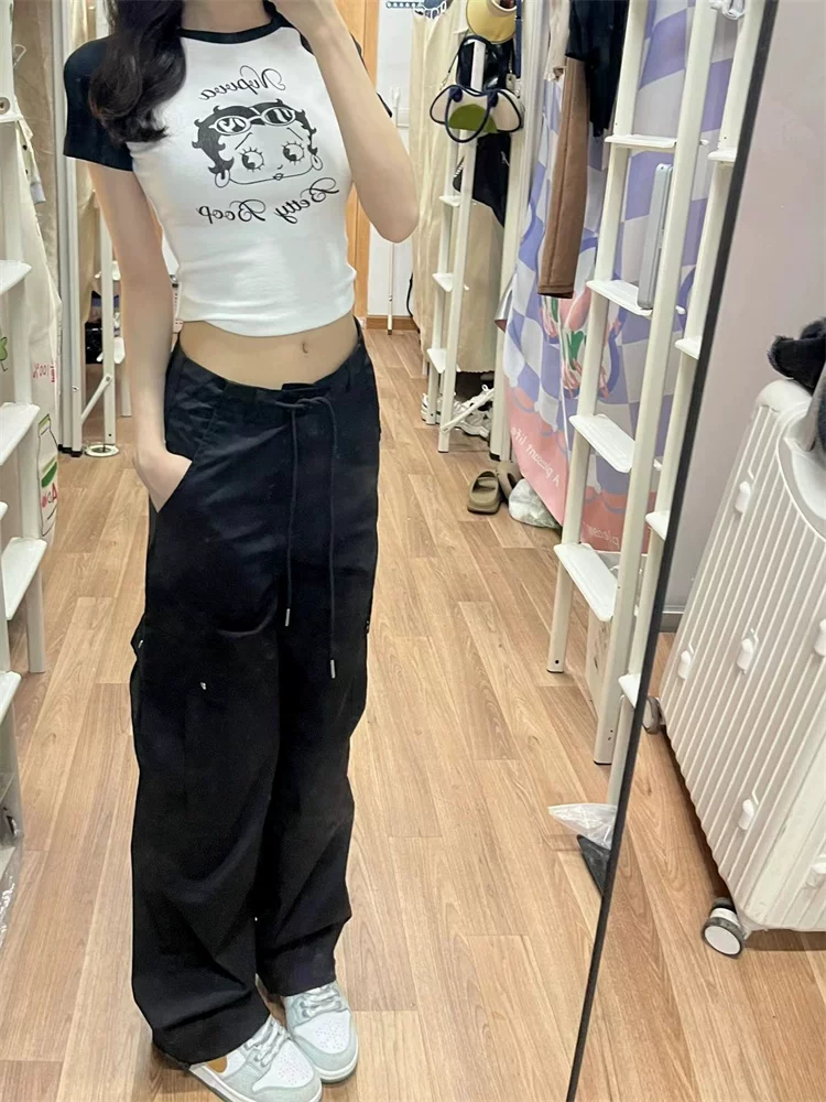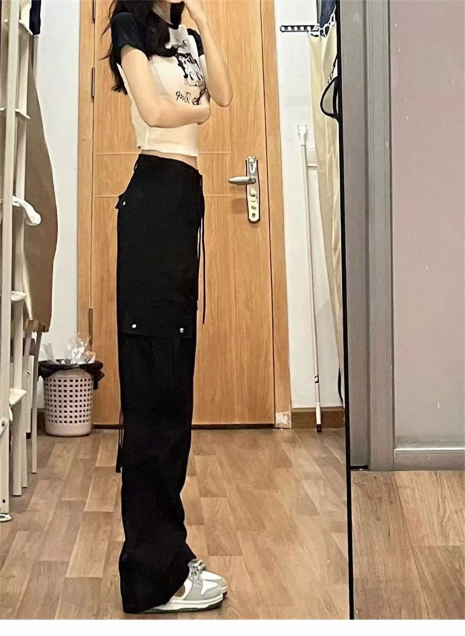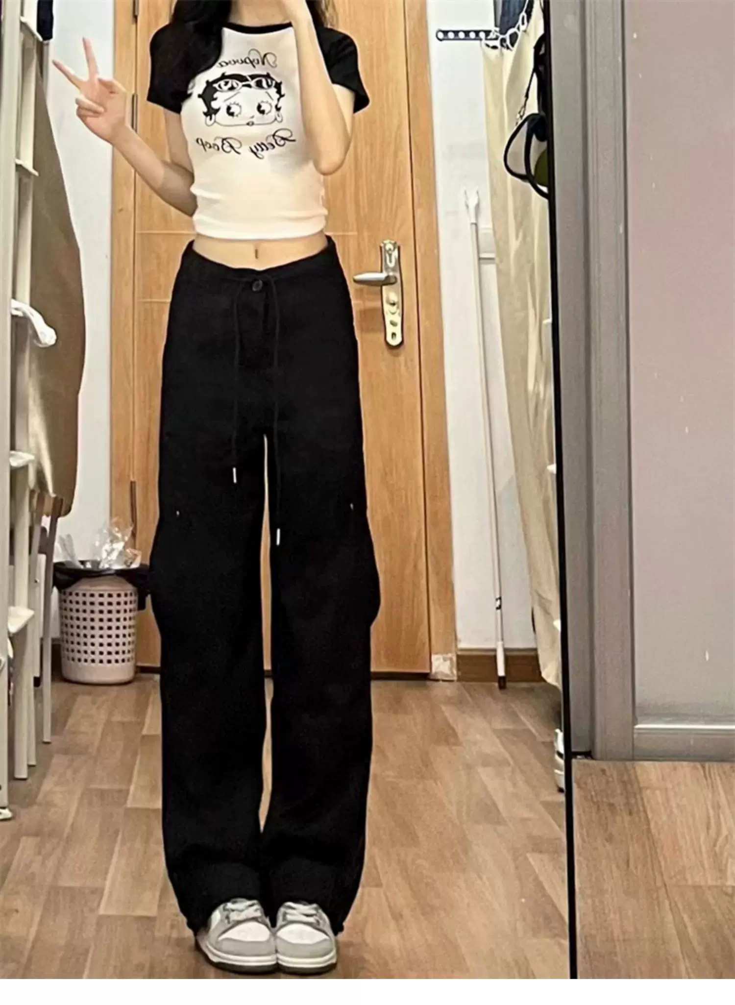 - Quần cargo đen dáng quả lê dành cho nữ, kiểu dáng mỏng mùa hè, cỡ lớn, lưng cao, ống thẳng, dáng rộng, tôn dáng, quần ống rộng thường ngày.