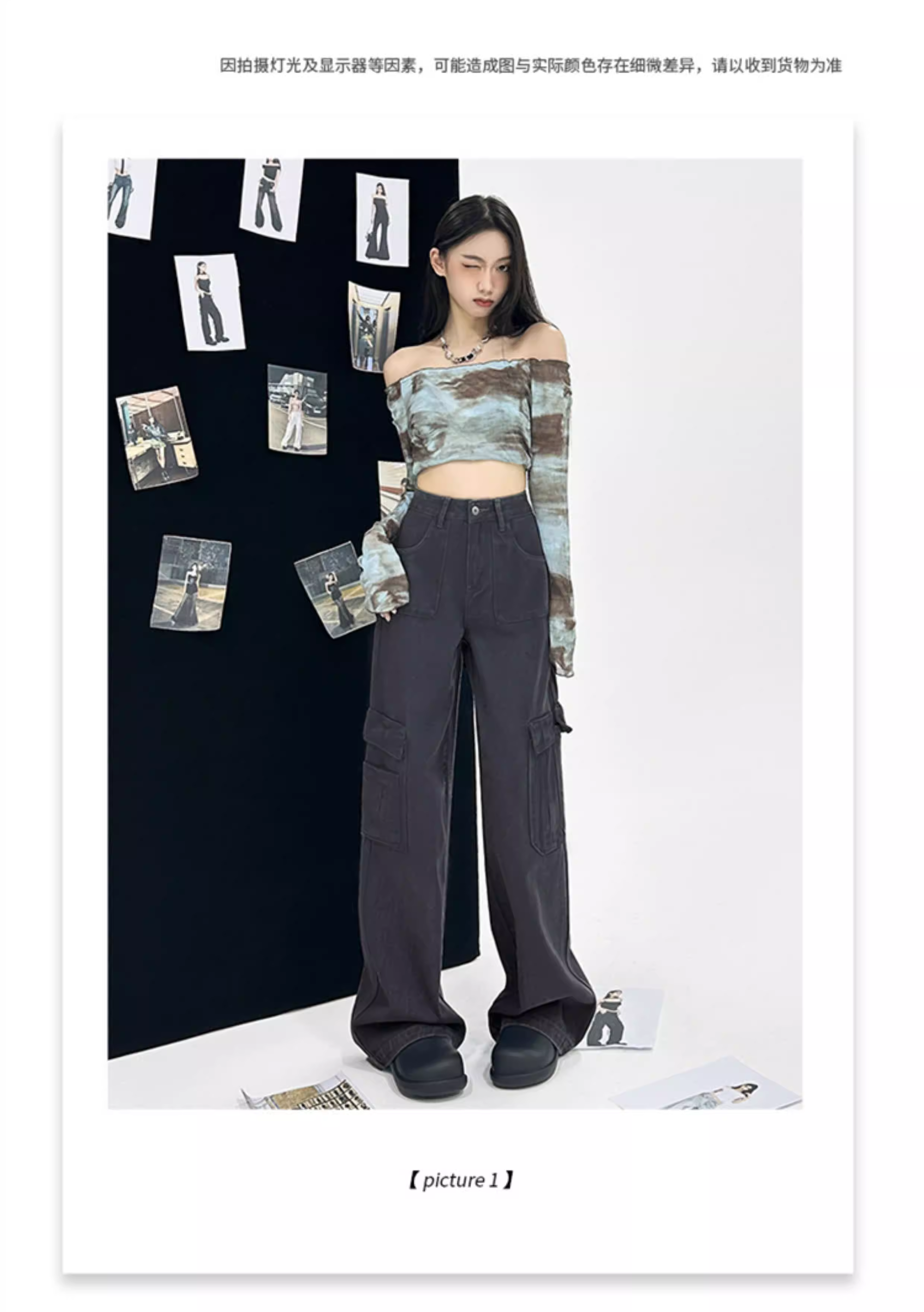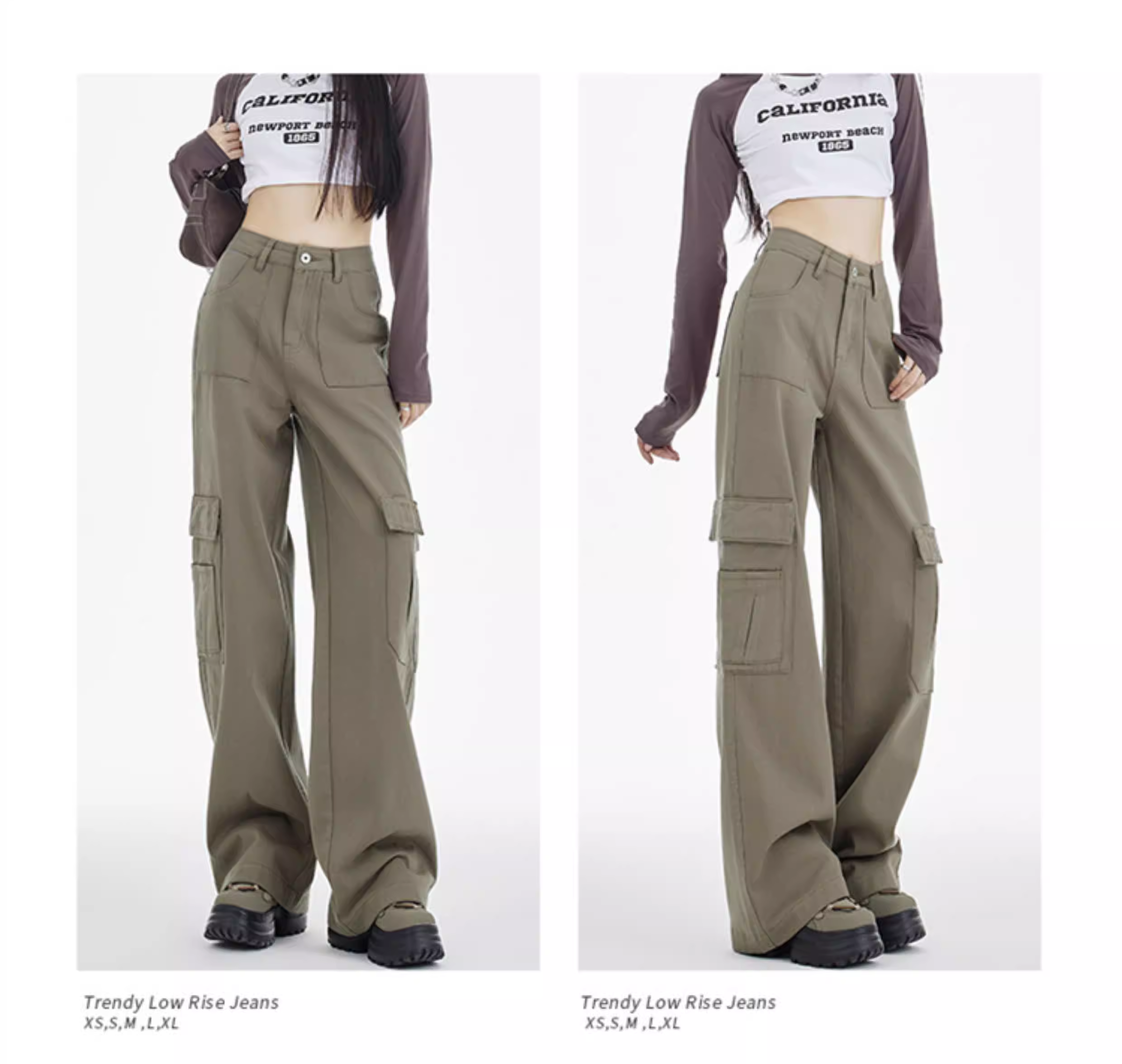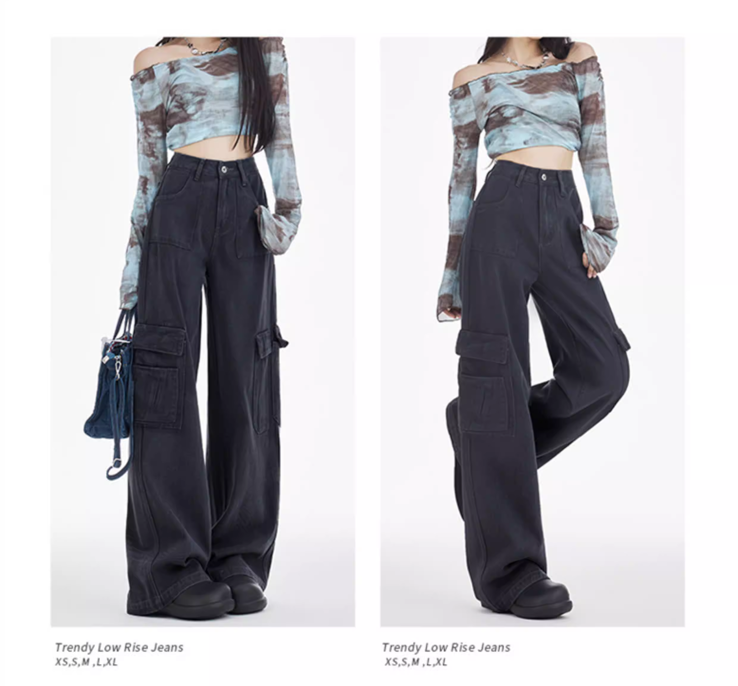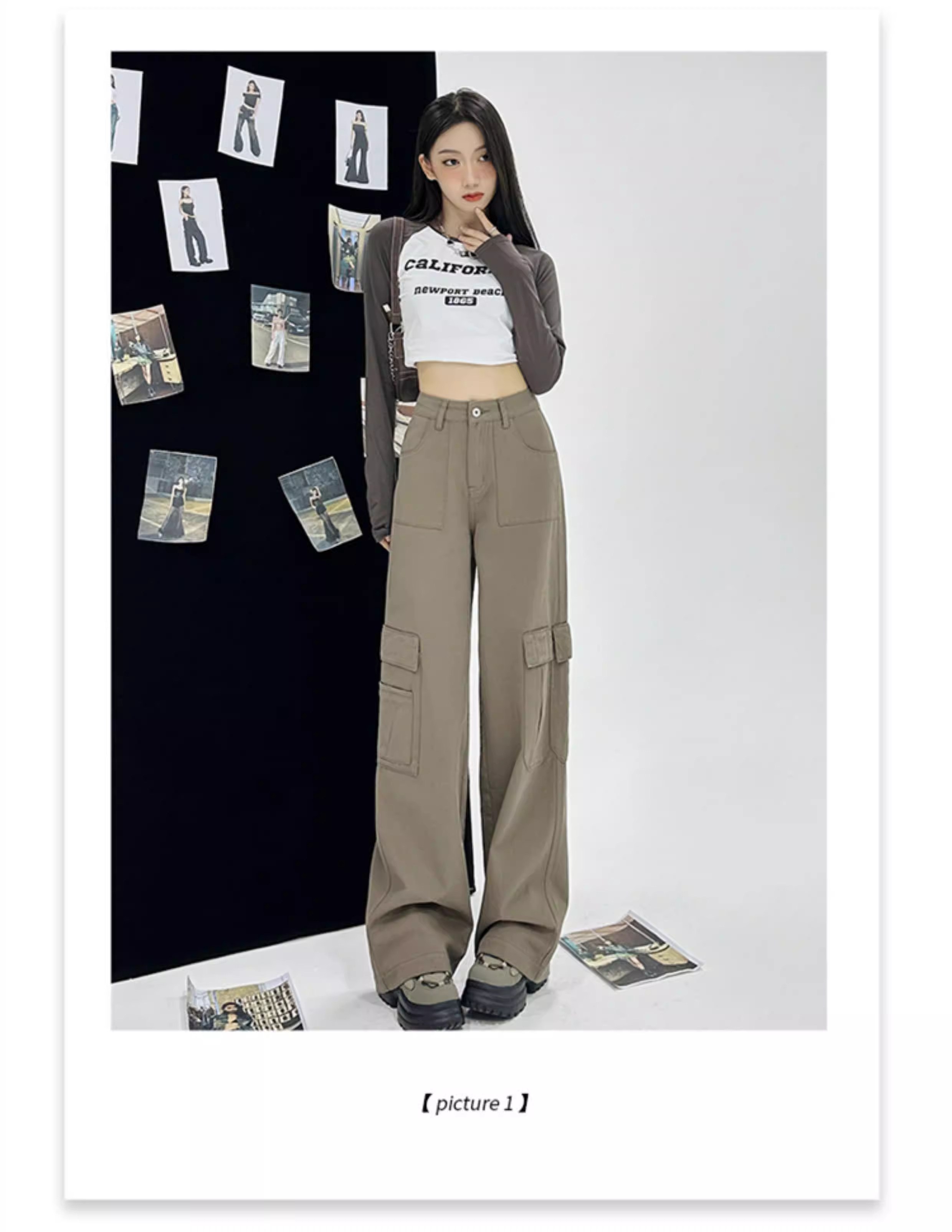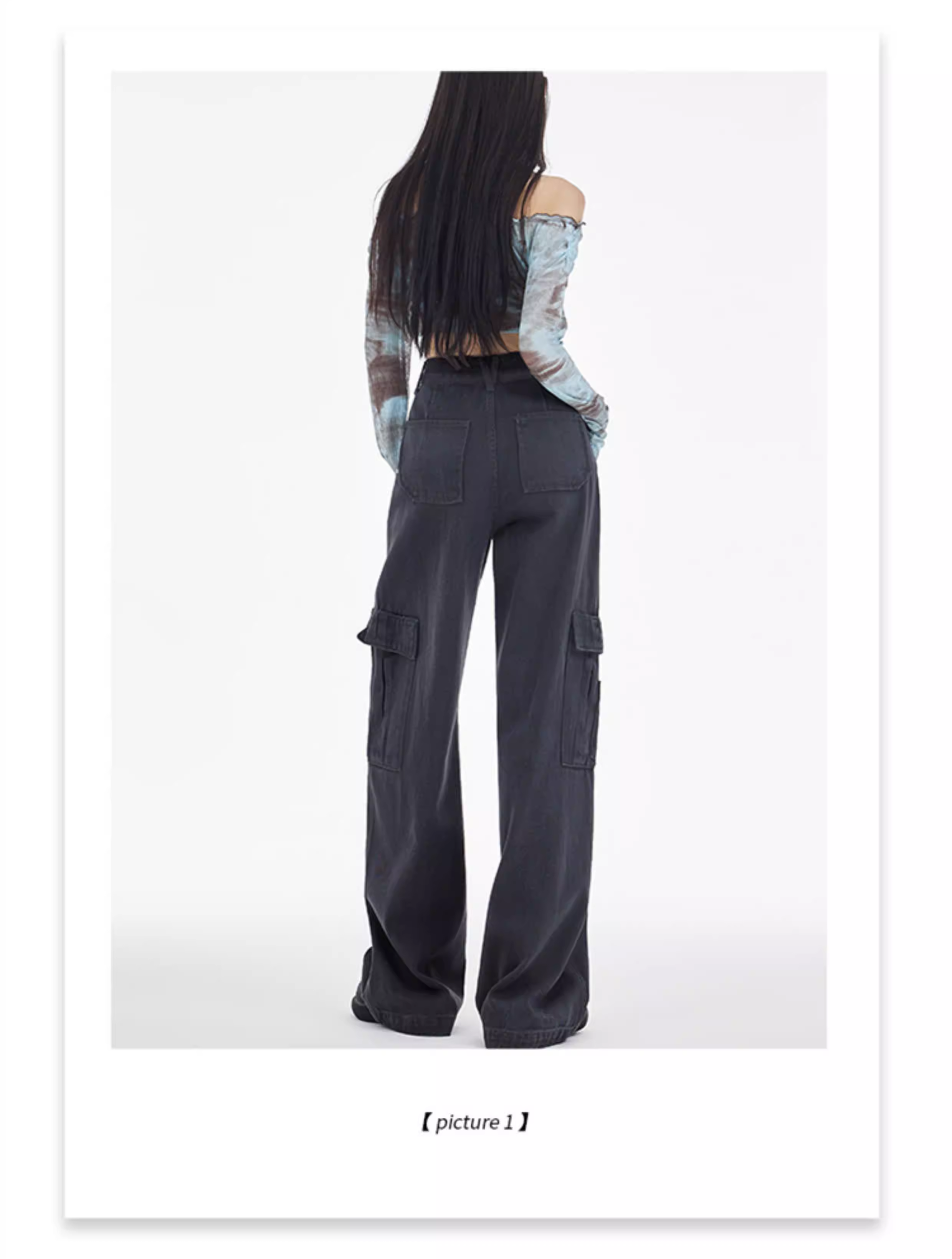 - Quần cargo denim kiểu Mỹ La Chapelle dành cho nữ, thu đông 2025, kiểu mới, cạp cao, màu xám xi măng, lót lông, dáng rộng, ống rộng