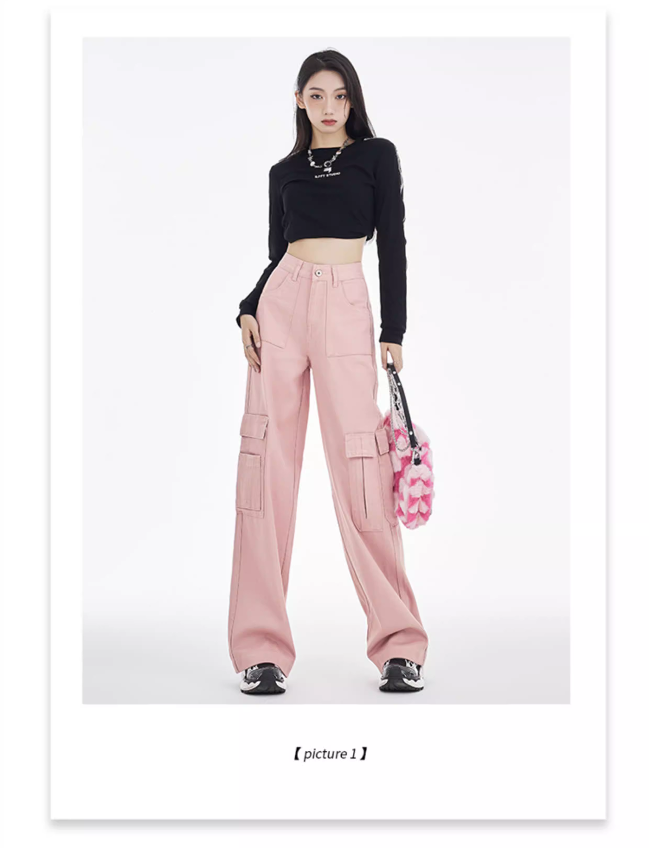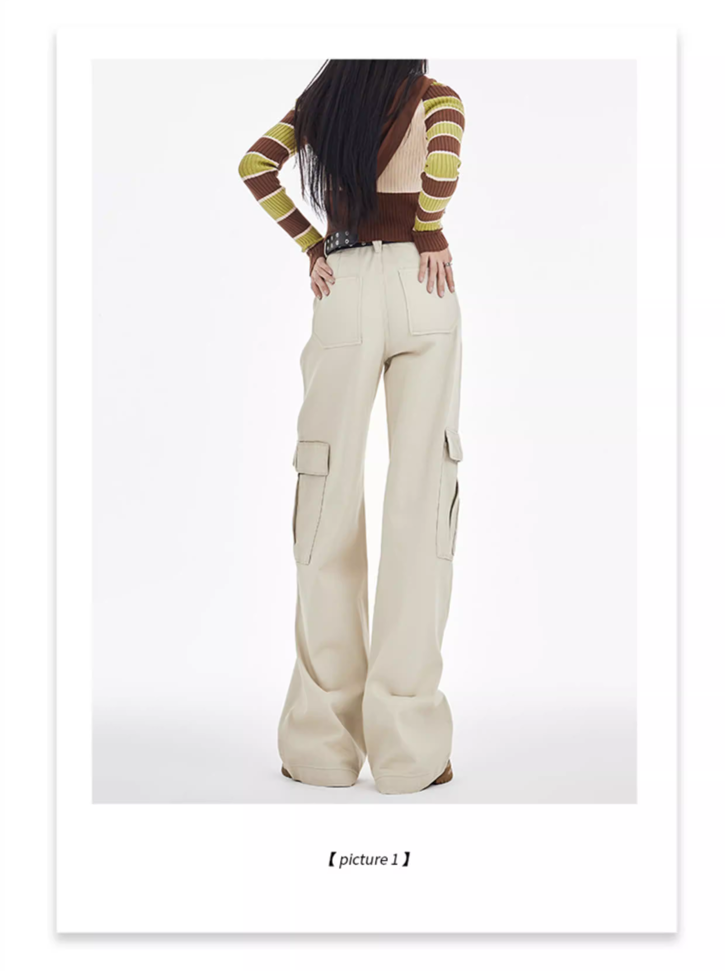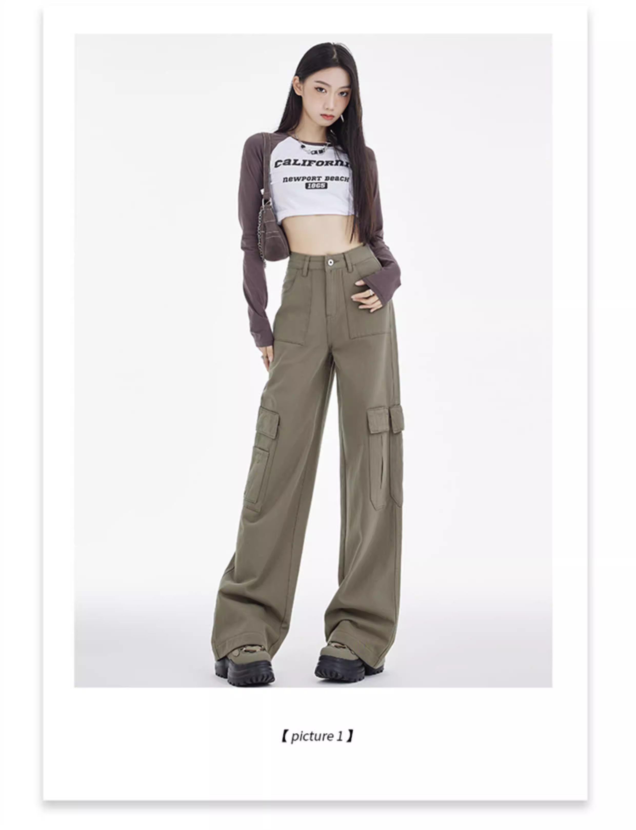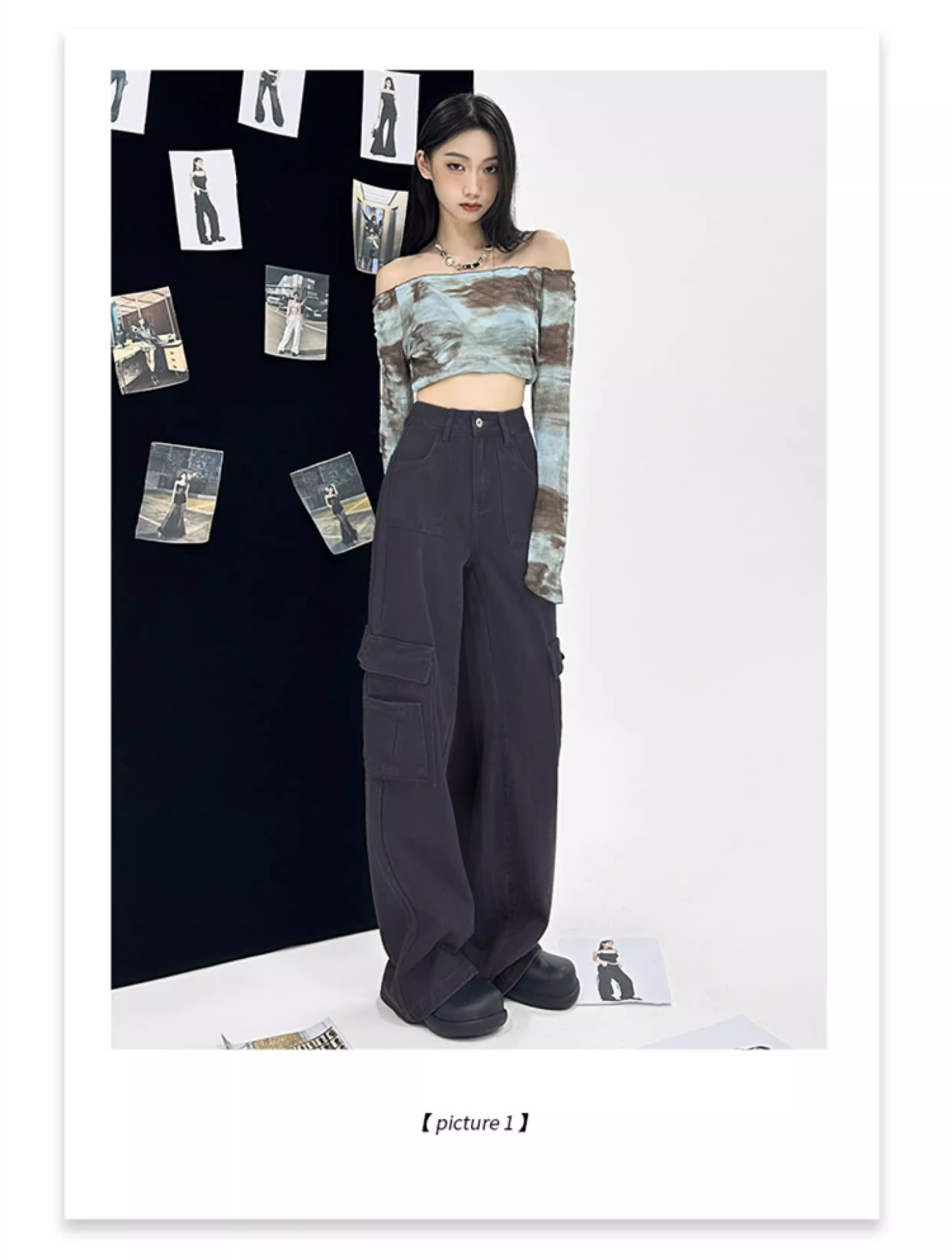 - Quần cargo denim kiểu Mỹ La Chapelle dành cho nữ, thu đông 2025, kiểu mới, cạp cao, màu xám xi măng, lót lông, dáng rộng, ống rộng
