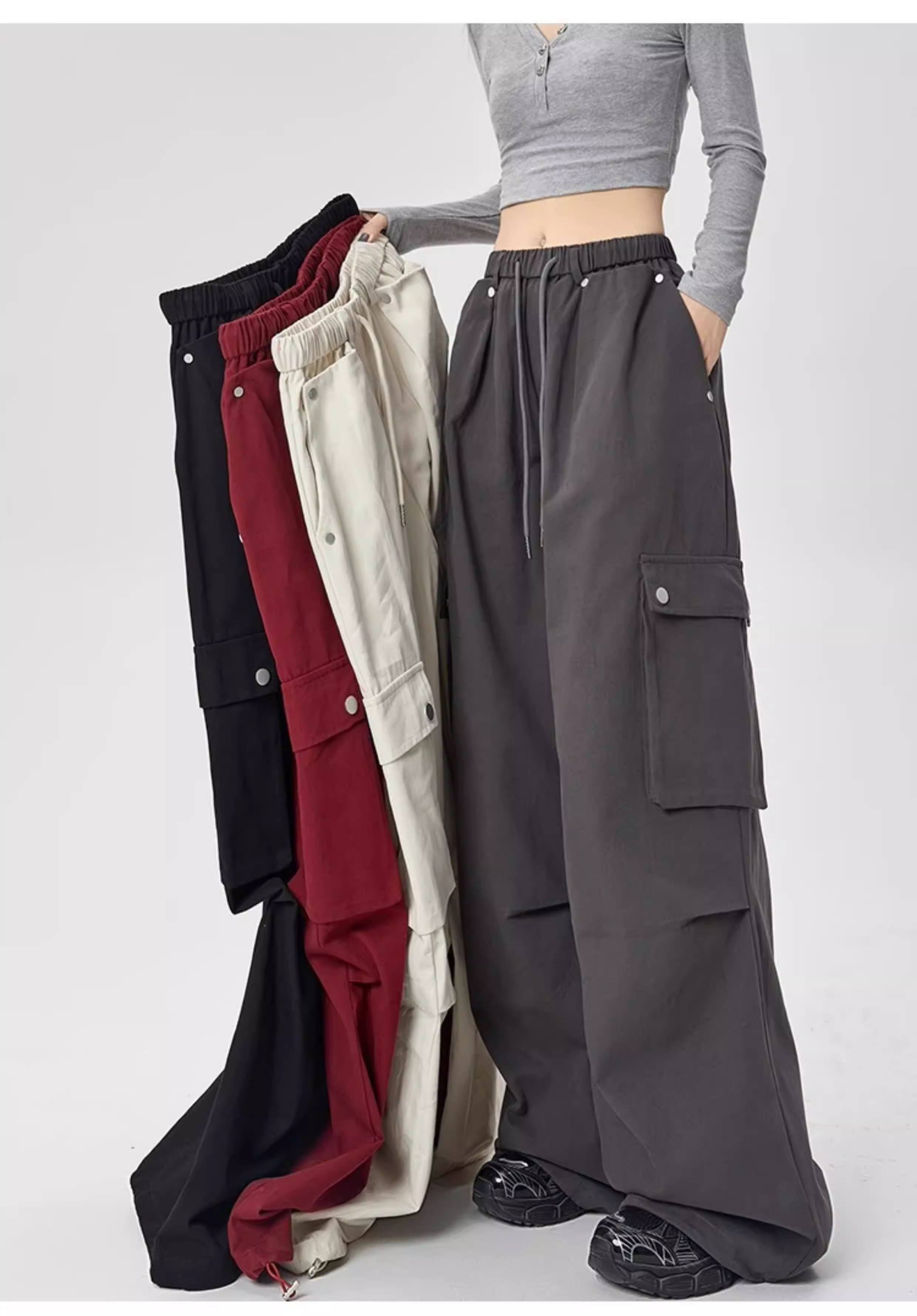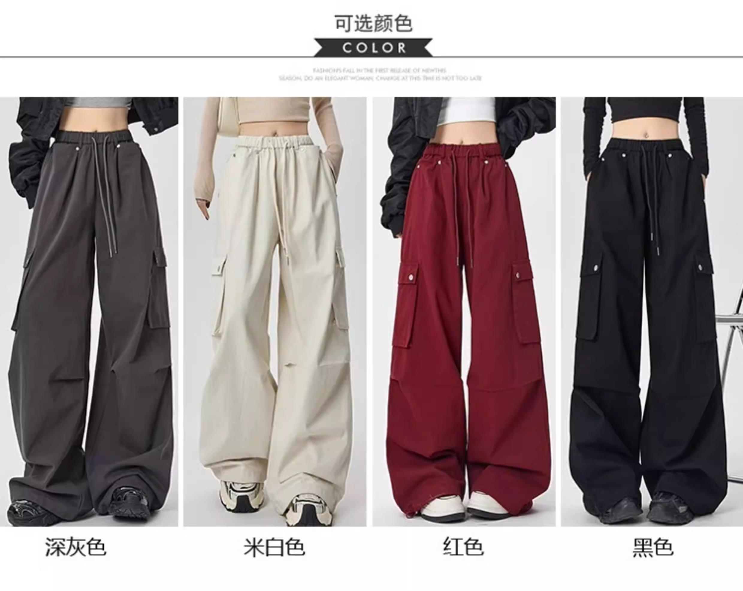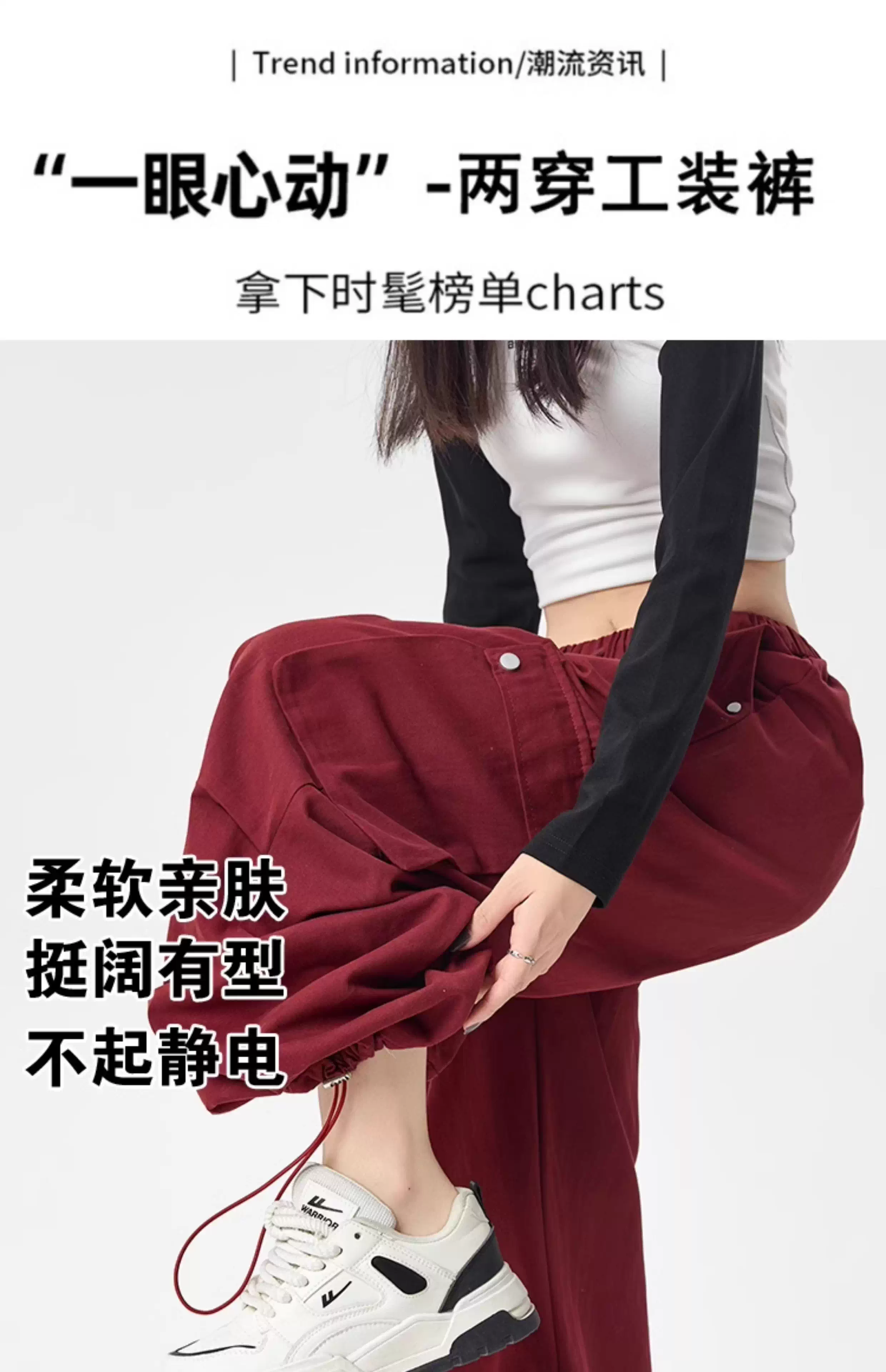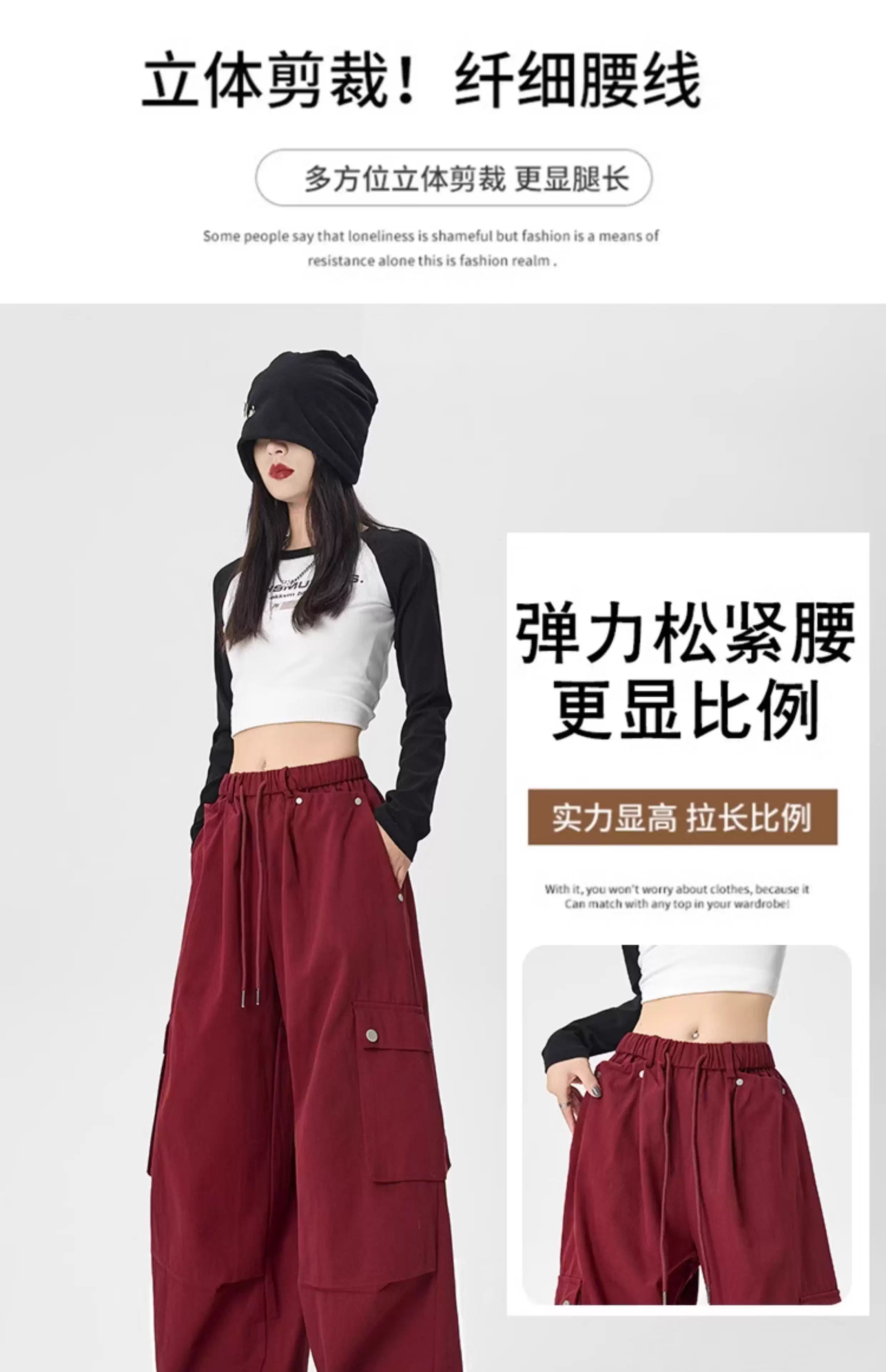- Quần cargo đỏ kiểu Mỹ La Chapelle dành cho nữ, mẫu mới thu đông 2025, cạp cao, dáng rộng, chất liệu dù thoáng mát