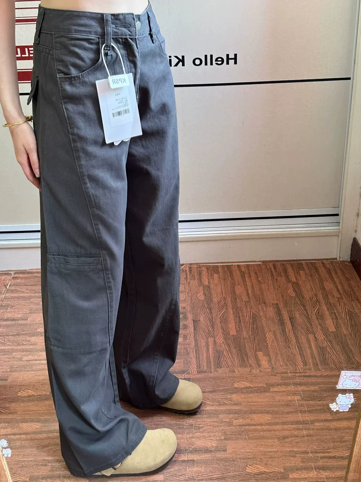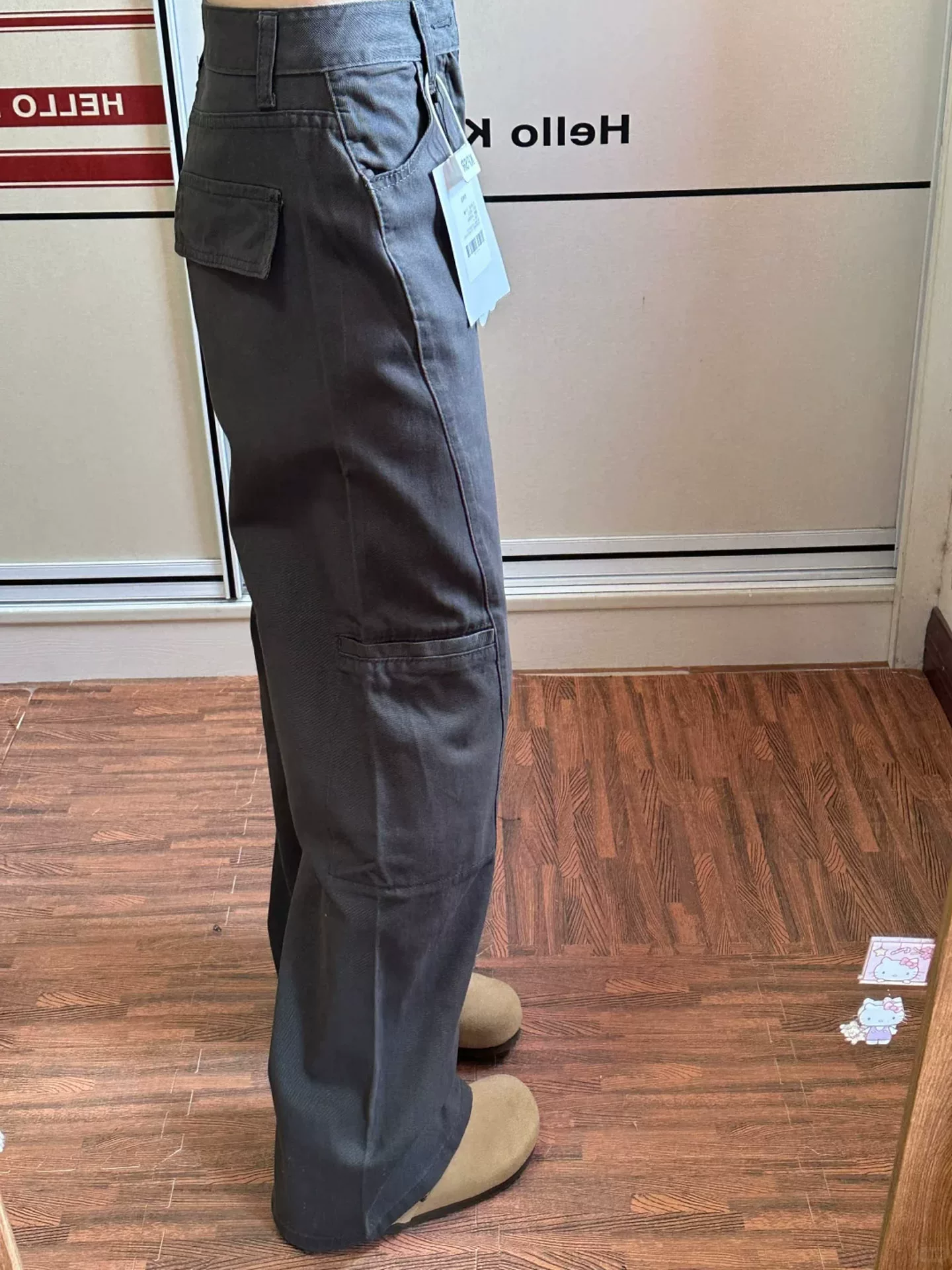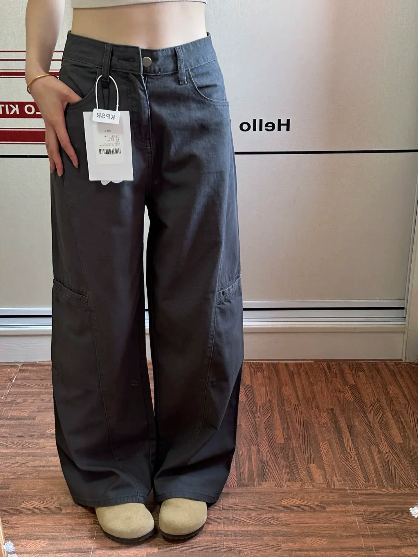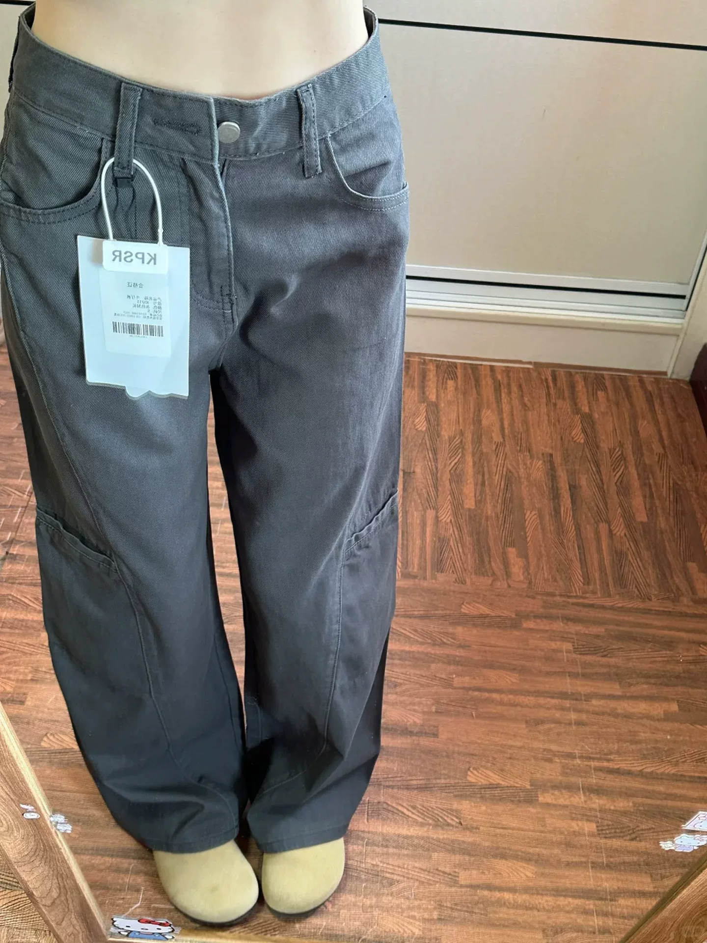 - Quần cargo màu xám thường ngày dành cho nữ, mùa thu, cỡ lớn, lưng cao, dáng rộng, che hông, giảm béo, dáng quả lê, quần ống rộng