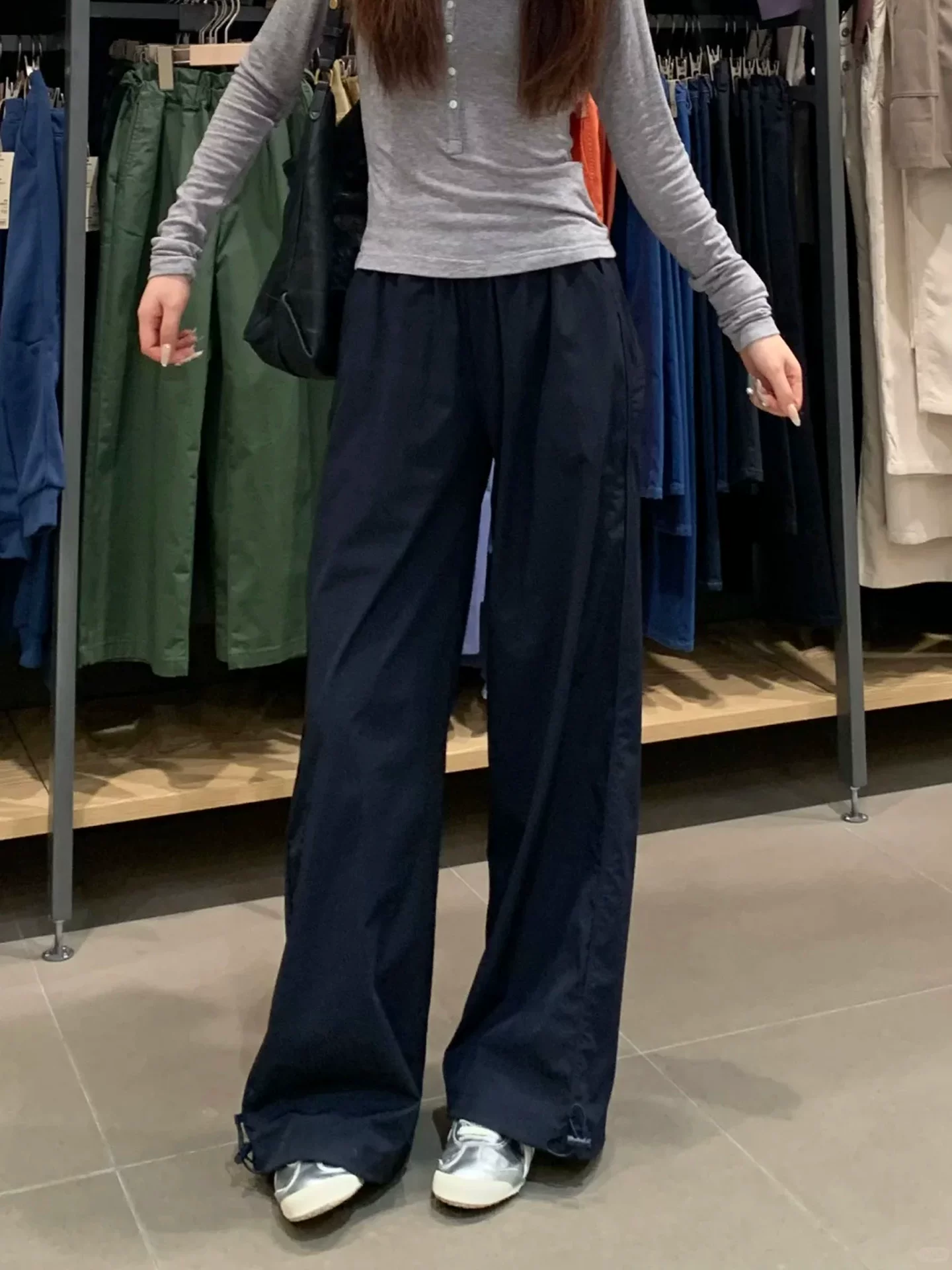 Quần cargo màu xanh hải quân dành cho nữ, cỡ lớn, mặc đầu thu, lưng cao, giảm béo, dáng quả lê, quần ống rộng thể thao