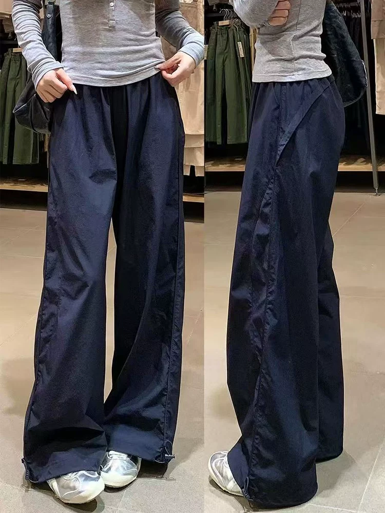 Quần cargo màu xanh hải quân dành cho nữ, phong cách mùa hè mới, cỡ lớn, lưng cao, dáng rộng, tôn dáng, dáng quả lê, quần ống rộng thông thường