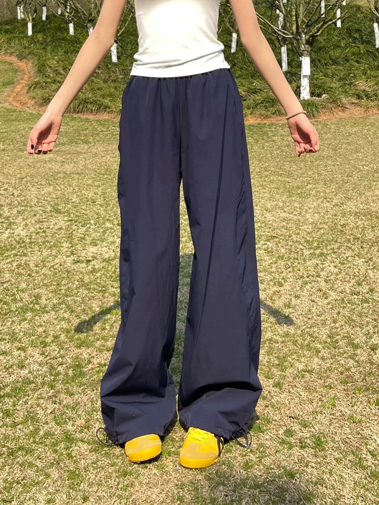 - Quần cargo màu xanh navy nhanh khô dành cho nữ mùa hè 2025, size lớn, cạp cao, dáng rộng, tôn dáng, thể thao, thường ngày, ống rộng