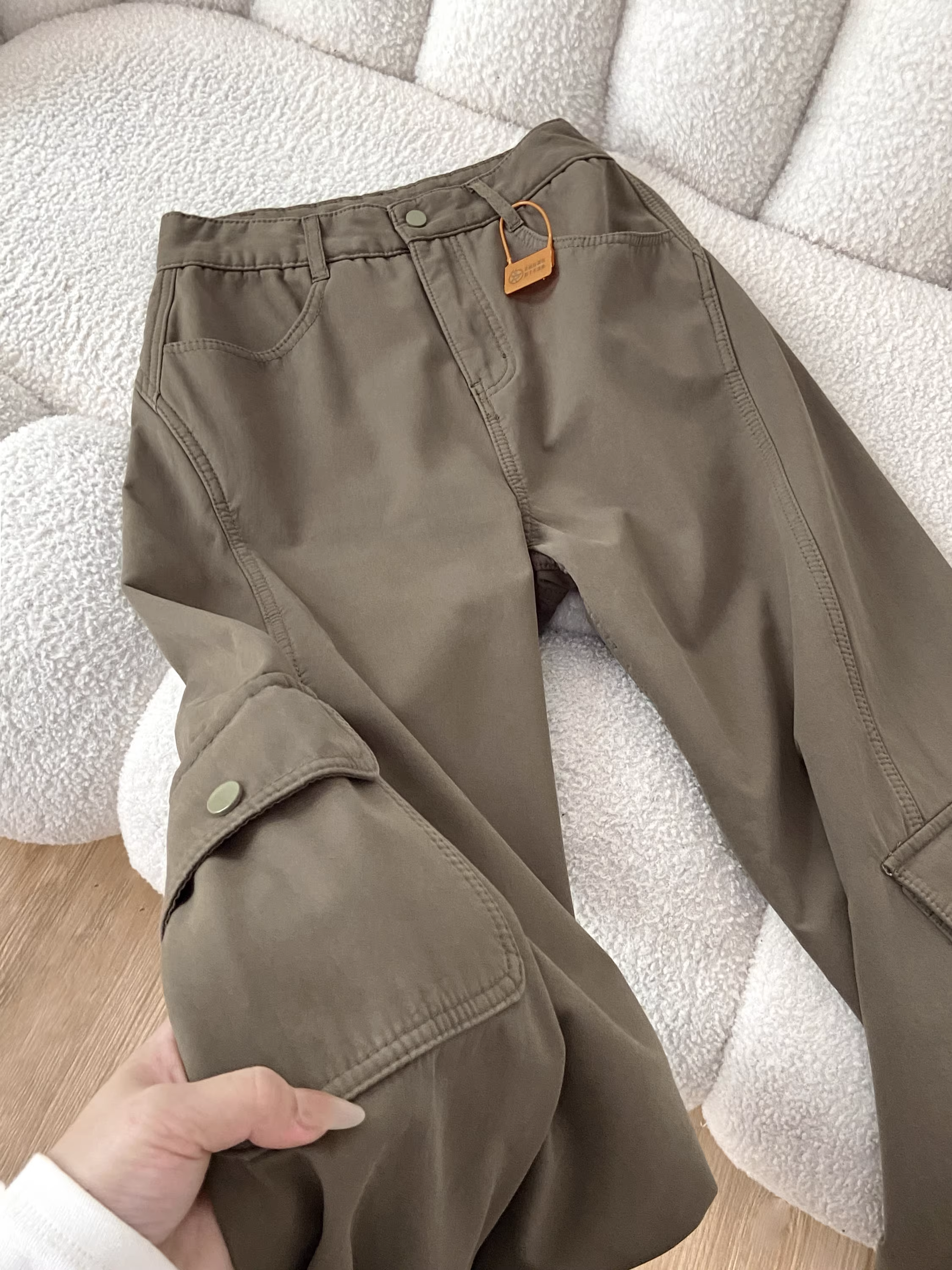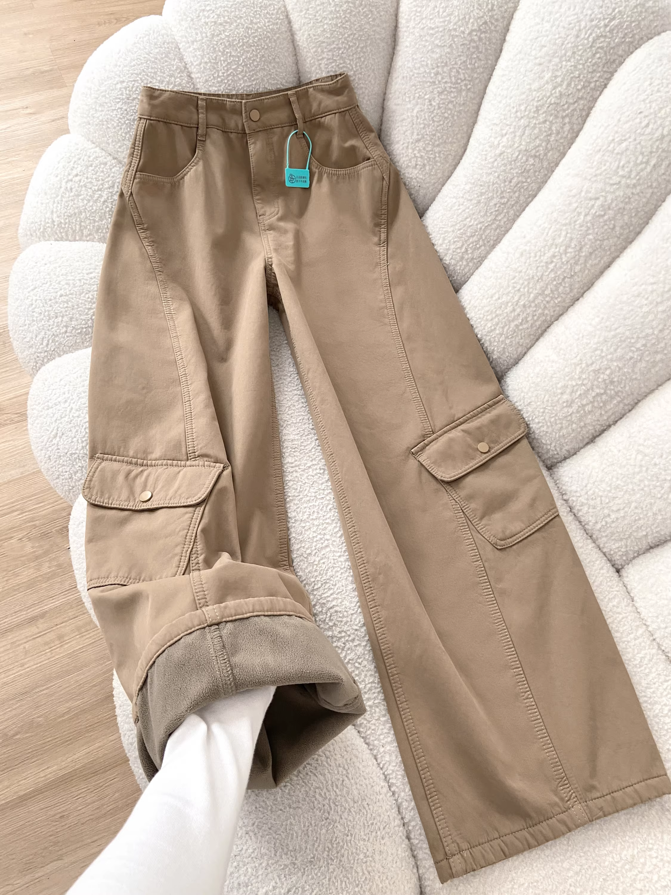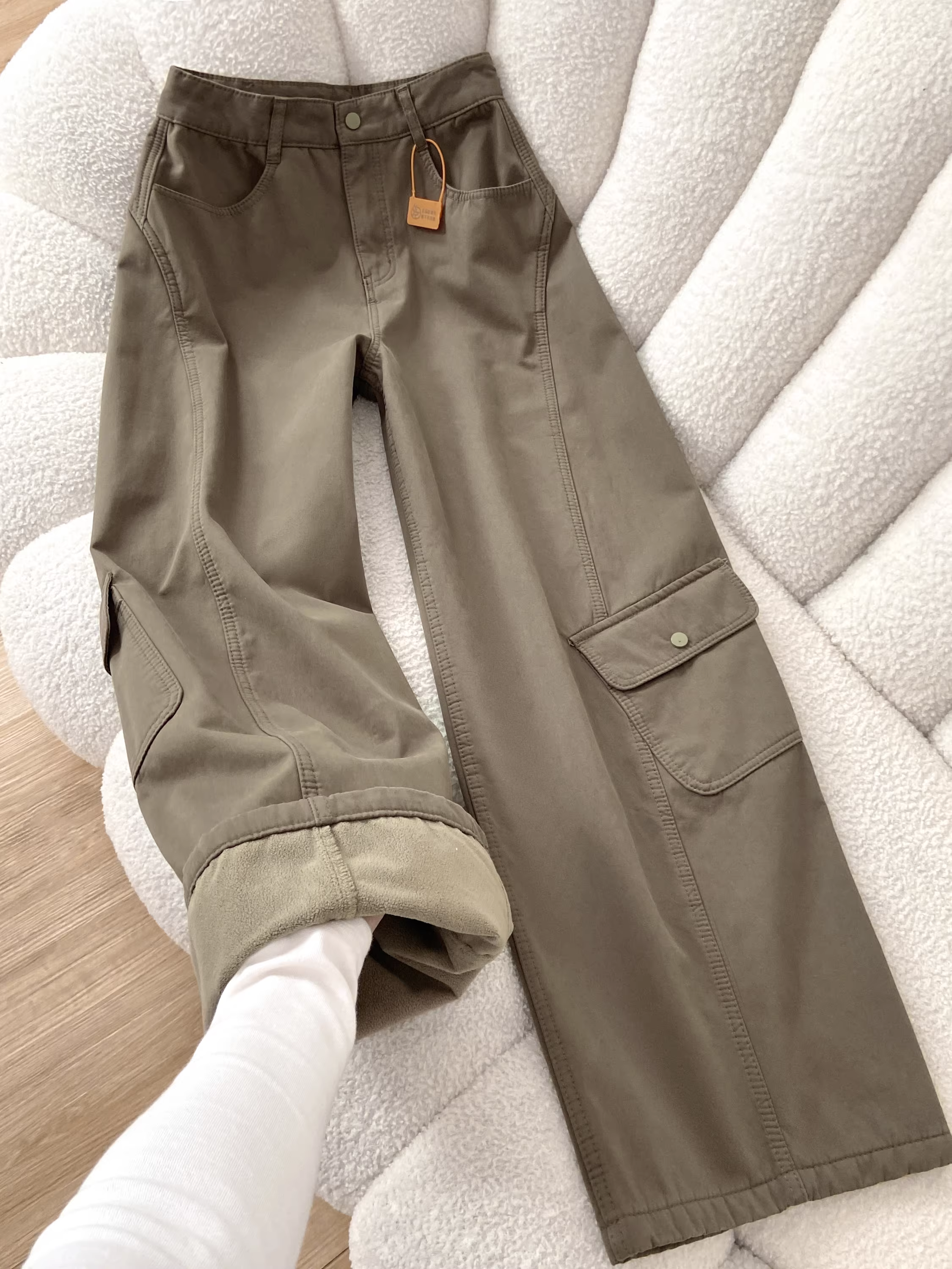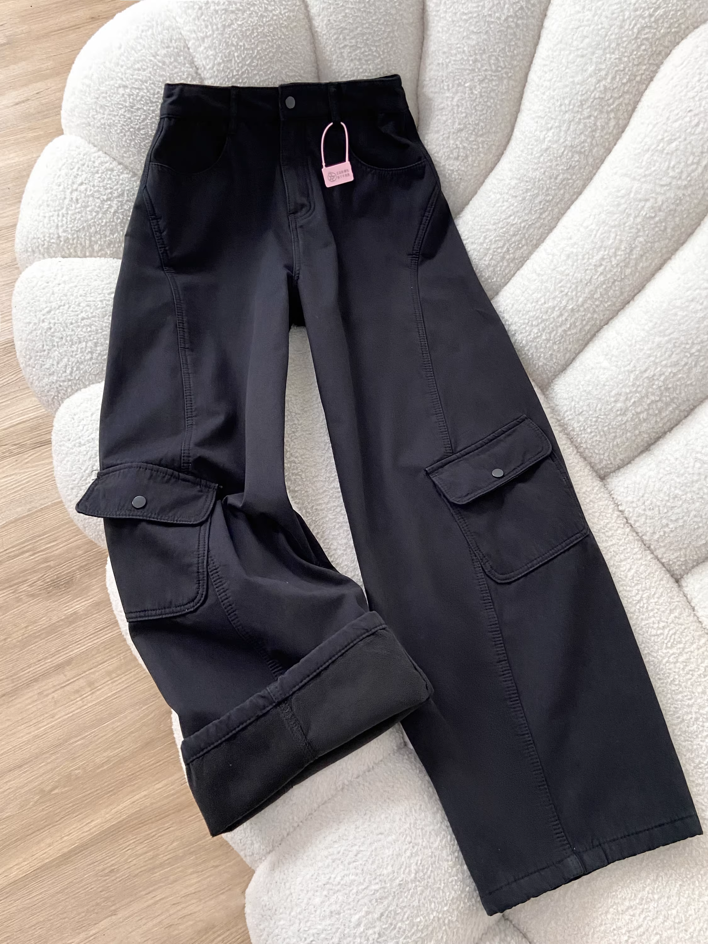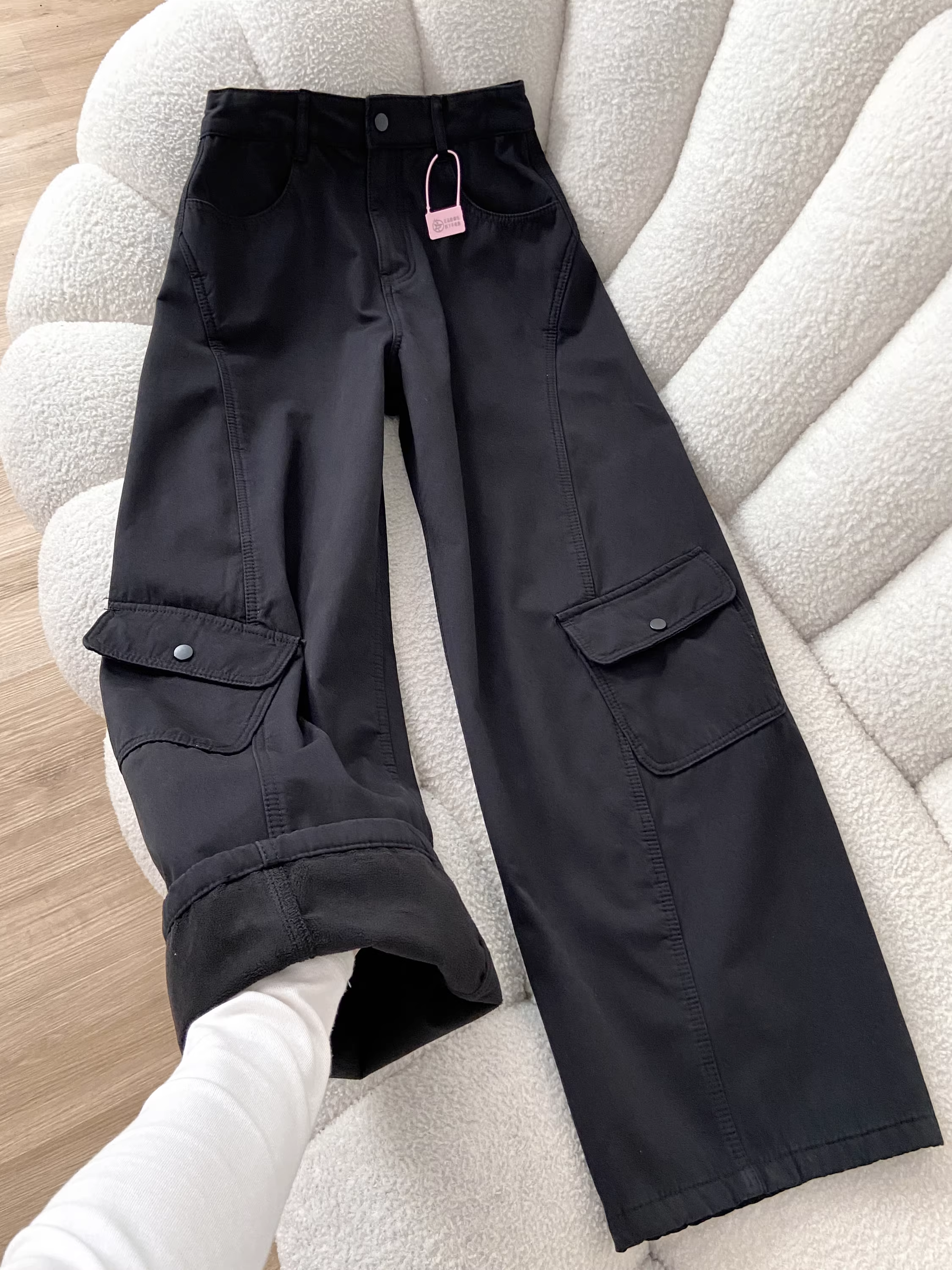 - Quần cargo ống rộng lót lông cừu đen La Chapelle dành cho nữ, kiểu dáng mới thu đông 2025, dáng thẳng phong cách Mỹ, size nhỏ nhắn