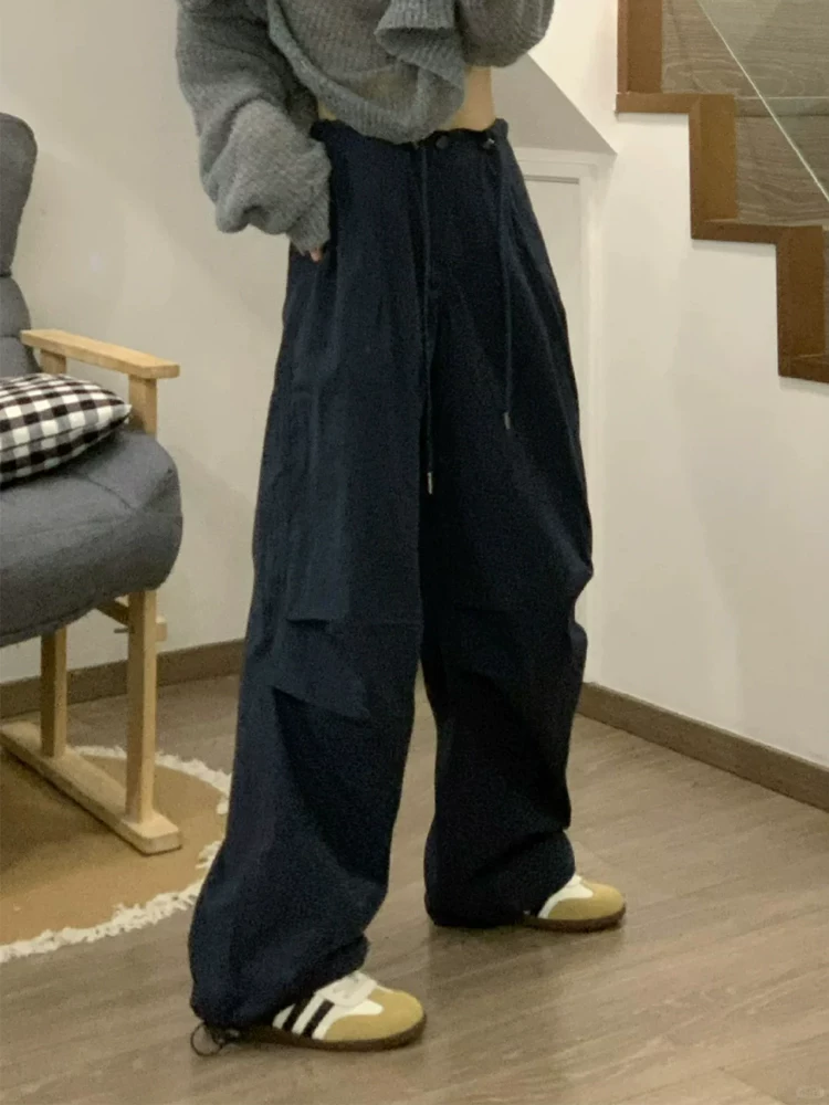Quần cargo ống rộng màu xanh hải quân dành cho nữ, kiểu dáng mỏng mùa hè, cỡ lớn, lưng cao, giảm béo, dáng quả lê, quần thể thao thông thường