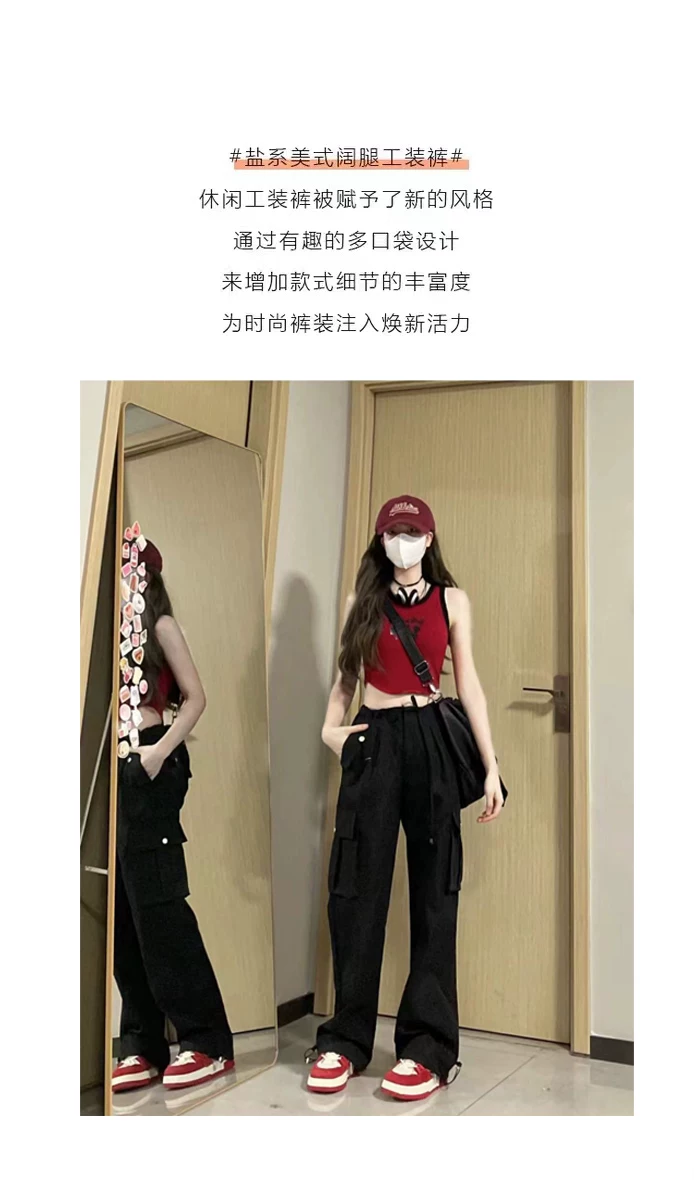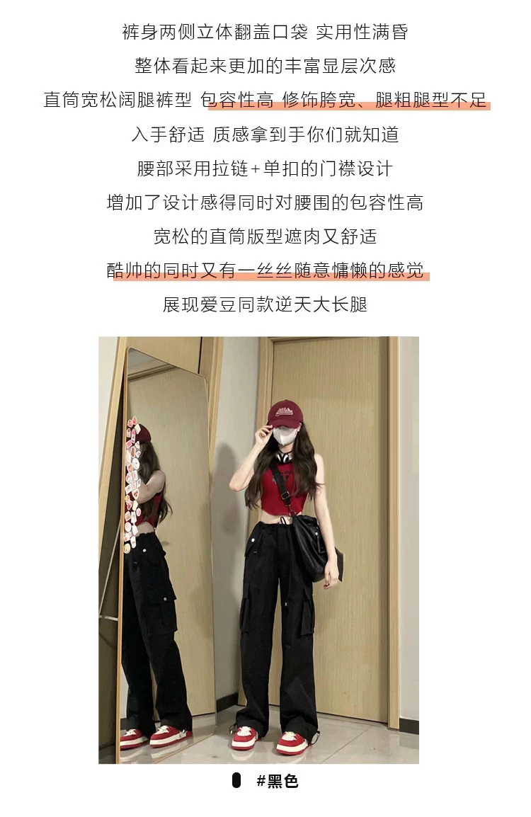 - Quần cargo ống thẳng màu đen dáng quả lê dành cho nữ, size lớn mùa thu, cạp cao, dáng rộng, tôn dáng, quần ống rộng thường ngày