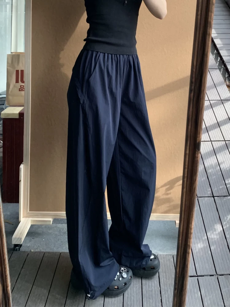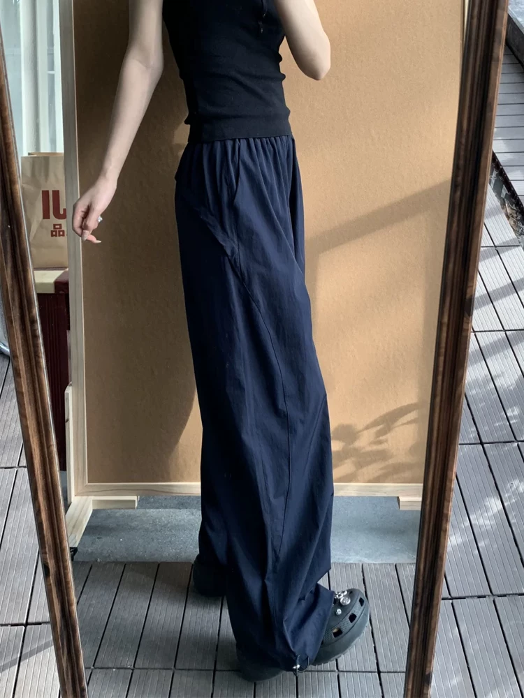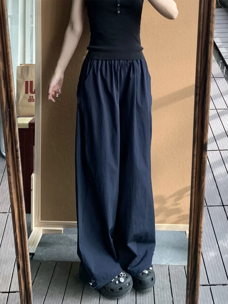 Quần cargo ống thẳng màu xanh hải quân dành cho nữ, phong cách cổ điển Mỹ, cỡ lớn mùa hè, lưng cao, dáng rộng, dáng suông, quần ống rộng thông thường.