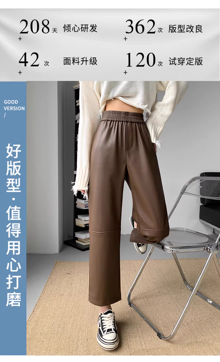 Quần da đen dành cho nữ, mùa thu đông, quần ống rộng ôm dáng, quần da PU, cạp cao, giảm béo, quần bootcut ngắn, quần thuốc lá ống thẳng.