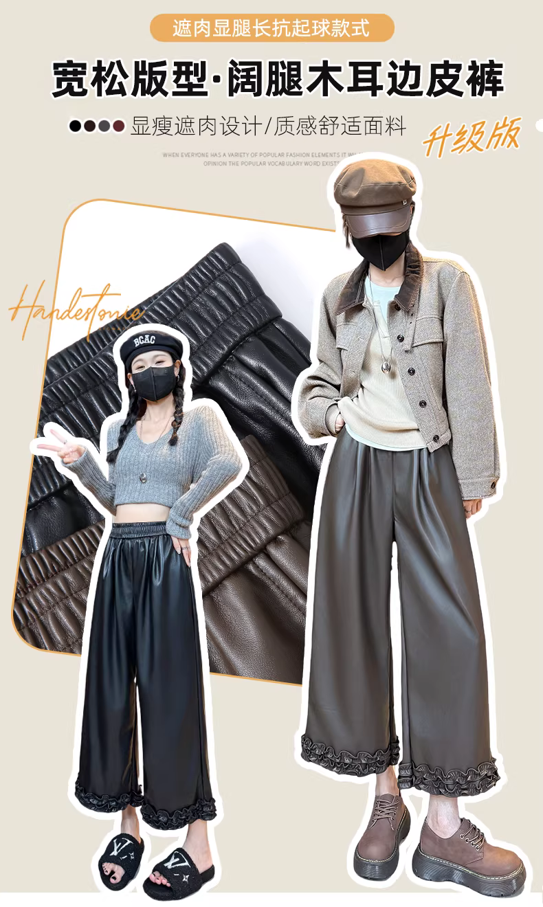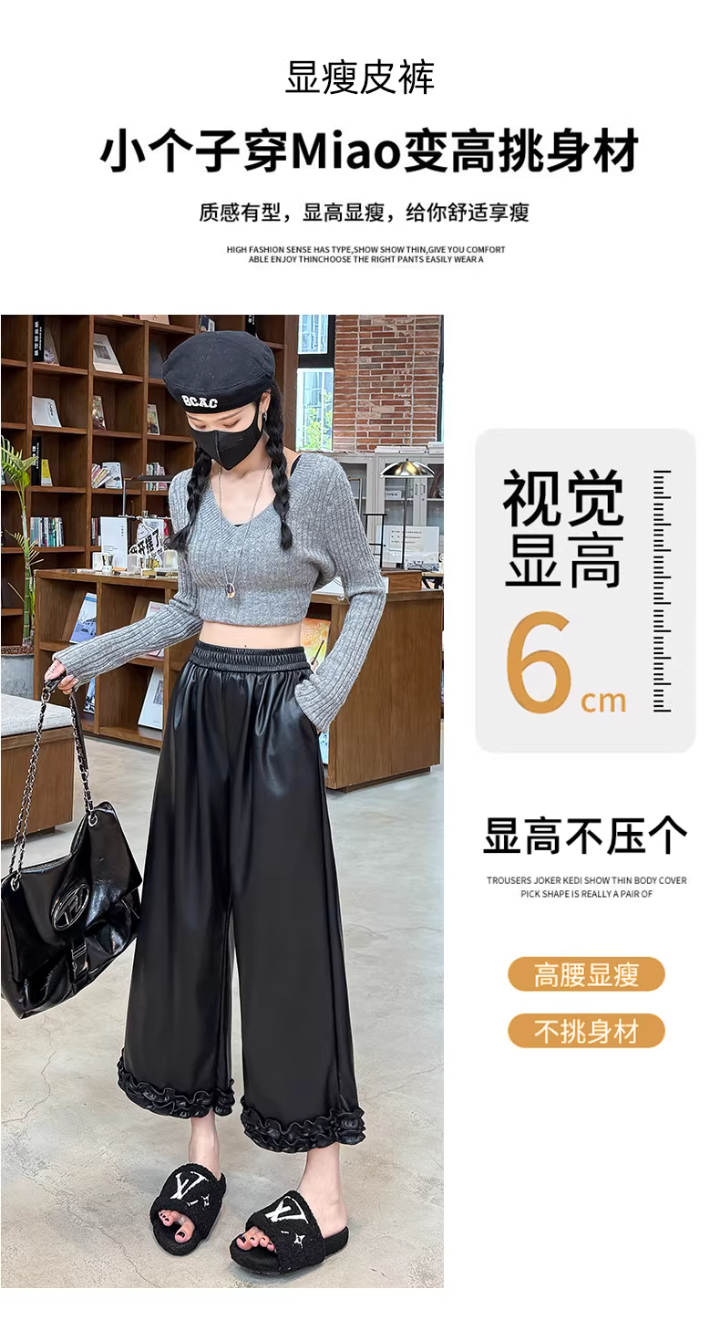 Quần da đen dành cho nữ, mùa thu đông, quần ống rộng ôm dáng, quần lửng, quần kiểu old money, quần ống đứng chín phần rất sành điệu.