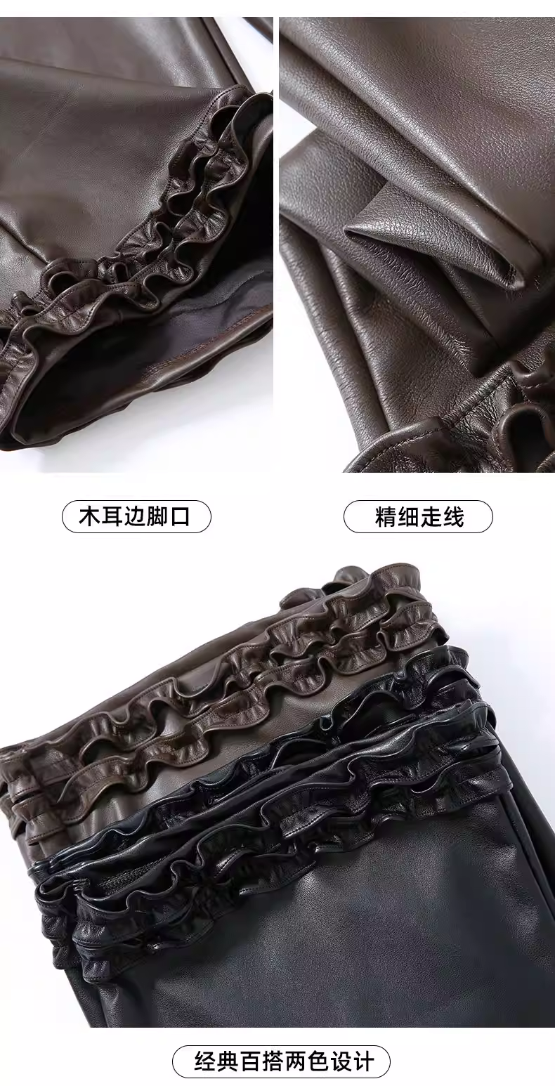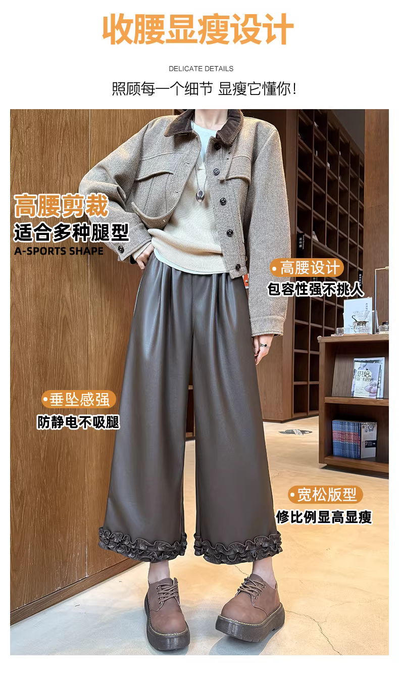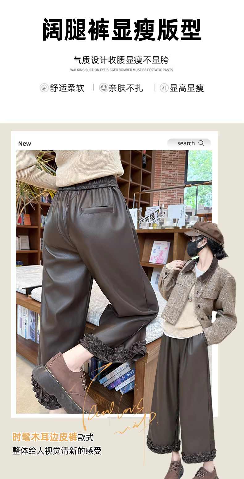 - Quần da đen dành cho nữ, mùa thu đông, quần ống rộng ôm dáng, quần lửng, quần kiểu old money, quần ống đứng chín phần rất sành điệu.
