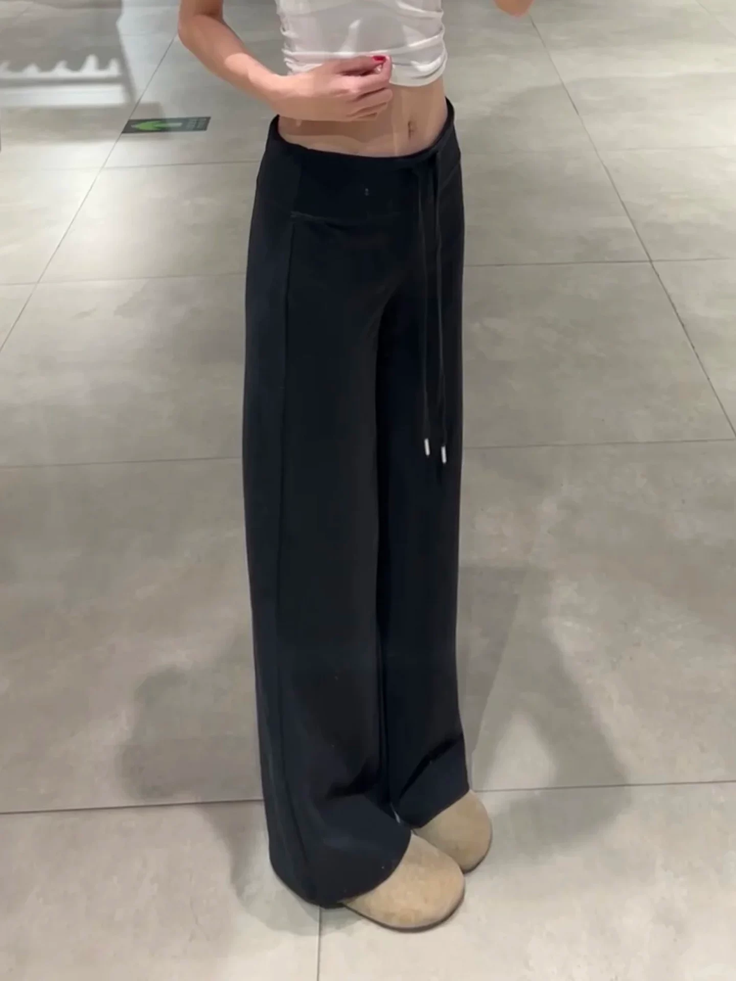 - Quần dài ống đứng cạp cao có dây rút màu đen dành cho nữ, phong cách mùa thu mới, cỡ lớn, dáng suông, quần thể thao ống rộng.