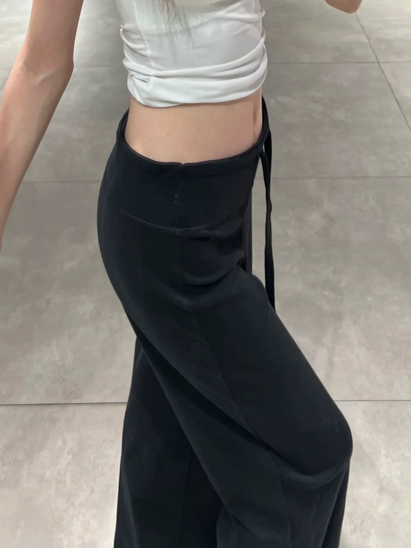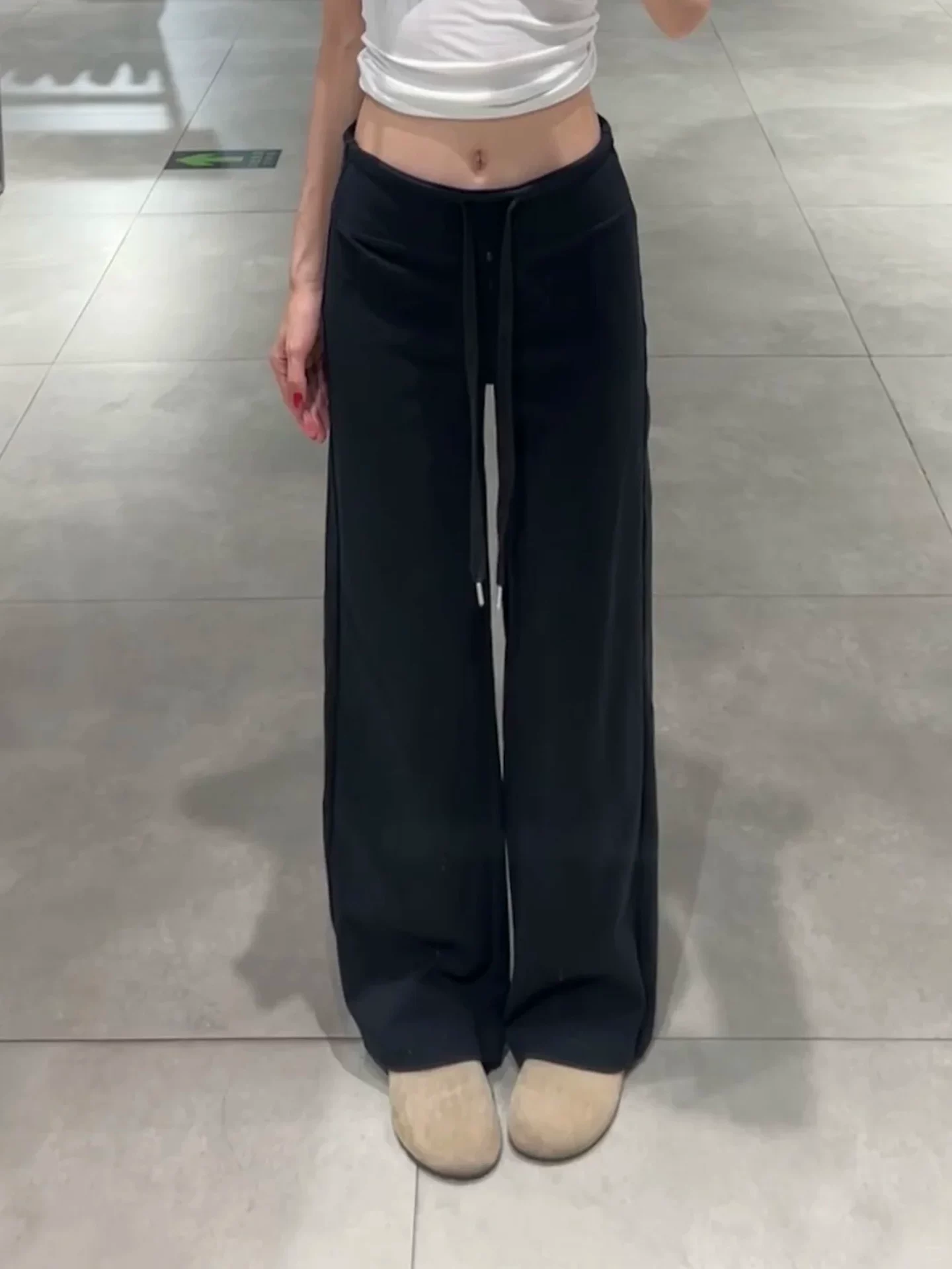 Quần dài ống đứng cạp cao có dây rút màu đen dành cho nữ, phong cách mùa thu mới, cỡ lớn, dáng suông, quần thể thao ống rộng.