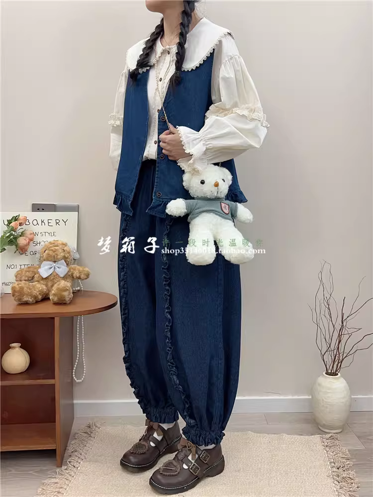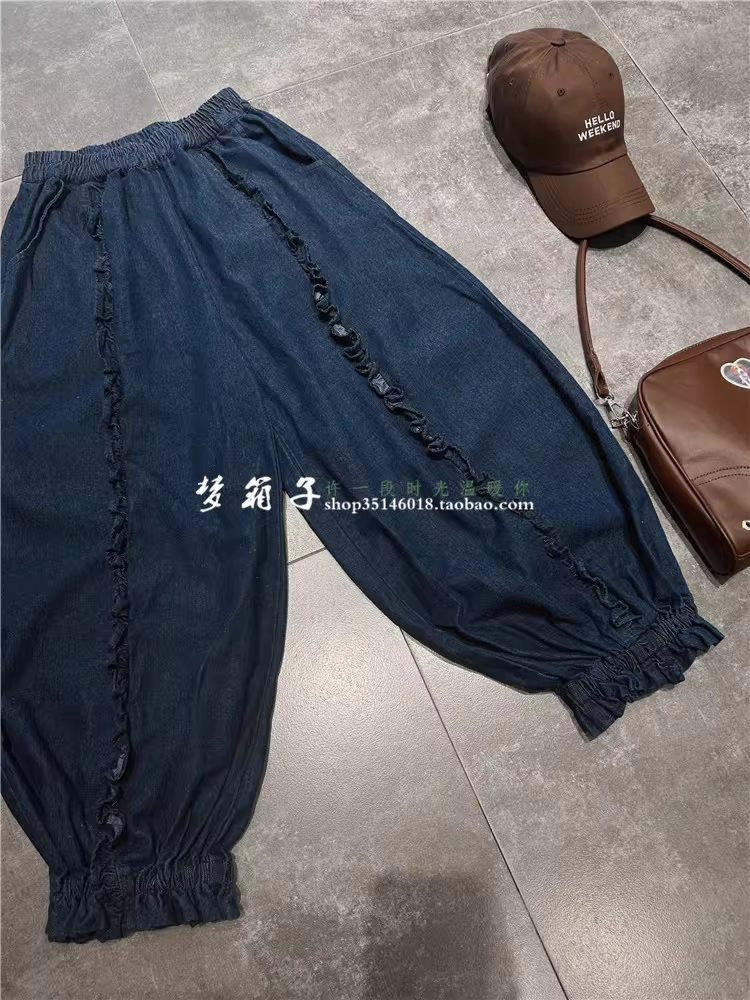 Quần đèn lồng phối vải xếp ly ngọt ngào mùa xuân 2024 Dream Box, lưng thun, dáng rộng, tôn dáng, quần jean 9 phần