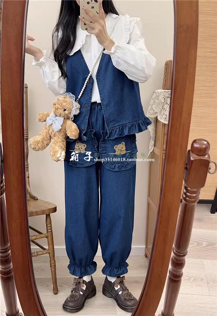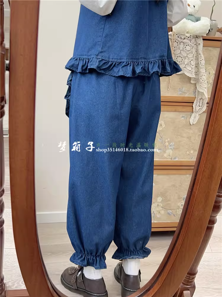 棉质牛仔面料,小熊刺绣木耳边口袋,九分灯笼裤
