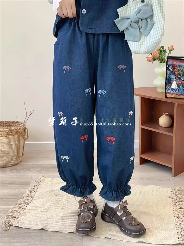 Quần đèn lồng thêu nơ mùa thu mới Dream Box 2024, cạp chun, dáng ôm, xếp ly, chất liệu denim dành cho nữ