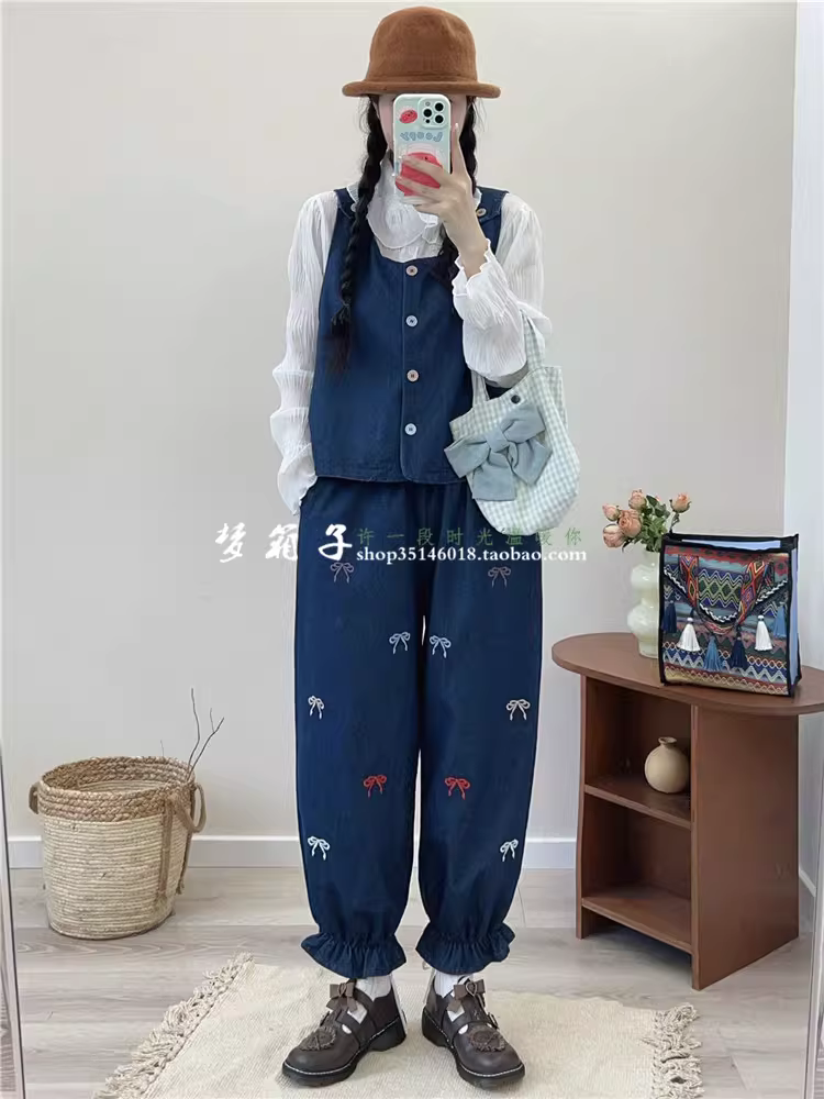 - Quần đèn lồng thêu nơ mùa thu mới Dream Box 2024, cạp chun, dáng ôm, xếp ly, chất liệu denim dành cho nữ