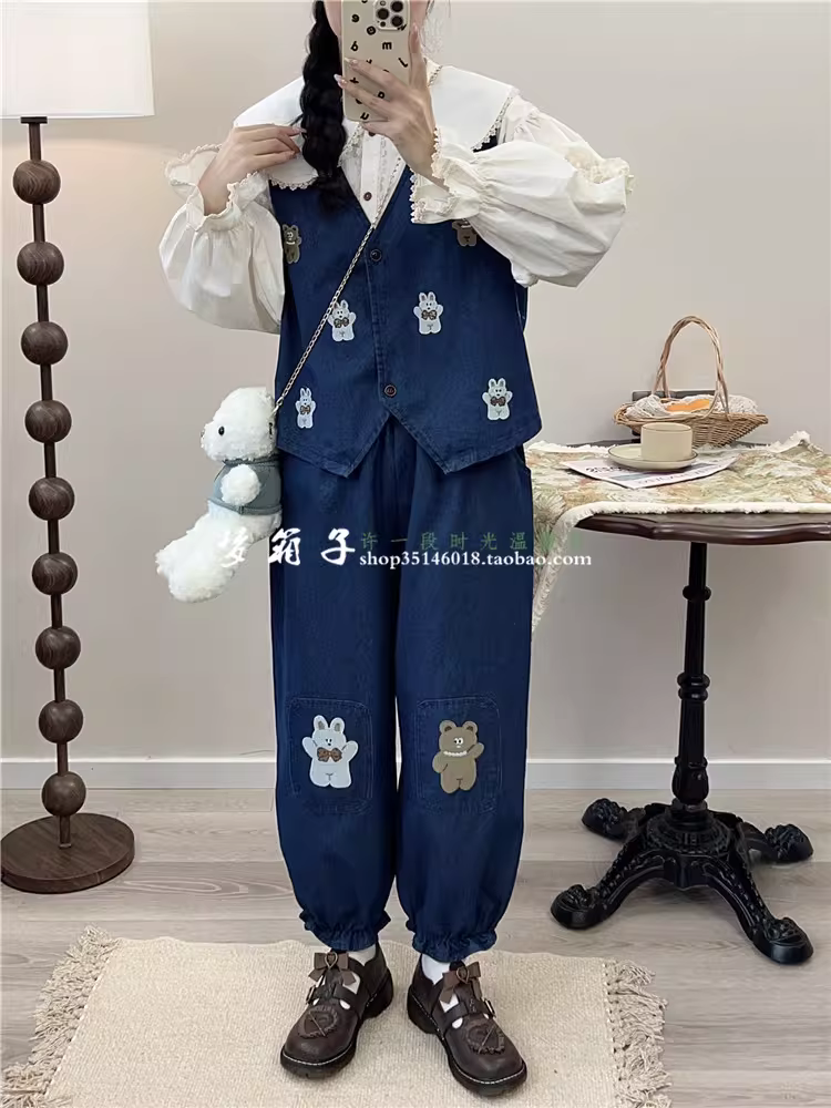 Quần đèn lồng xếp ly thêu hình gấu và thỏ kiểu mới Xuân 2024 Dream Box, lưng thun, dáng rộng, tôn dáng, màu trơn, chất liệu jean