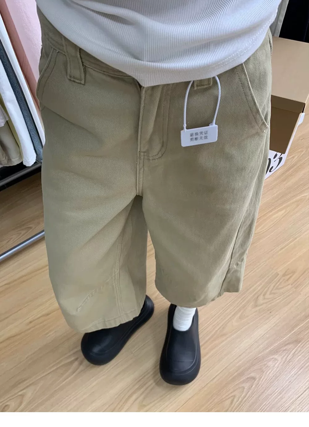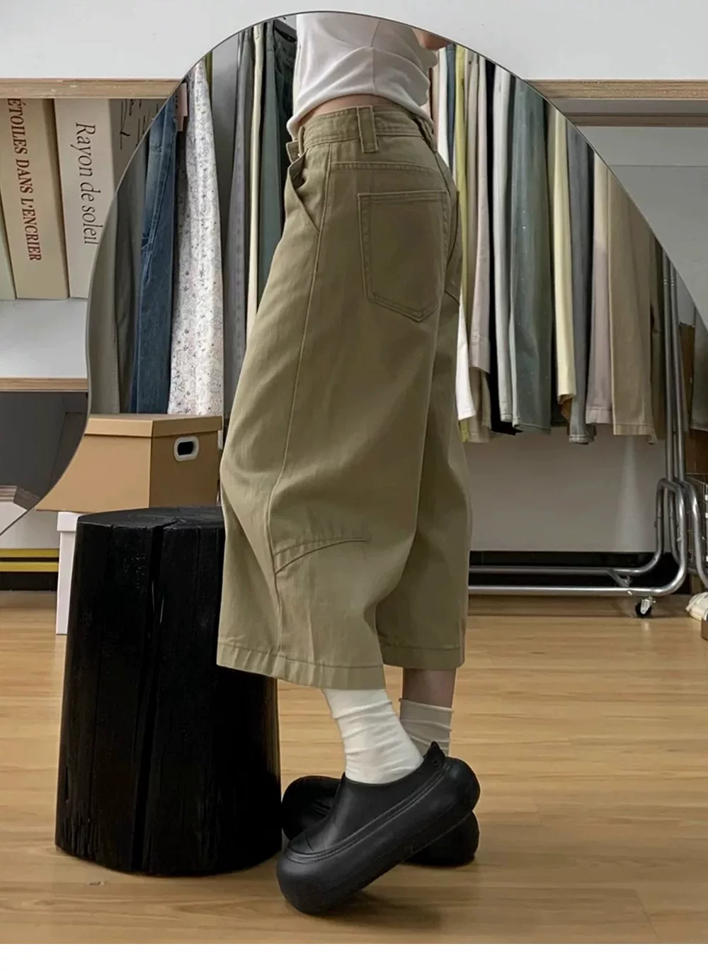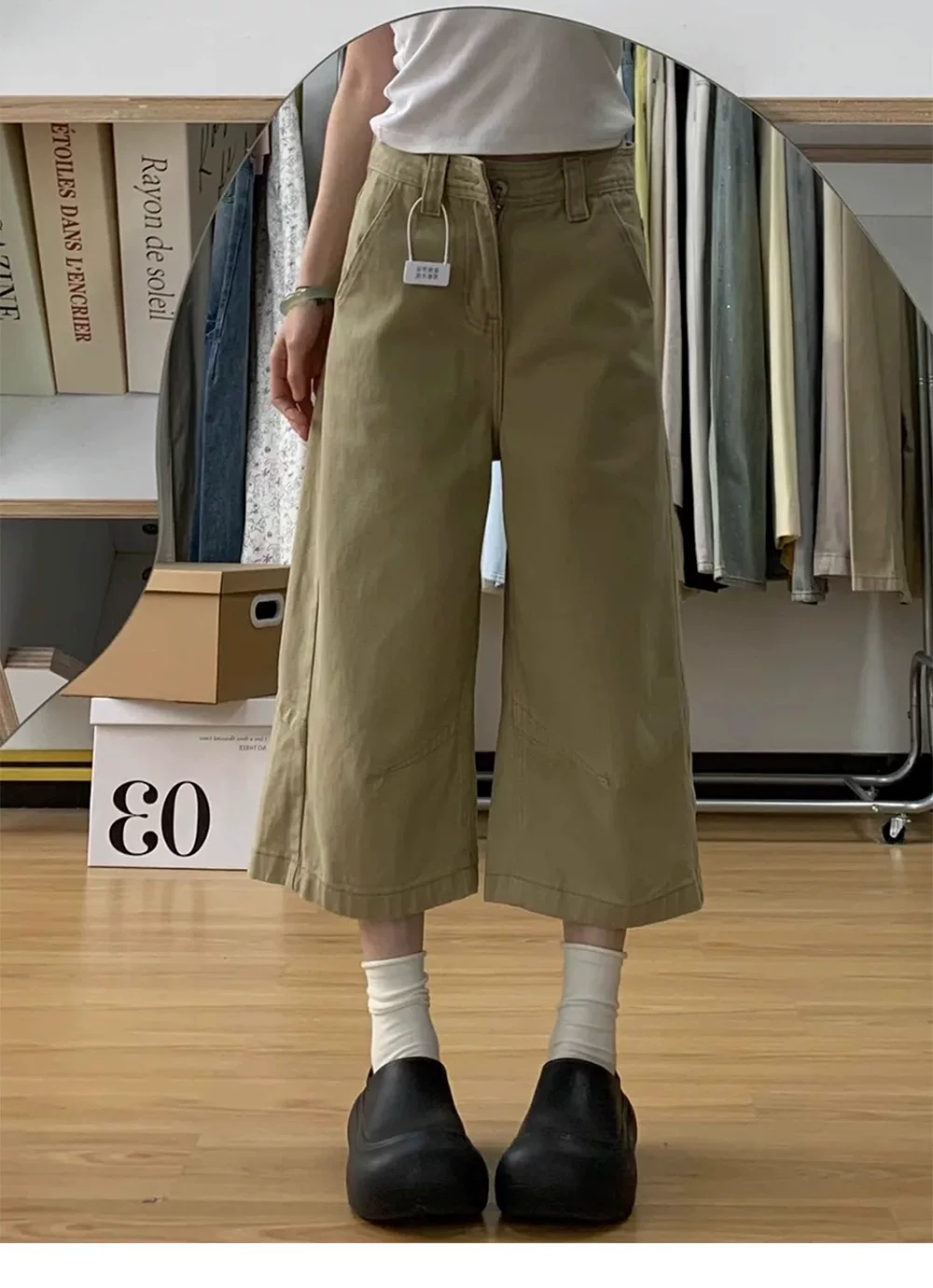 - Quần denim crop màu kaki siêu sành điệu dành cho nữ, kiểu dáng mùa hè mới, cỡ lớn, lưng cao, tôn dáng, che hông, quần ống rộng dài đến giữa bắp chân.