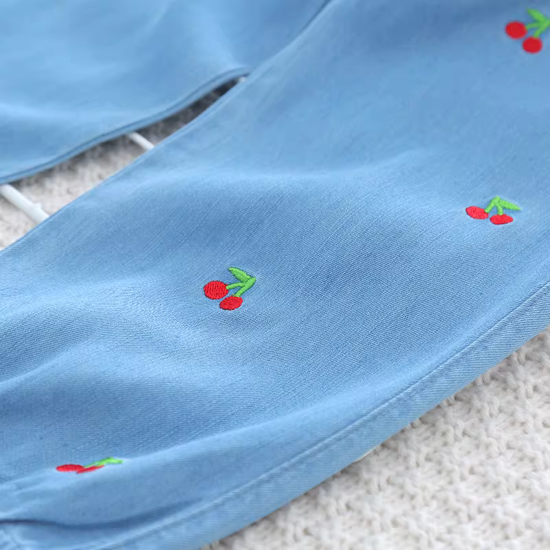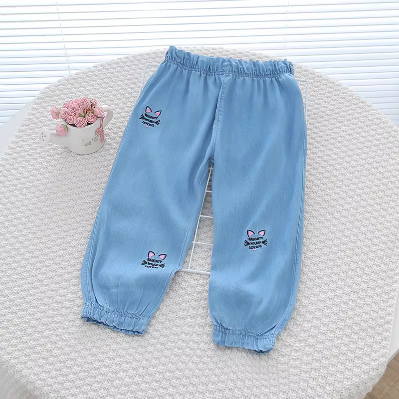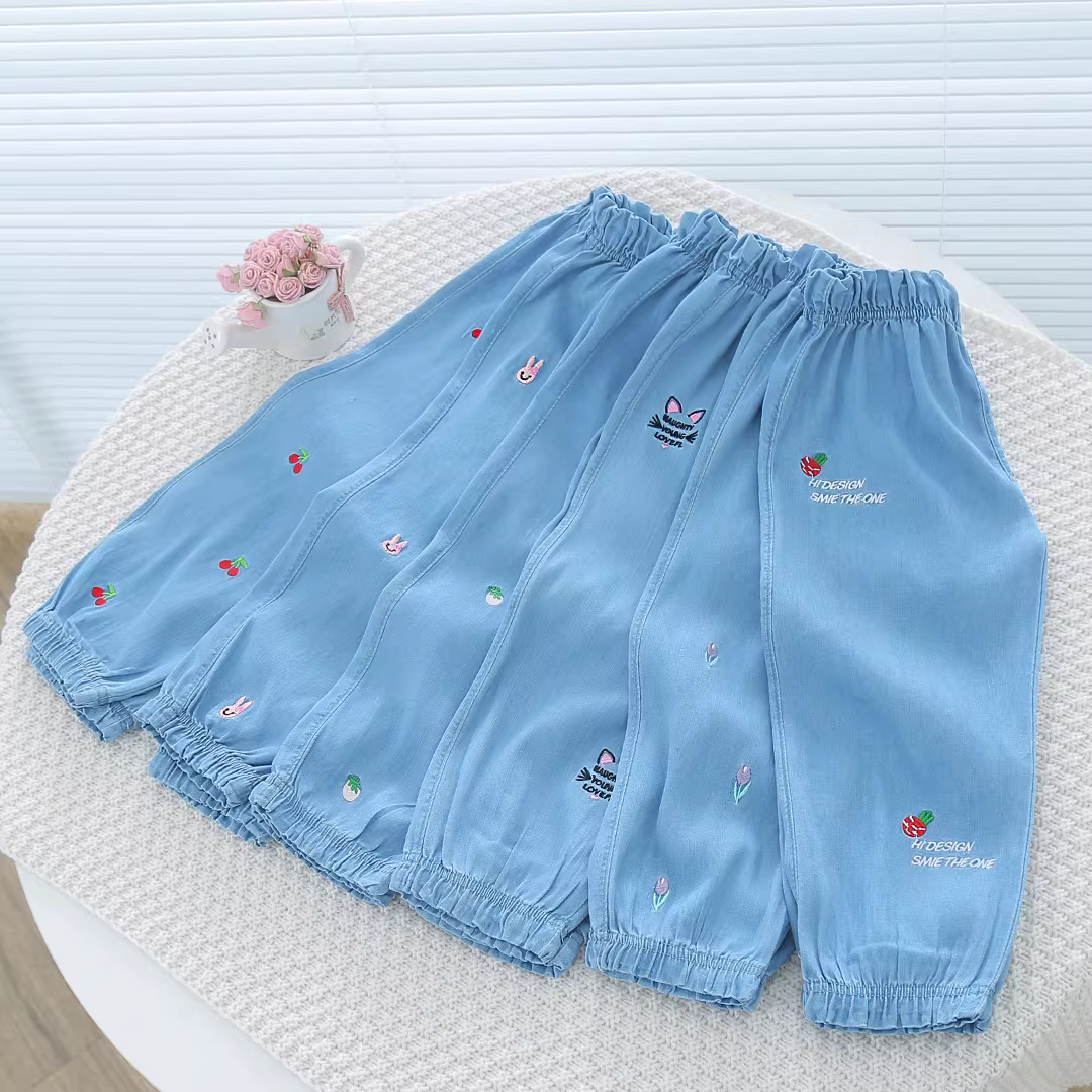 - Quần denim Tencel trẻ em, quần chống muỗi chín phần, kiểu mới hè 2025, quần dài thun thêu mỏng cho bé gái