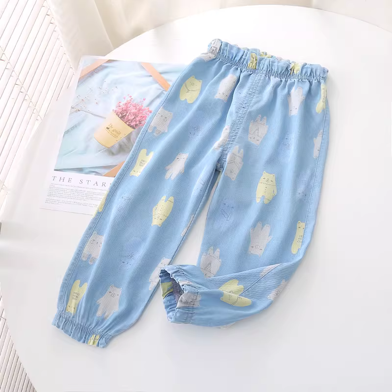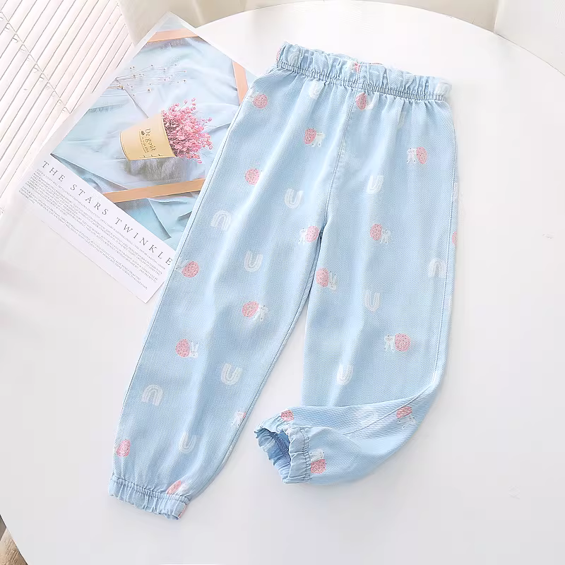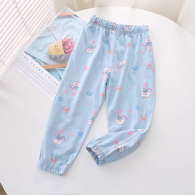 - Quần denim Tencel trẻ em, quần chống muỗi chín phần, kiểu mới hè 2025, quần đèn lồng in họa tiết dày dặn cho bé gái