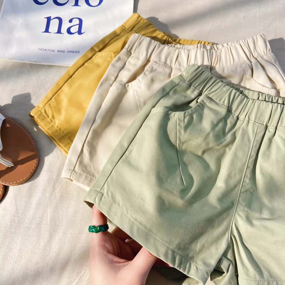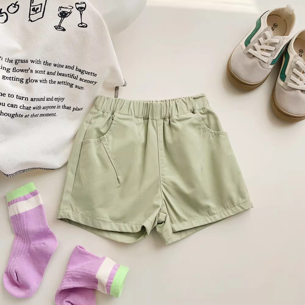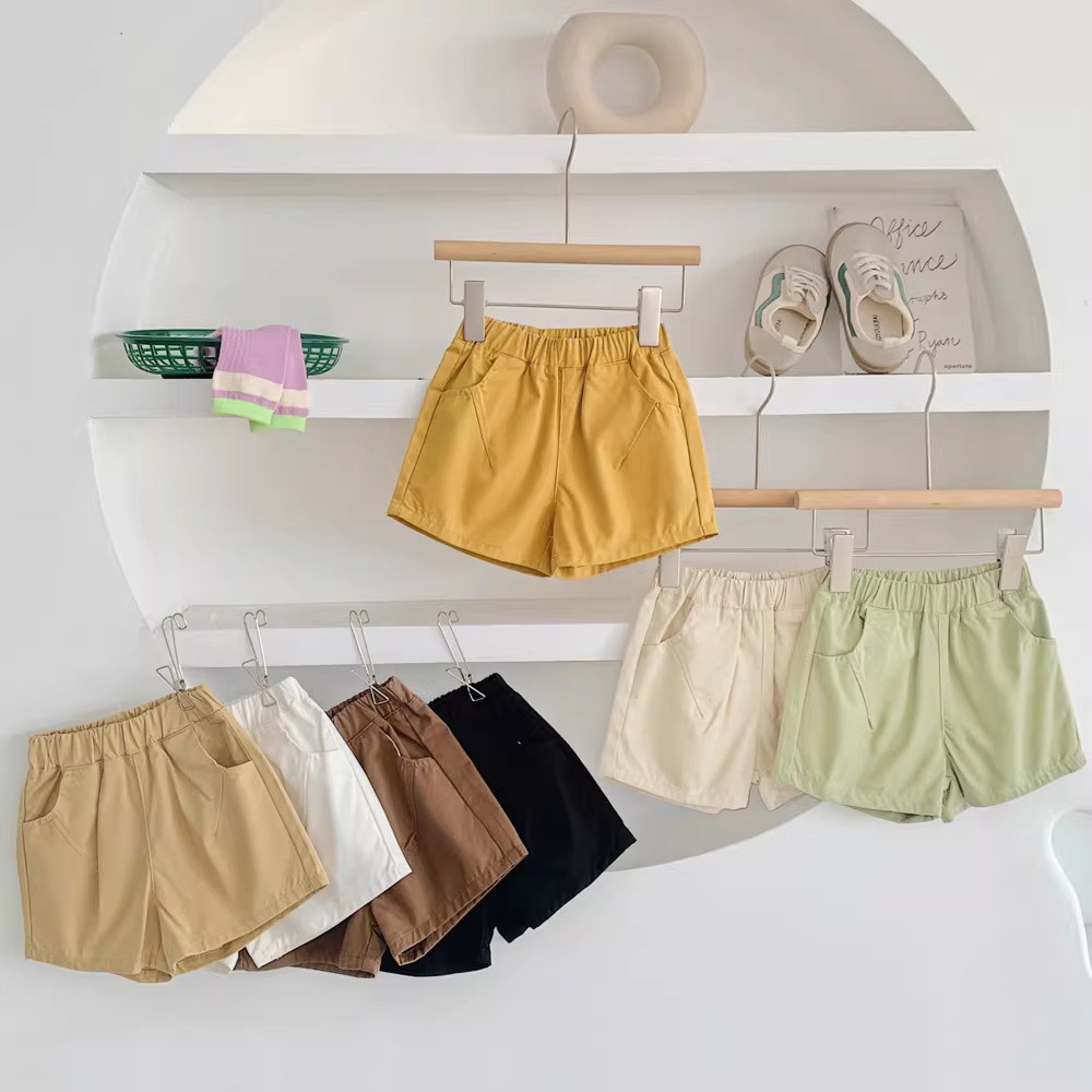 Quần đùi cotton trẻ em mùa hè 25 mẫu mới quần cargo năng động đa năng bé trai bé gái chất liệu mỏng màu trơn dài đến đầu gối