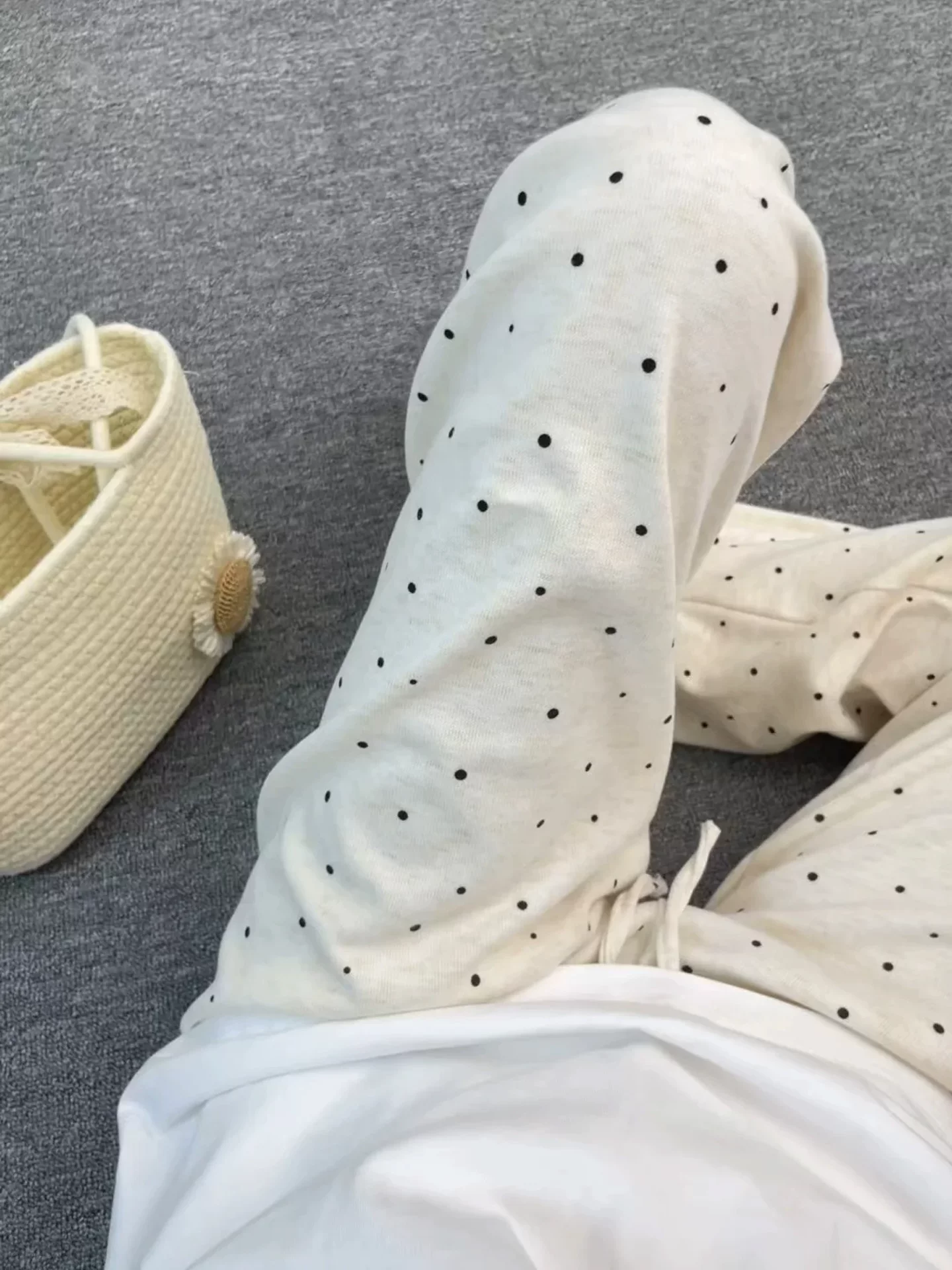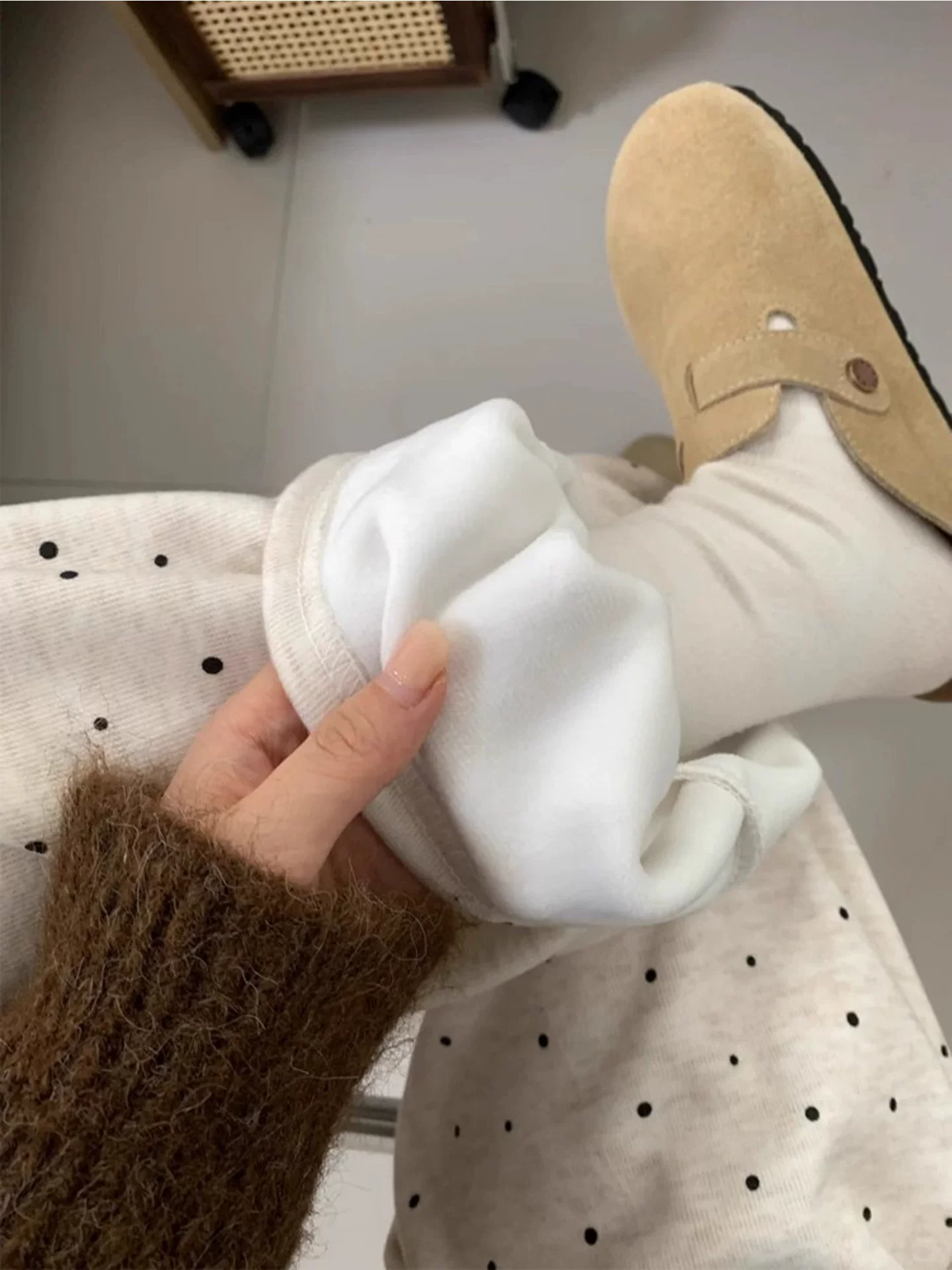 Quần gạo chấm bi màu trắng nhạt dành cho nữ, mùa thu đông, lót lông cừu, dày dặn, cỡ lớn, lưng cao, dáng rộng, quần ống rộng, phong cách giản dị.
