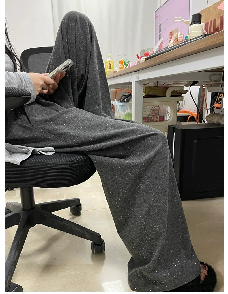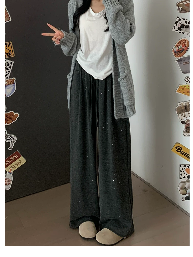 - Quần gạo màu xám đậm dành cho nữ, kiểu dáng mùa thu mới, cỡ lớn, lưng cao, dáng rộng, mềm mại, tôn dáng, quần ống rộng lười biếng.